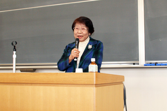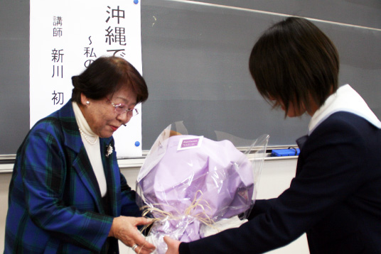 元ひめゆり学徒隊の新川初(あらかわ はつ)さん(84)=大阪府豊中市=を招いて、M4とY1を対象とした「2010年度中学校人権講演会」が3日、本校の大講義室で行われました。