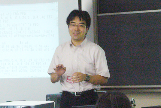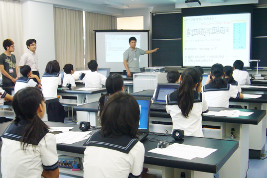本日は、准教授門田暁人先生とアカデミックボランティアメンバーの学生さんたちによる、「音楽をプログラミングしよう」の講座が地学実験室で行われました。