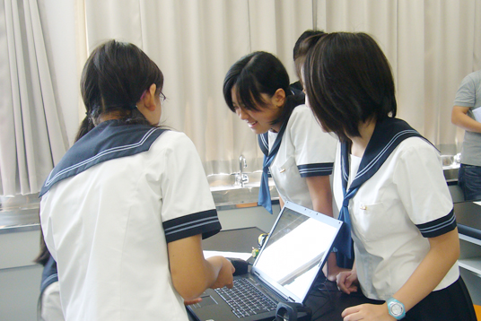 先生とアカデミックボランティアの学生の方々の大変わかりやすい講義で、最初はちょっと緊張気味だった生徒たちも、課題をこなすうちにすっかり夢中になり、真剣そのもの。 わからないところを先生や学生さんたちに親切にレクチャーしていただいたり、友達どうしで教えあったり、銃声の音色が気に入って実験室を銃声だらけにしたり…と笑顔あふれる大変楽しい授業で、たっぷり3時間の講義もあっと言う間に終わりました。