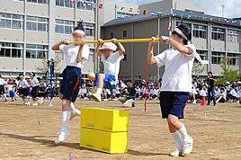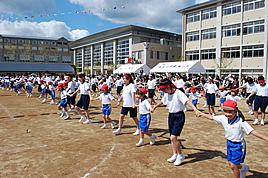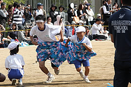 また、学年を超えて協力してゴールを目指す競技の中でも目玉といえる、「台風の目」では、小学生から高校生までの生徒達が3人1組でタッグを組み、リレー形式で障害物をクリアしていきます。途中、障害物の箱を倒してしまうこともありましたが、見事に協力しあって最後まで走り抜けました。 最後のプログラムのアニメ音頭では、PPの園児やPの生徒達が恥ずかしがっていたMやYの生徒を引っ張す様子で、大きな輪になって踊りを楽しんでいました。