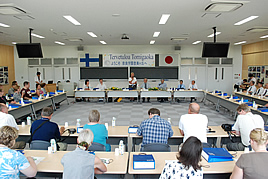 フィンランド教師連盟視察団の方々が来校されました 2009.07.16(木) Tweet 小・中・高12年一貫教育を実践している本校の視察のため、フィンランド教師連盟視察団の方々が来校されました。また、東京大学特任講師の村沢義久氏による講義が行われ、日本のみならず世界の技術の進歩についてお話頂きました。視察団の方々には本校の授業風景もご参観頂きました。高校、中学の数学や科学の授業の様子、他にも小学校の特徴ある教室を視察され、開放的な教室に感心されていたご様子でした。その後大会議室において、奈良の名物を使用したお弁当を頂きながら、お互いの国における教育の現場の違いなどに関する質疑応答を行い、相互理解を深めるきっかけとなりました。 « 【M4】「きっづ光科学館ふぉとん」において理科実習を行いました 運動会を行いました »