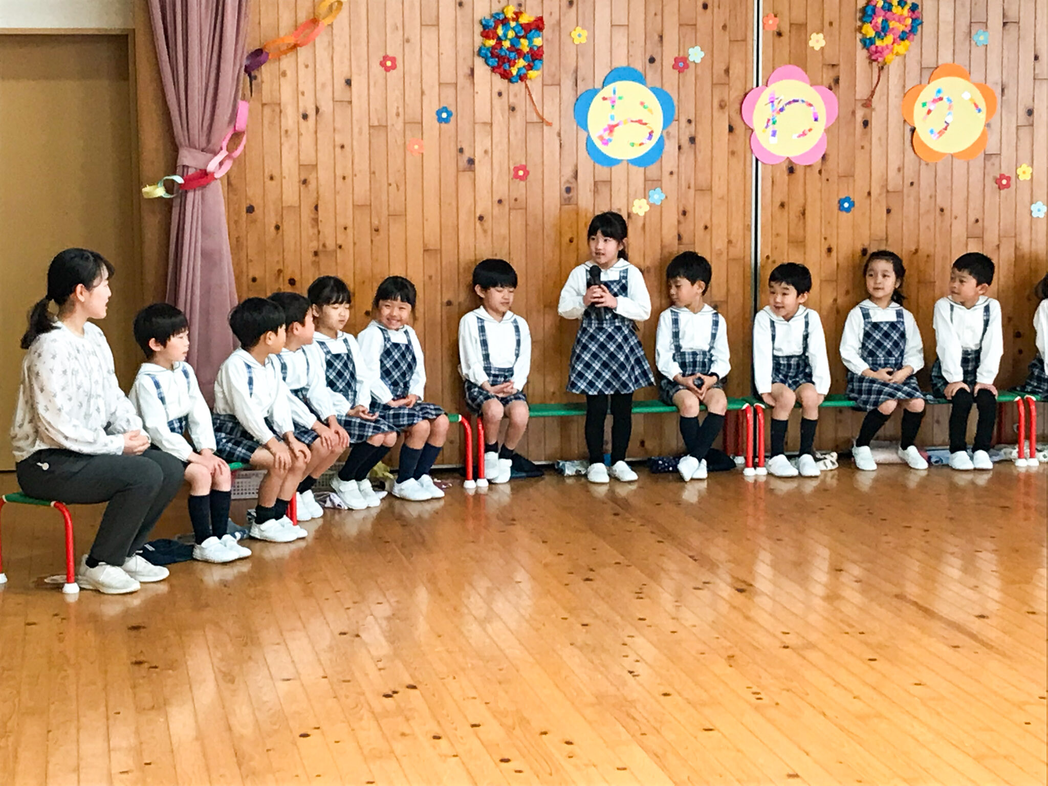 拍手で迎えられた年長組の子どもたちは、お名前と小学校でがんばりたいことを一人ずつ自己紹介してくれました。