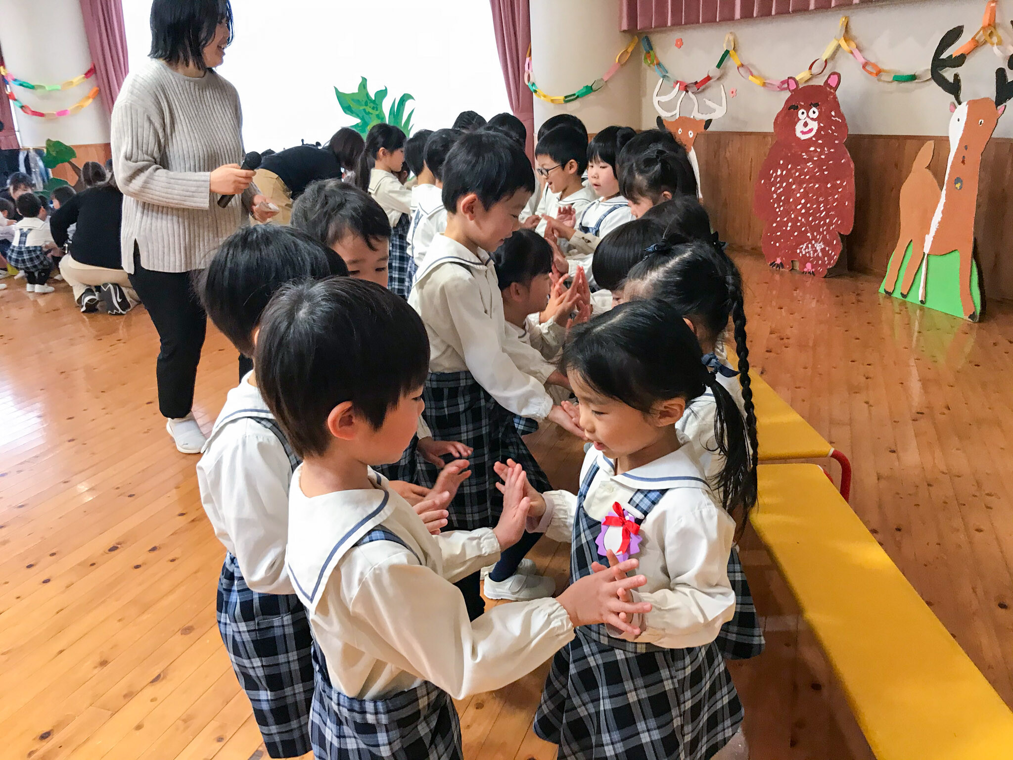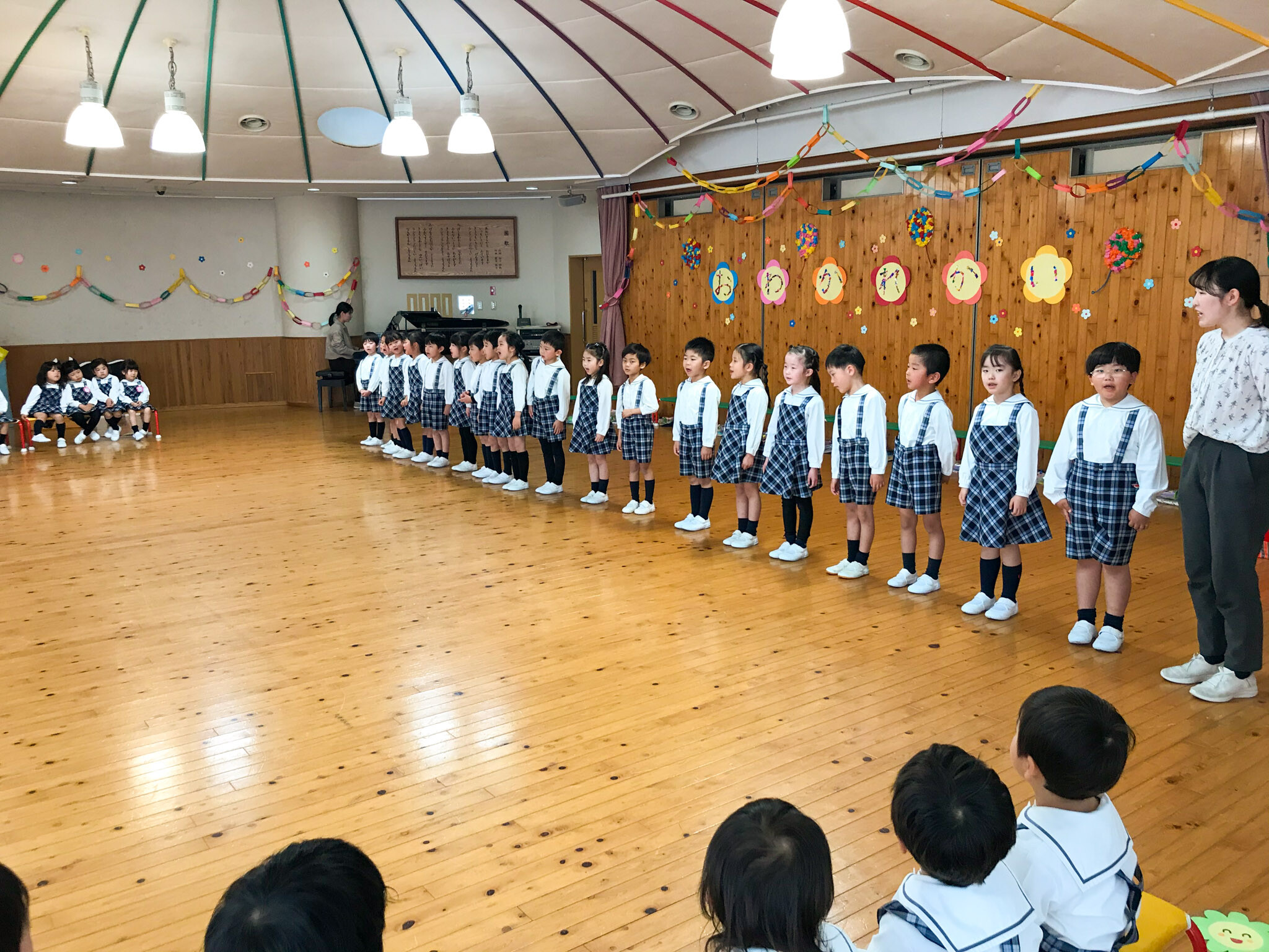 次に年中・年少組の子どもたちから、おにいさん・おねえさんに感謝のメッセージ・歌とプレゼントの贈呈。年長組の子どもたちは、そのお礼にと、歌とメッセージ、それから素敵な手作りネックレスをプレゼントしてくれました。いちご組のお友達からも、かわいいプレゼントがありました。最後に先生方から歌のプレゼント。曲の終わりにはみんなが手をつないで、一つの大きな輪ができあがりました。