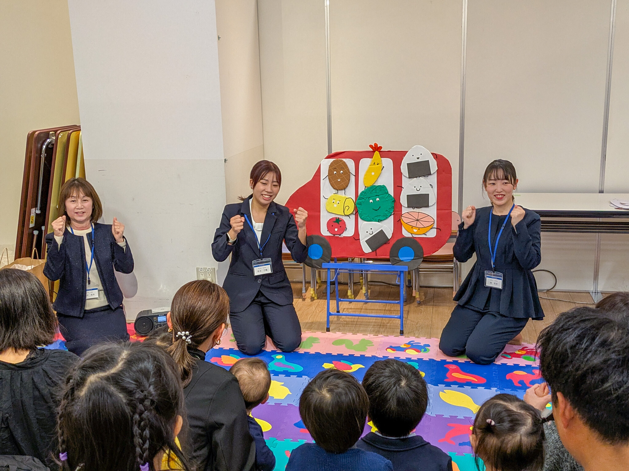 続いて、私立幼稚園合同の体験イベント。最初に奈良学園幼稚園の教員が、「おべんとうバス」のパネルシアターなどを披露しました。その後、幼稚園や小学校、幼児教室の先生方が、様々な体験を用意して、参加した子どもたちに楽しんでもらいました。