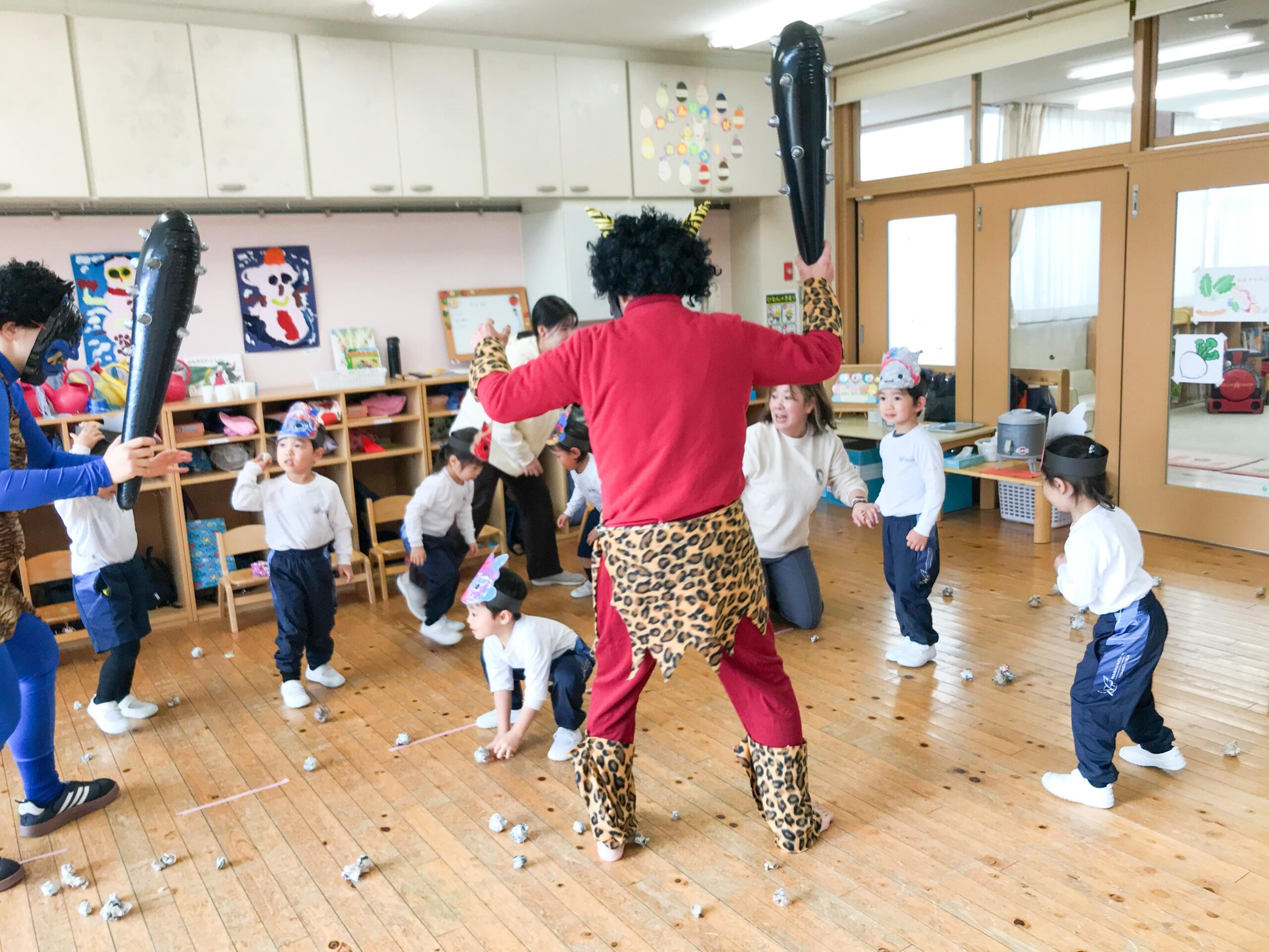 今年は赤鬼と青鬼の2匹の鬼が、奈良学園幼稚園の園内で大暴れしたようです。逃げながら、新聞紙や薄紙で作っておいた豆を、鬼にめがけて投げつける子どもたち。みんなで勇気を振り絞って立ち向かい、無事に鬼退治をすることができました。