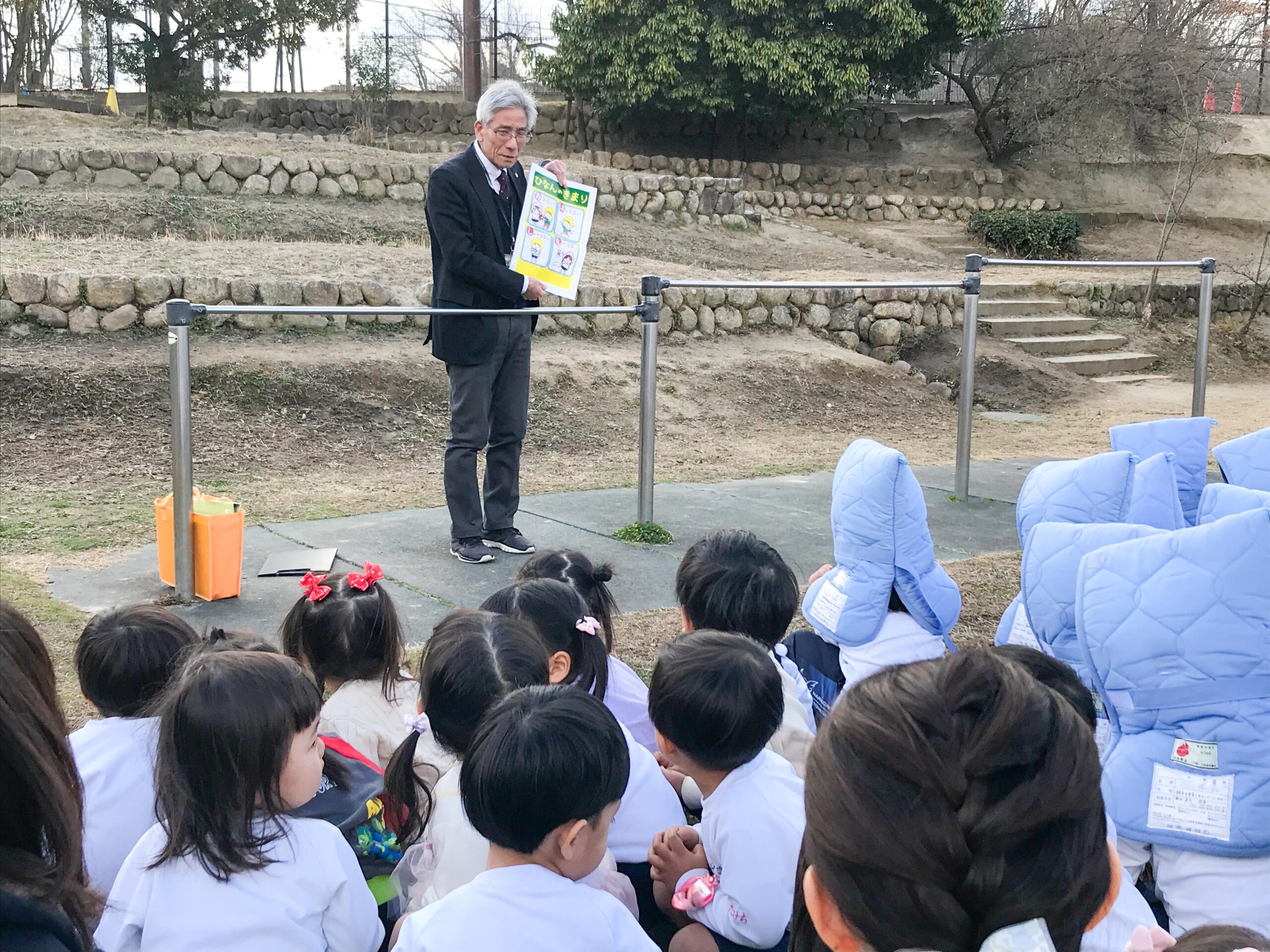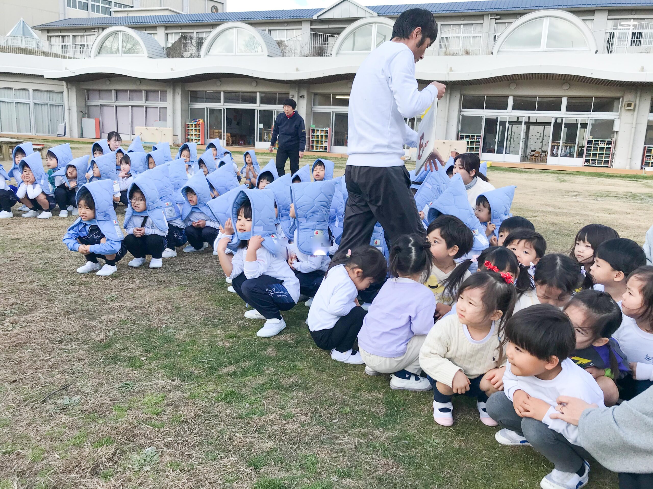 この冬も、各地で地震が起きています。地震発生直後の姿勢の取り方を繰り返し練習し、年少組から上の学年は、防災頭巾の使い方なども指導してきました。