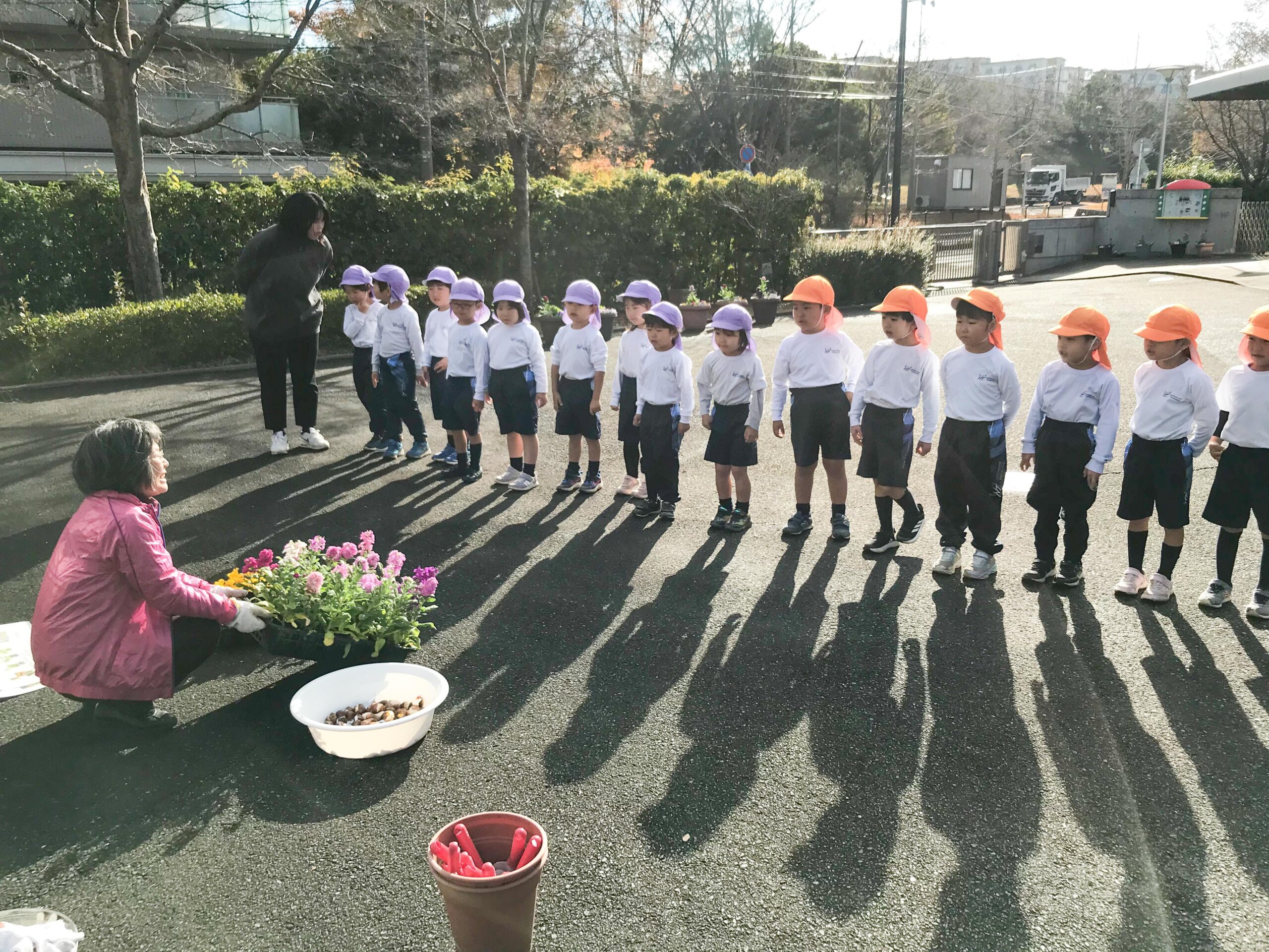 12月18日(木)、高岡先生に今回もご準備いただいて、コスモスを育てていた場所に花苗などを植えました。