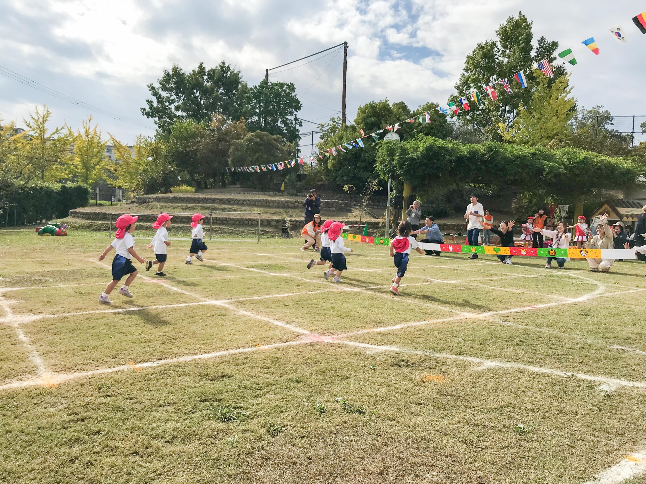 今年度から2歳児満3歳児保育いちご組のお友達も加わって、さらに華やかな運動会になりました。入場行進や開会式での「おはようございます!」のあいさつから、子どもたちは元気いっぱいです。準備体操から始まり、各学年のかけっこ、そして中盤最大の見所である年長組のマーチングと年中組のフラッグ。年少組も加わって全園児のコラボを披露しました。お家の方からの大きな拍手をもらい、大満足の子どもたちです。