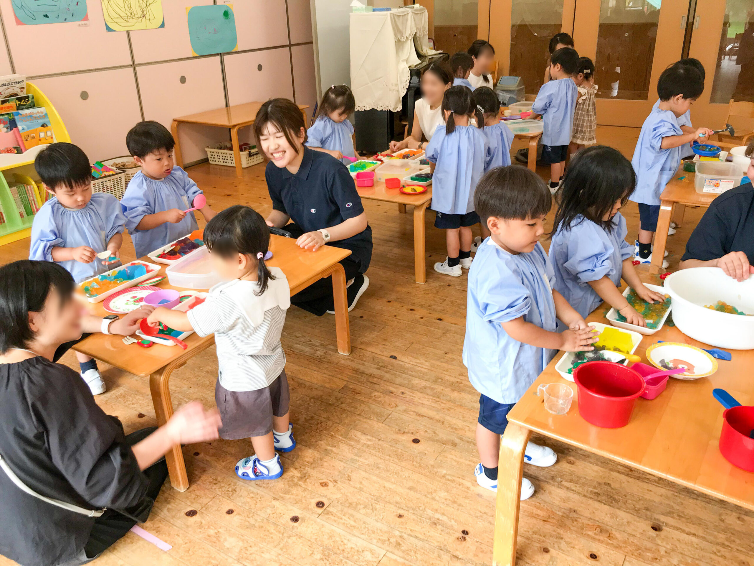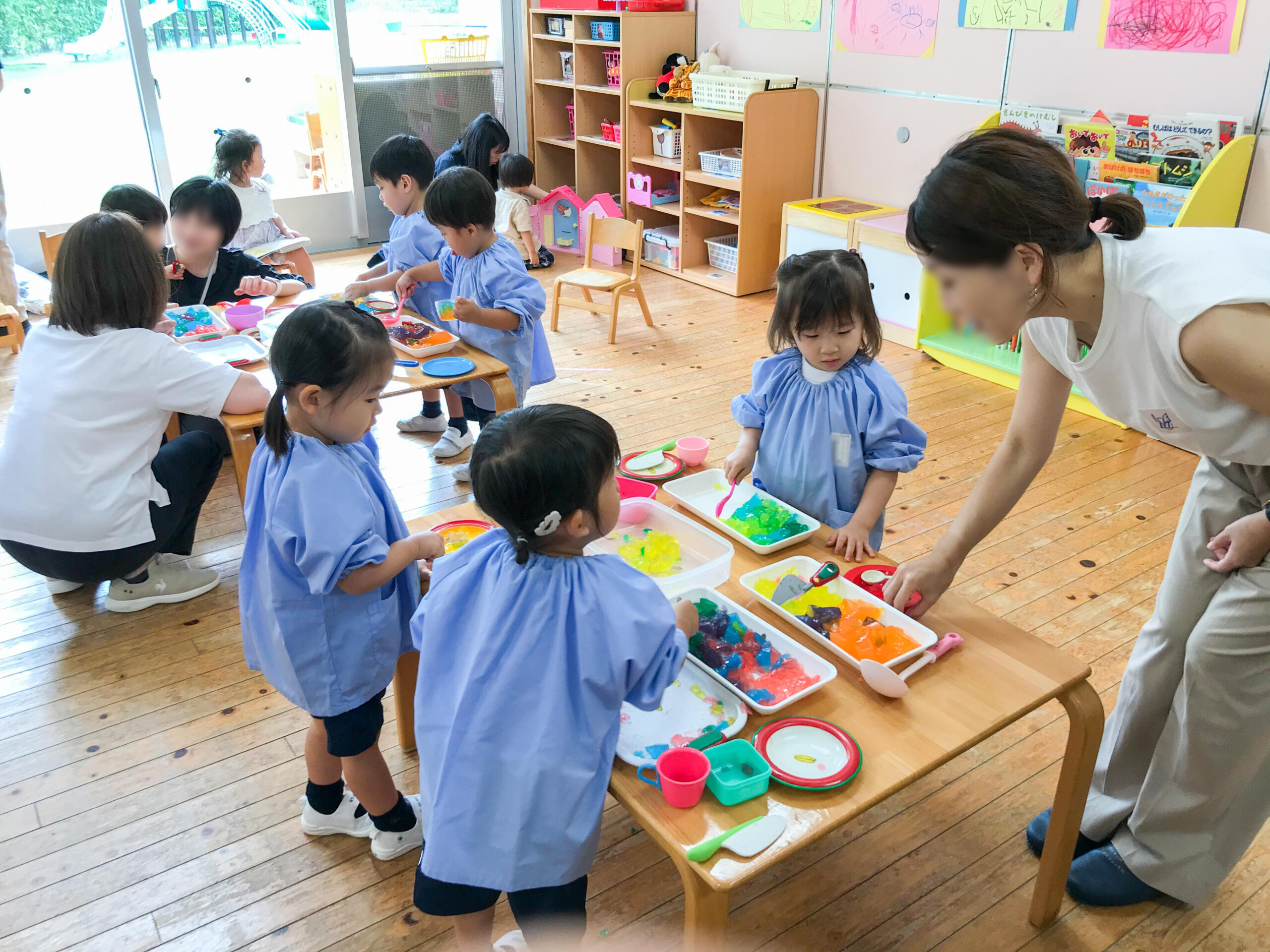 笑顔がすてきなお友達と、歌を歌ったり手遊びをしたり、寒天遊びでひんやりした感触を味わったりして、楽しく過ごすことができました。