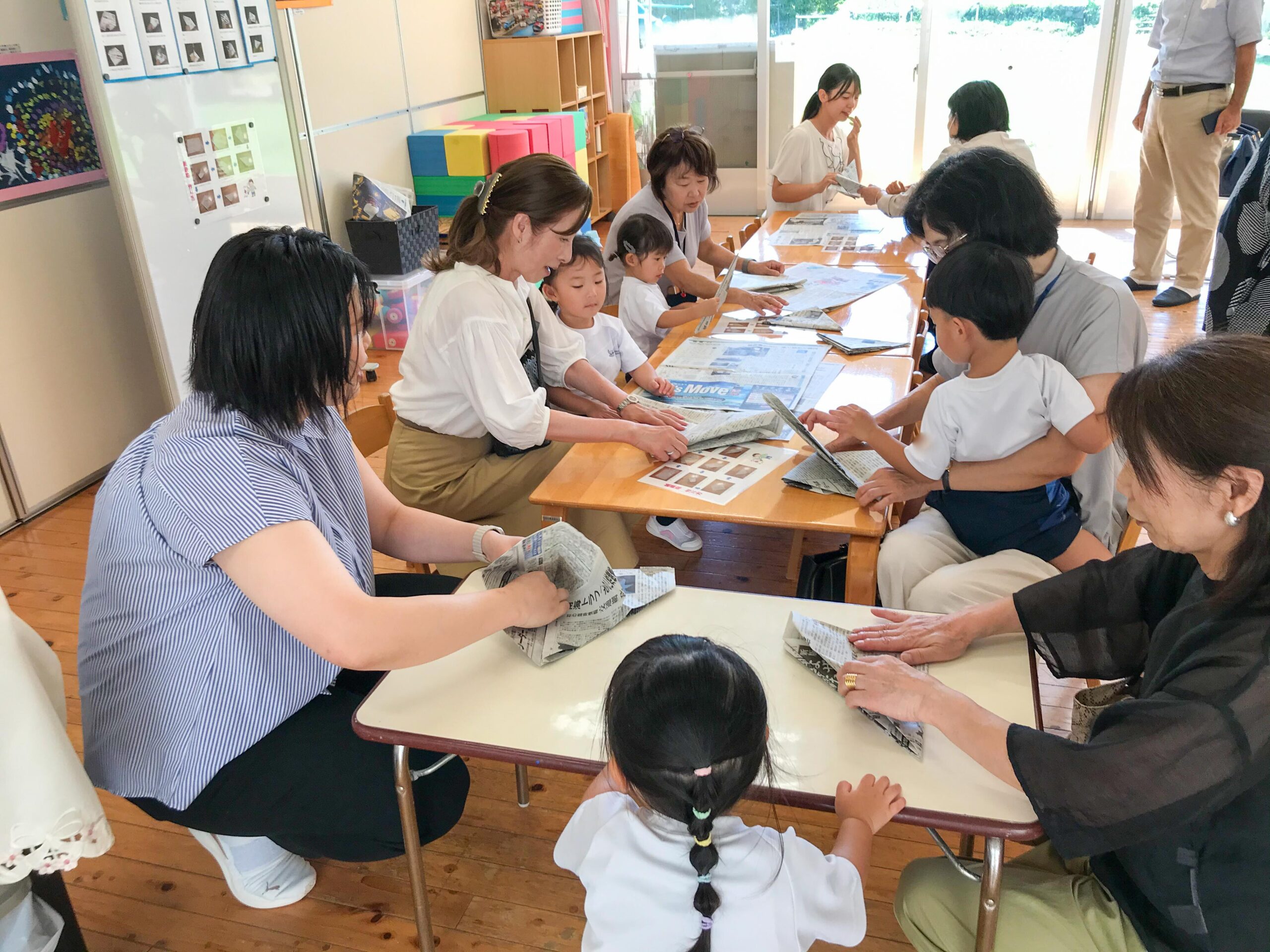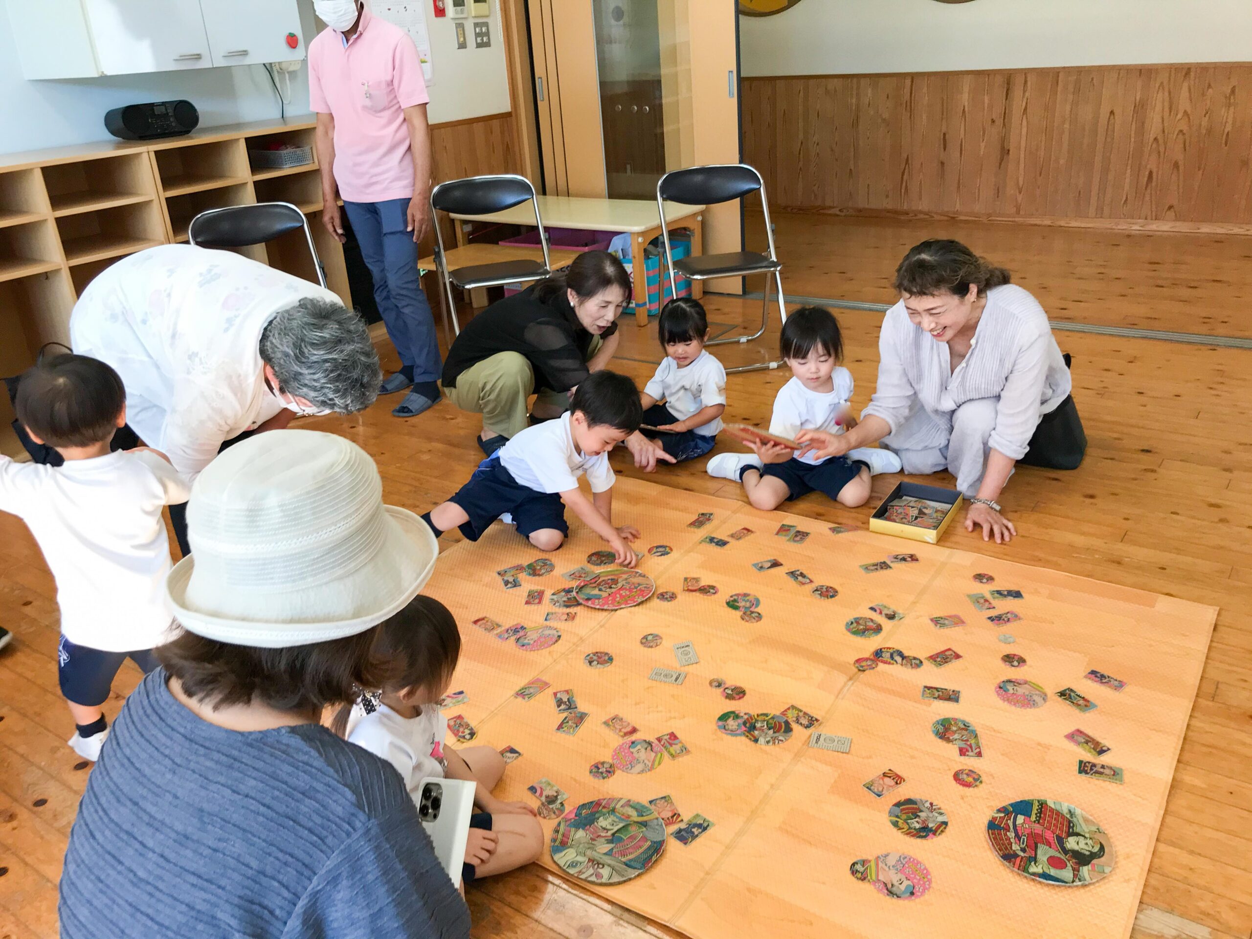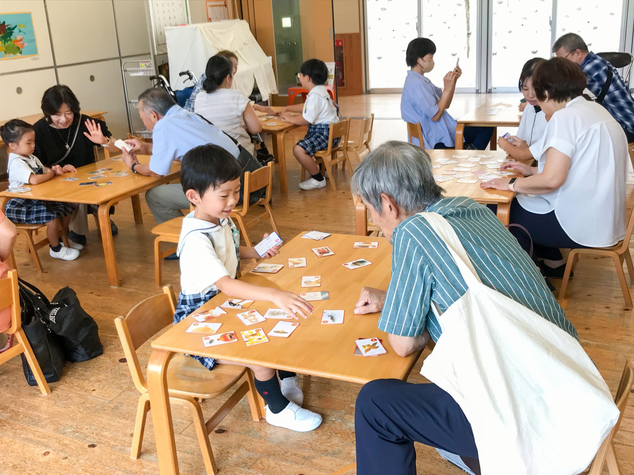 この日をとても楽しみにしていた子どもたち。大好きなおじいちゃん・おばあちゃんと、各教室に用意されたカルタ、コマ、折り紙やメンコなどで、一緒に遊びました。