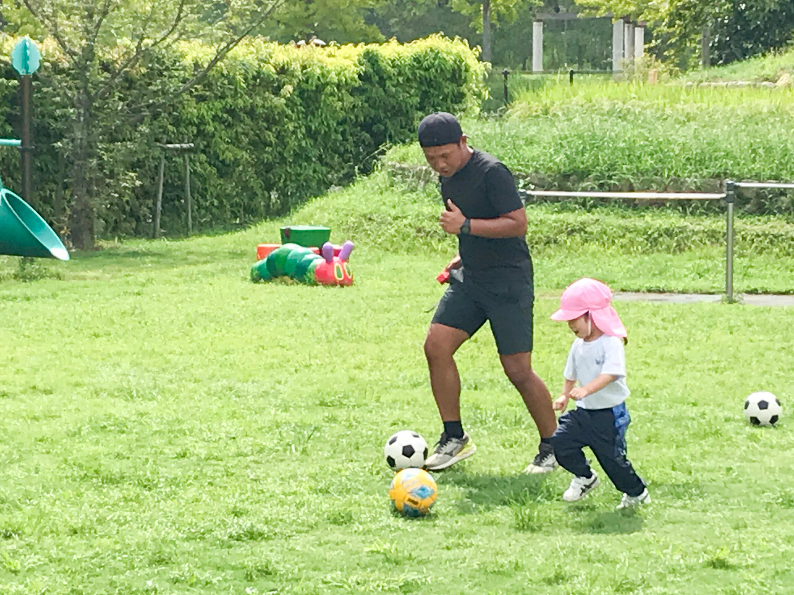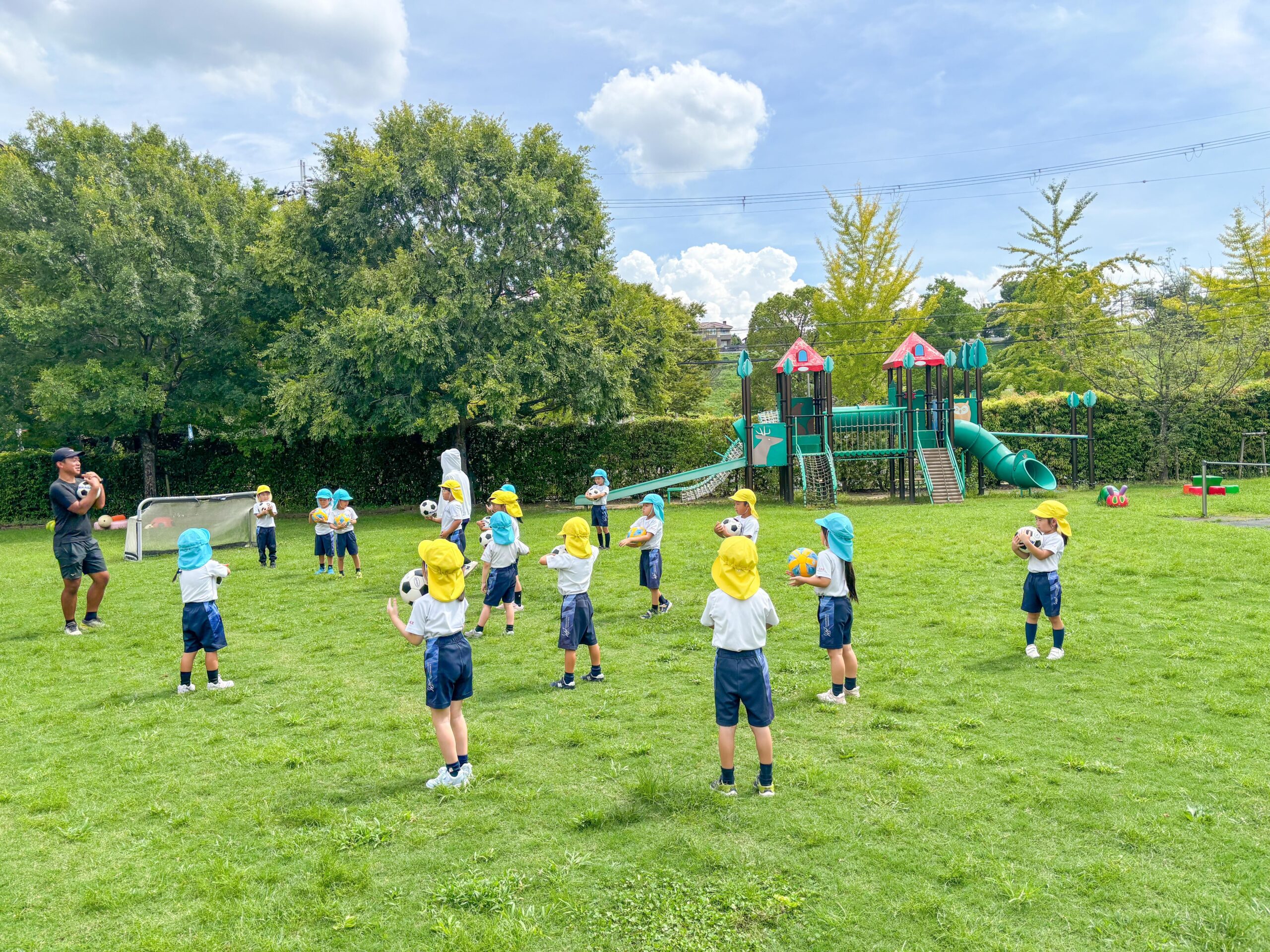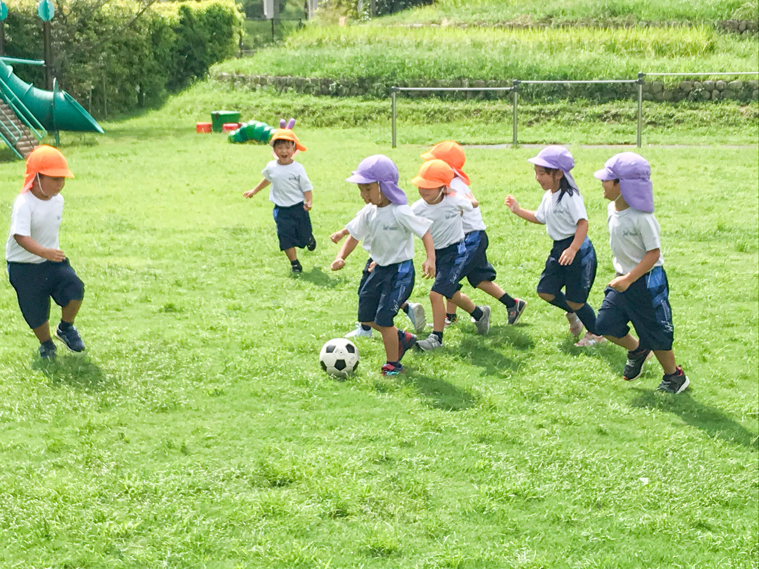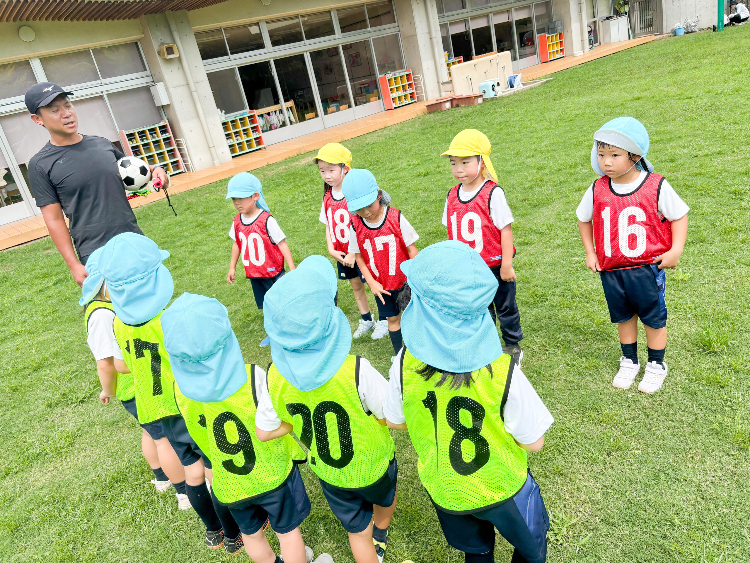子どもたちは、指導してくださる大前先生が大好きです。園庭で先生の姿を見ると、みんなすぐに駆け寄ってきました。さっそく、サッカーボールを使った遊びが始まります。ボールをいろんな方法で投げたり、蹴ったりして十分体を動かしてから、シュート練習。最後はミニゲームを楽しみました。応援する子どもたちも、暑さに負けず元気いっぱいです!