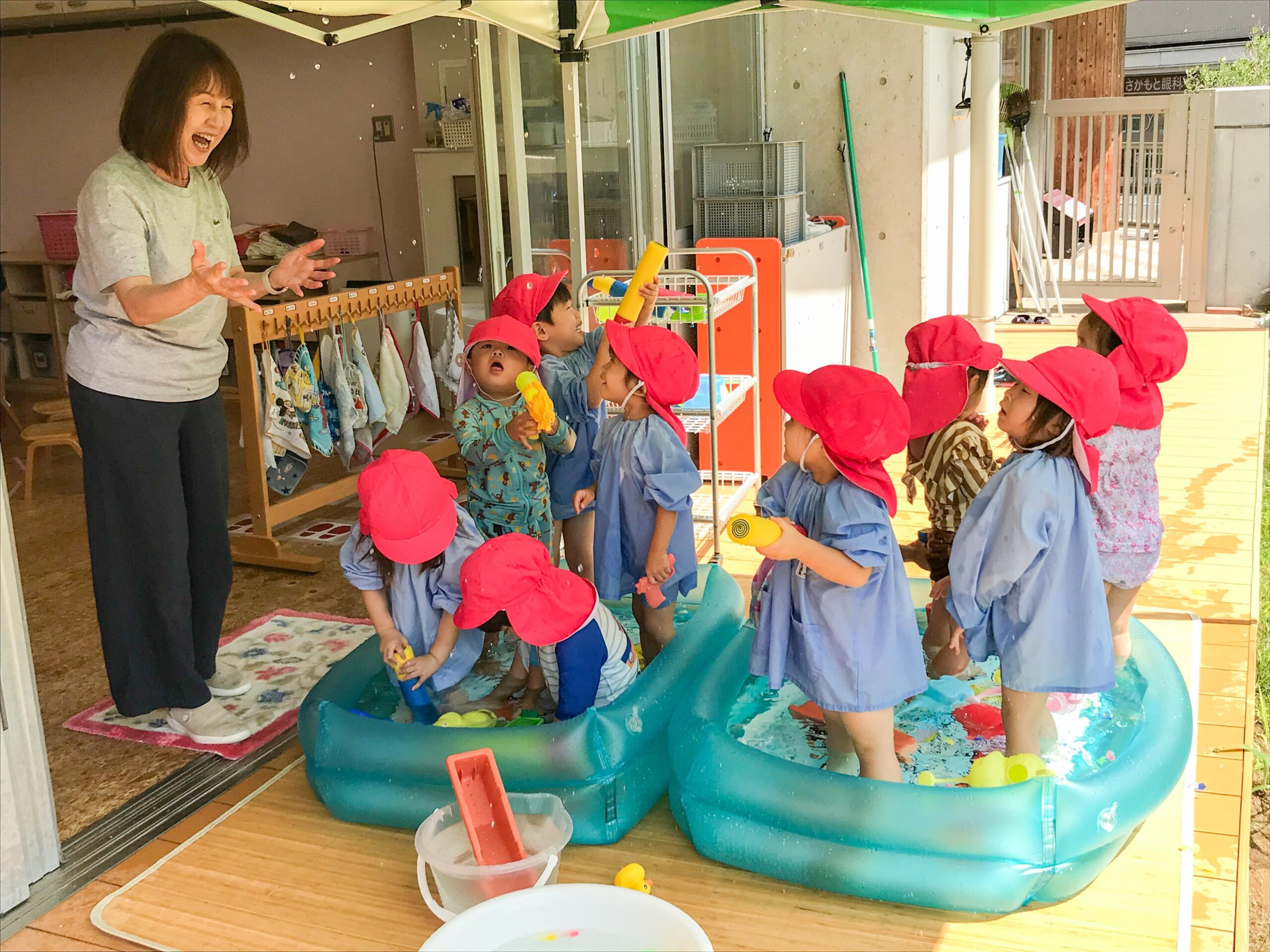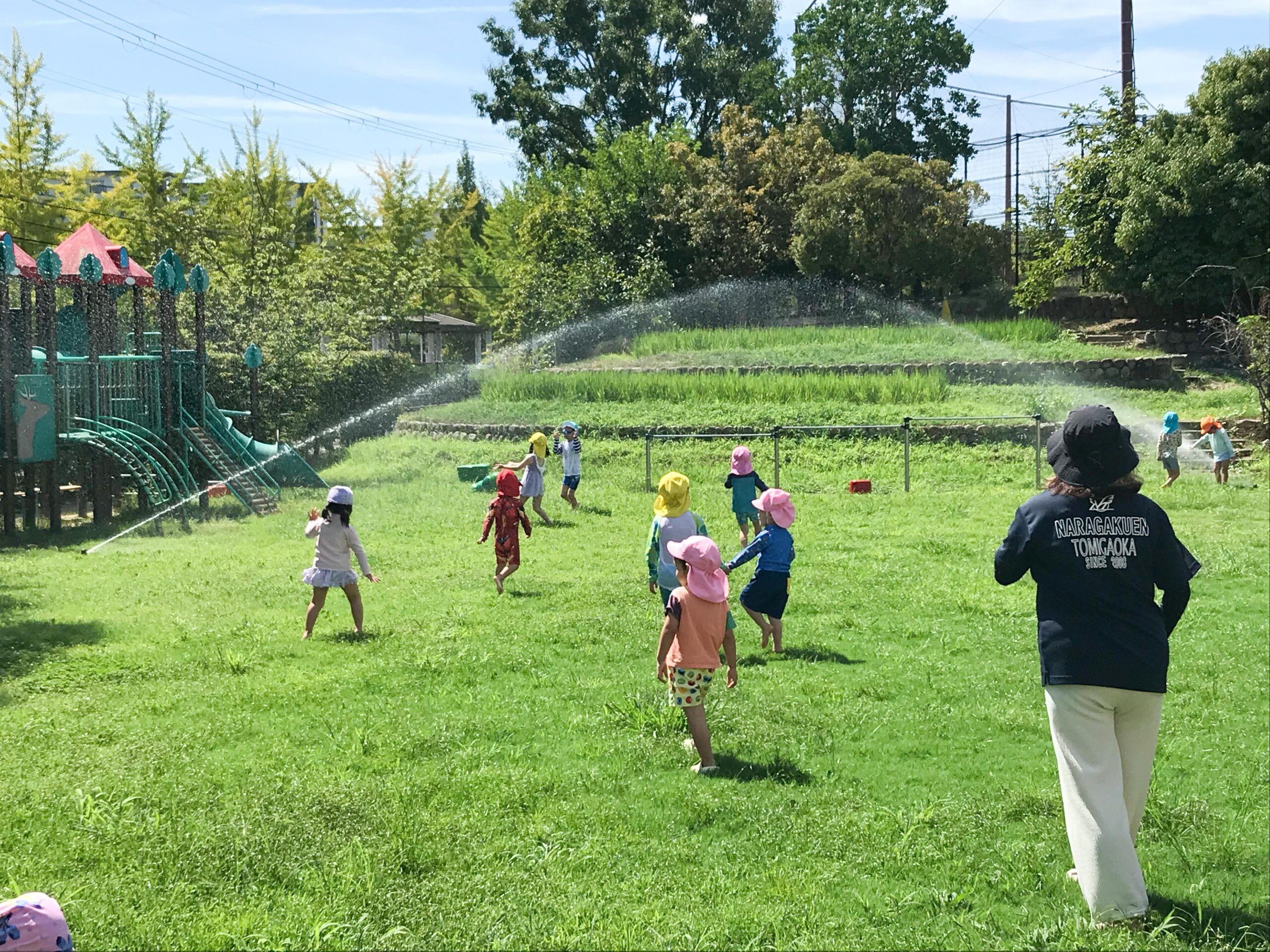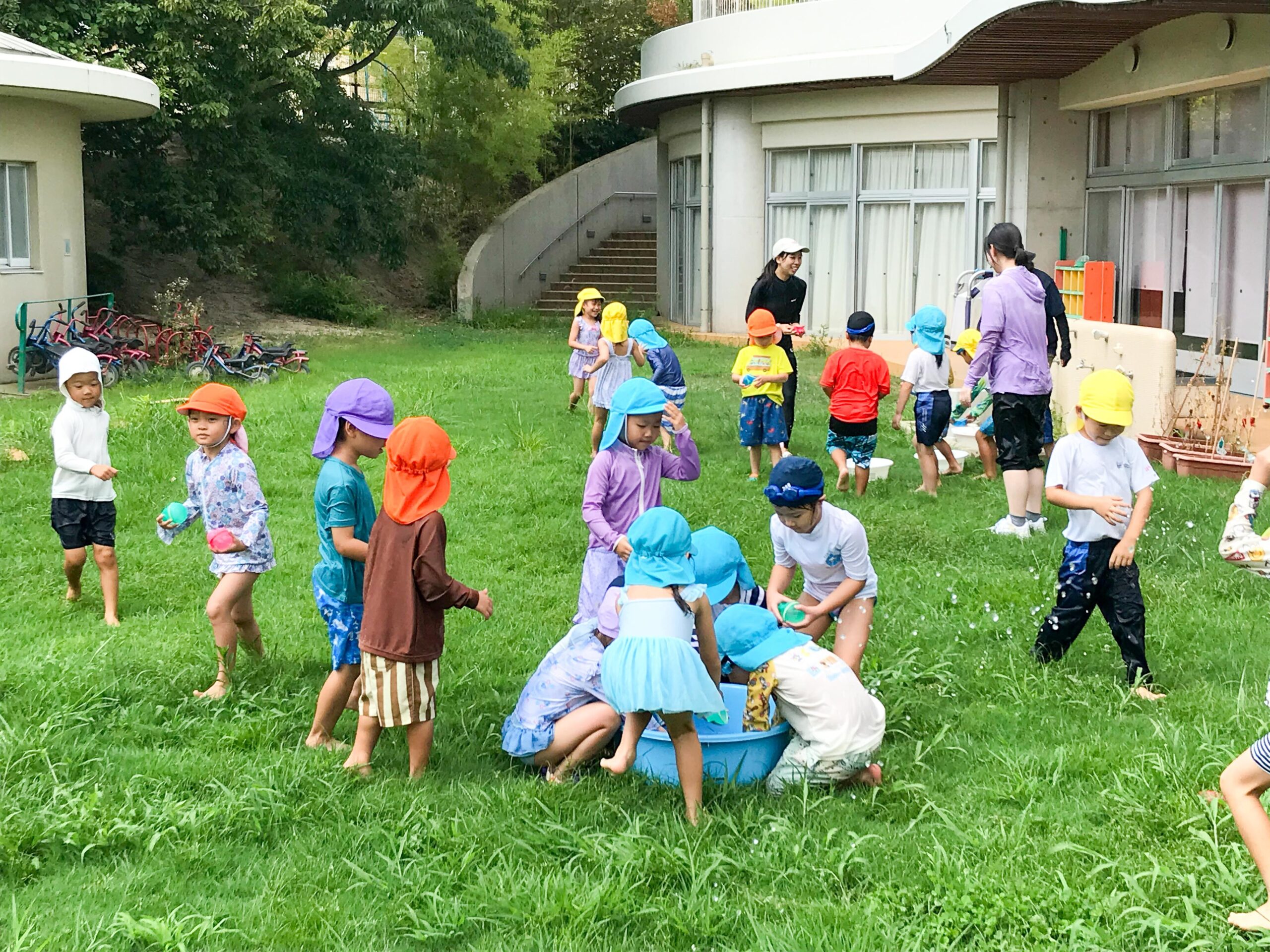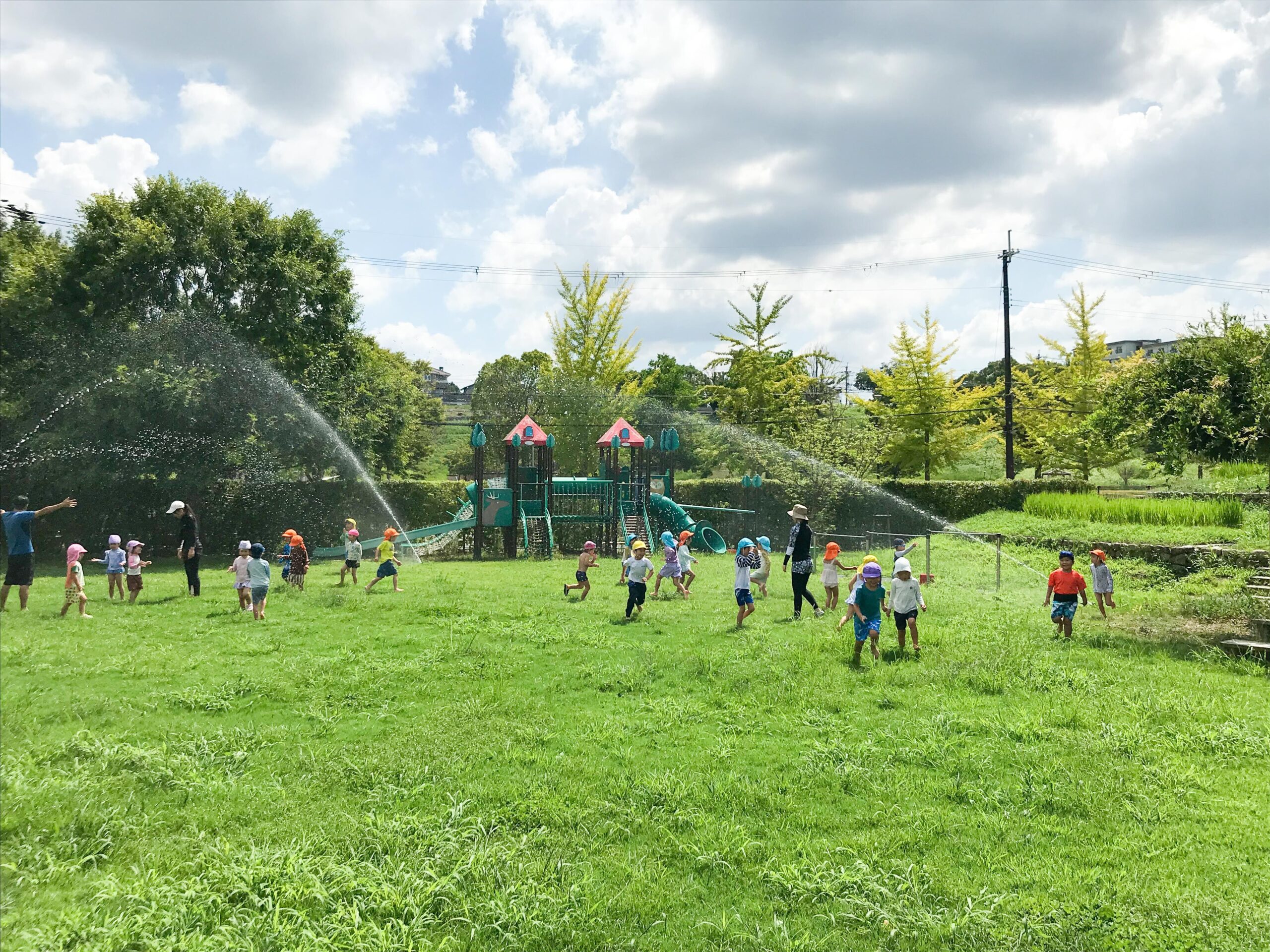 8月21日(木)22日(金)の2日間、夏期保育を行いました。今回の一番のお愉しみは、園庭での水遊びです。濡れても大丈夫な服に着替えて園庭に飛び出した子どもたち。スプリンクラーからの冷たい水を浴びたり、日陰に設置したプールや遊具で遊んだり・・・短い時間でしたが、「涼」を全身で楽しみました。