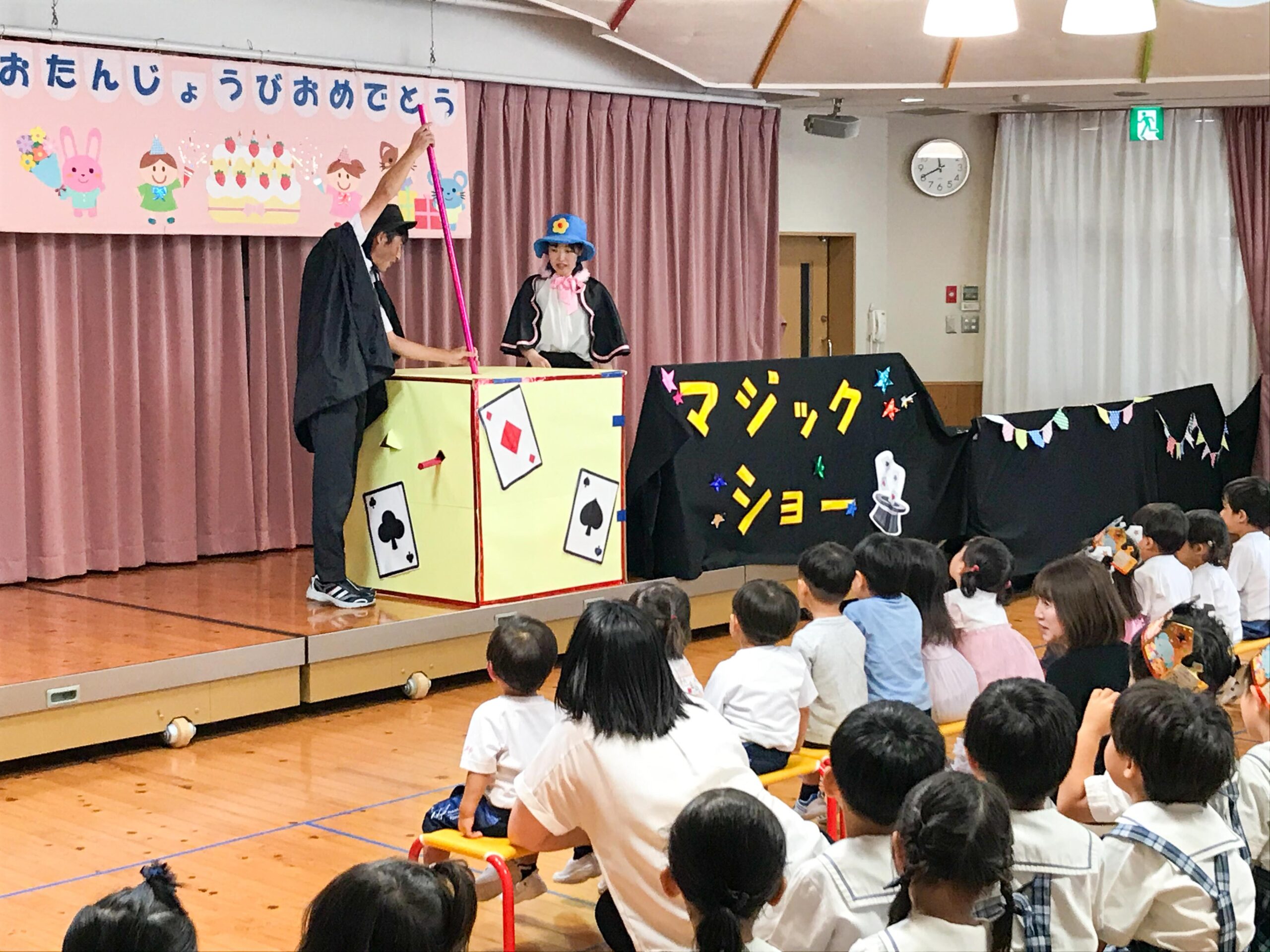 今回の先生からの出し物は「マジックショー」です。ハンカチがステッキに、お茶が水に・・・あっという間に変わるマジックや、カードを使ったマジック。そして仕上げは瞬間移動。本格的なマジックの数々に子どもたちの目はくぎ付け!大いに盛り上がりました。
