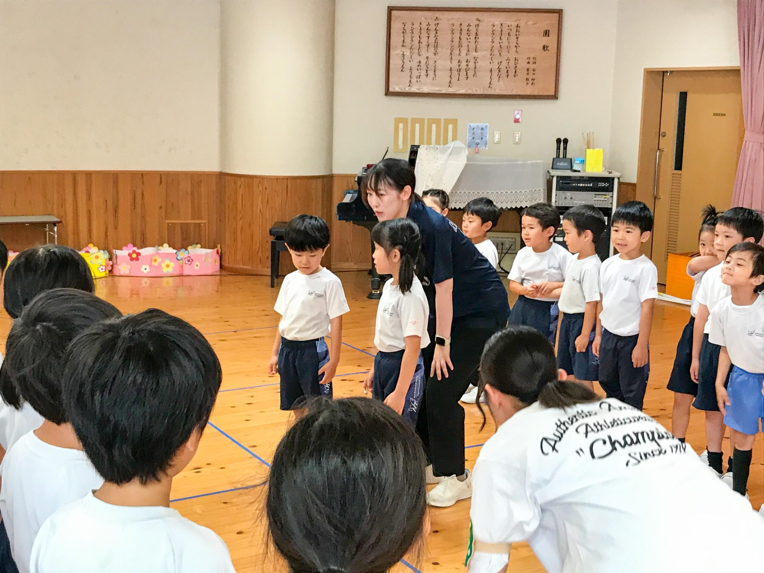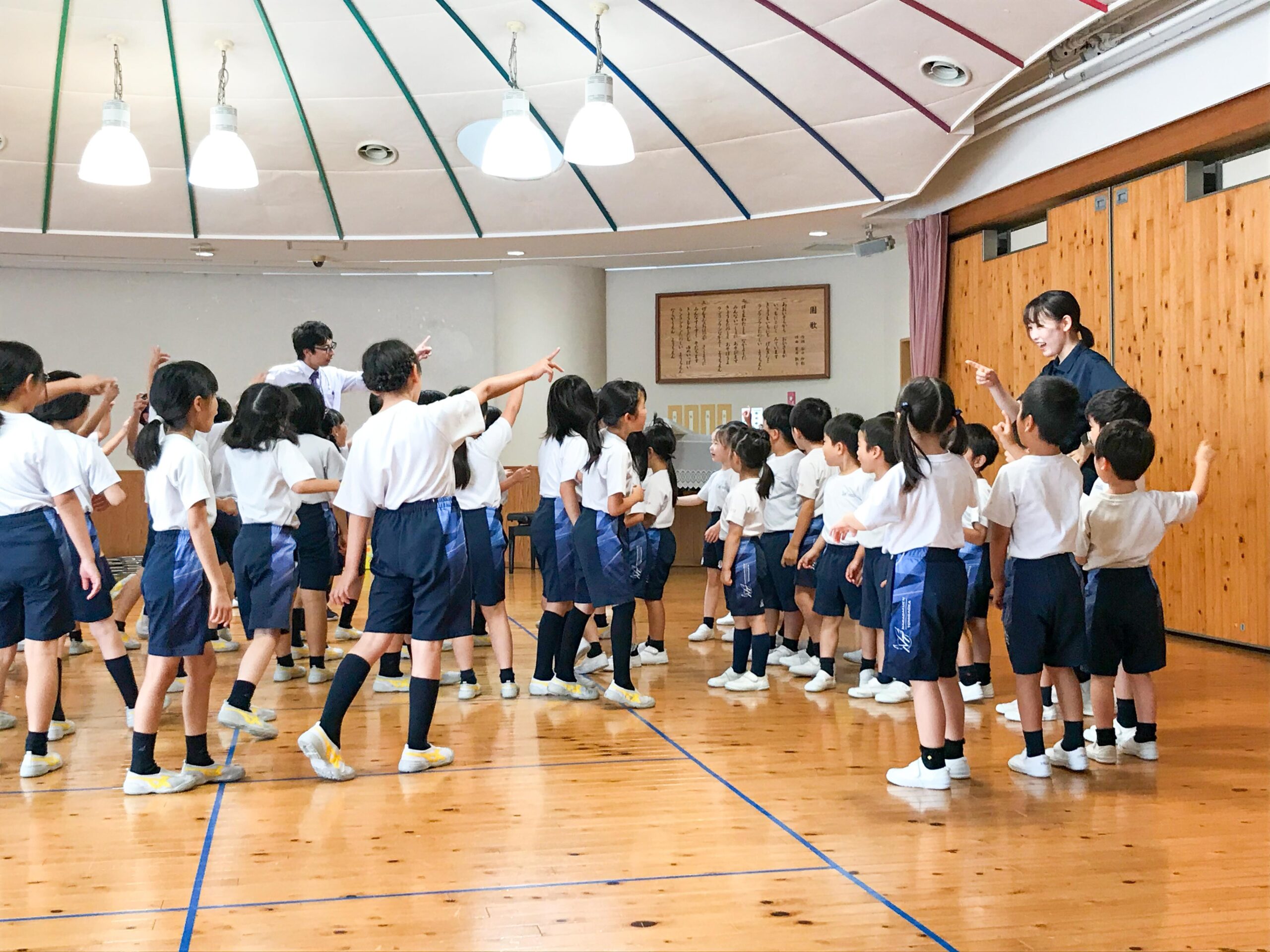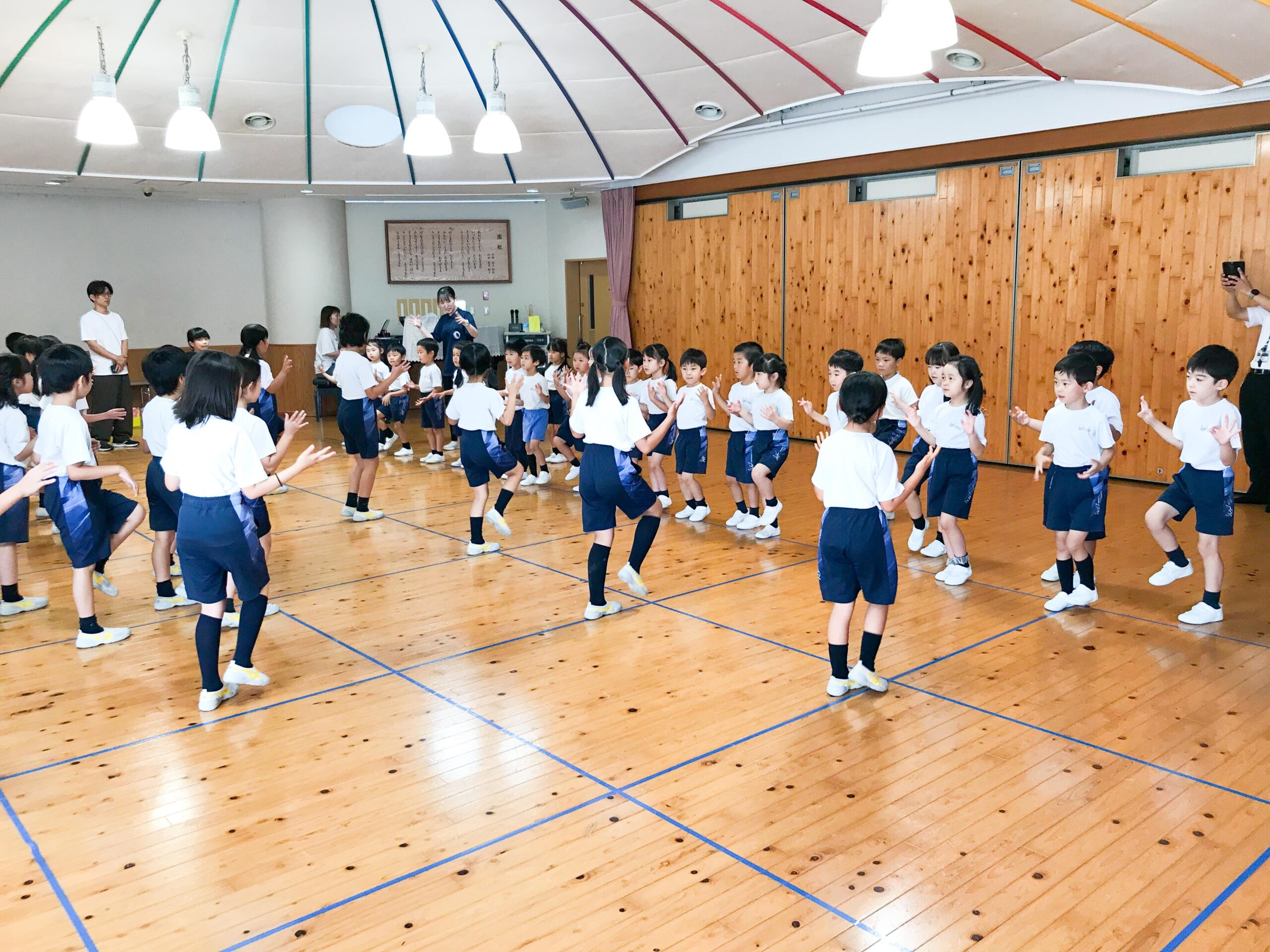 最初は小学生から、歌とダンスを教えてもらい、一緒に踊って楽しみました。次に幼稚園児から、今、自分たちがよくしている遊びを紹介して、一緒に遊ぶことになりました。「線おに」と「小学校へ行こうよ」で遊戯室内をダイナミックに動き回り、交流は大いに盛り上がりました。