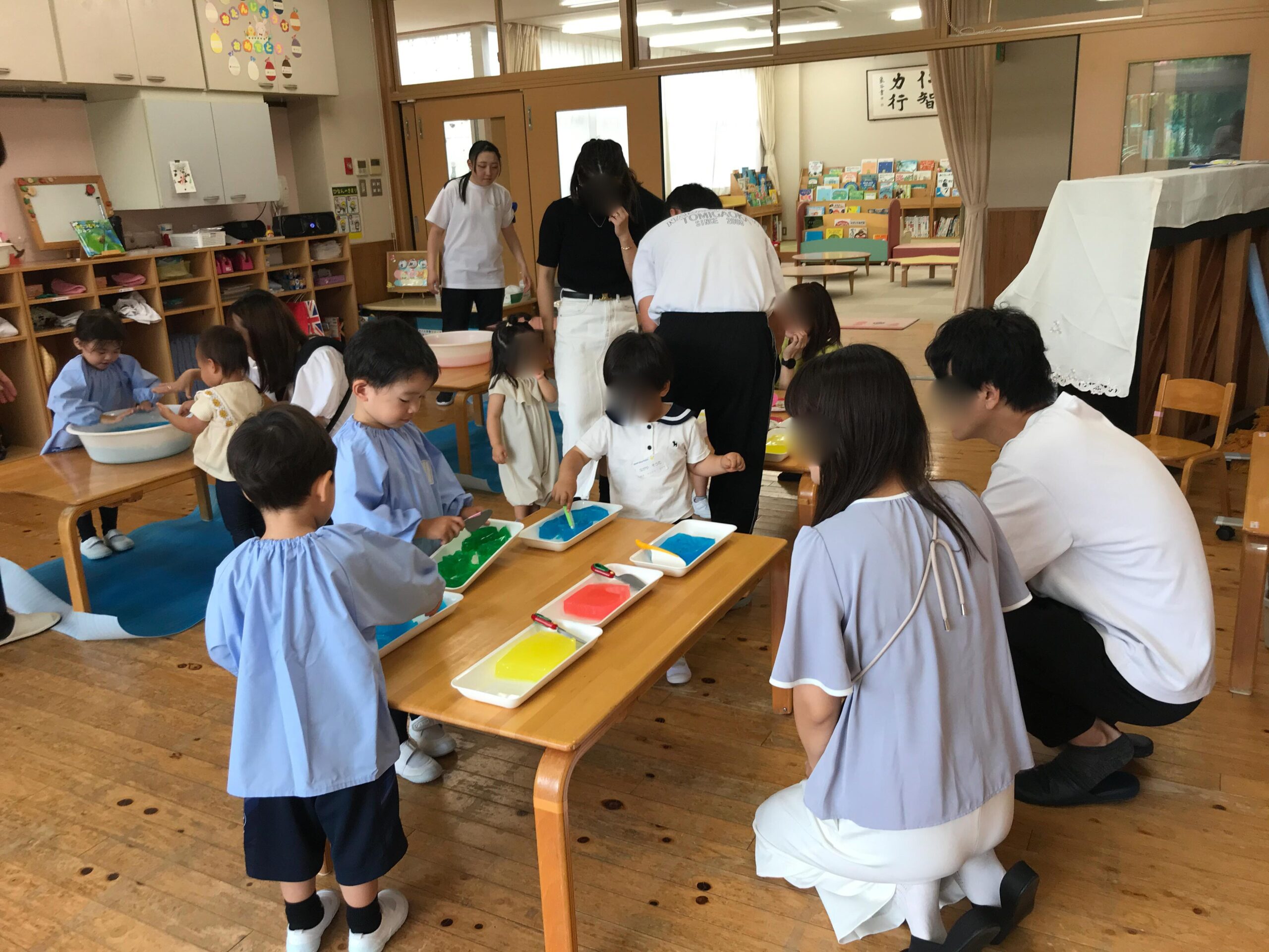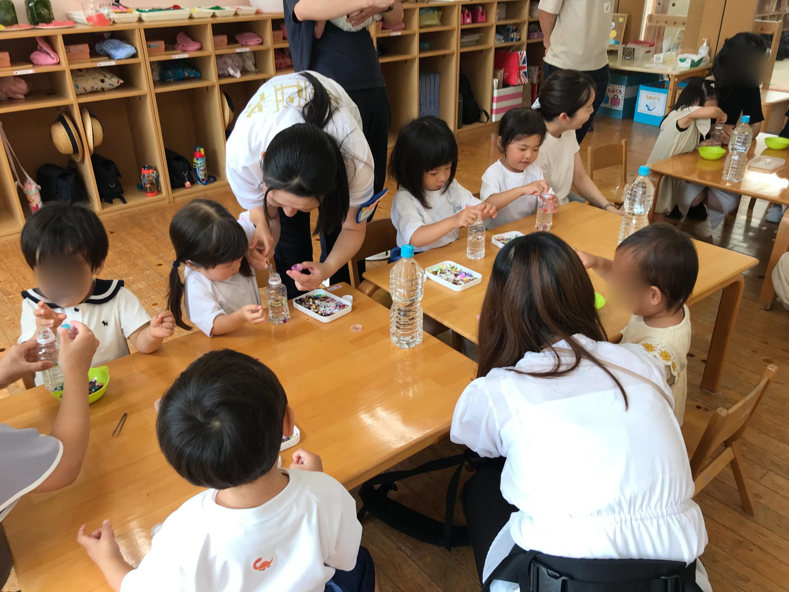 はじめましてのごあいさつをしてから、一緒にスライムや寒天などで遊びました。ひんやりとした手の感触を味わい、夏ならではの遊びを楽しみました。