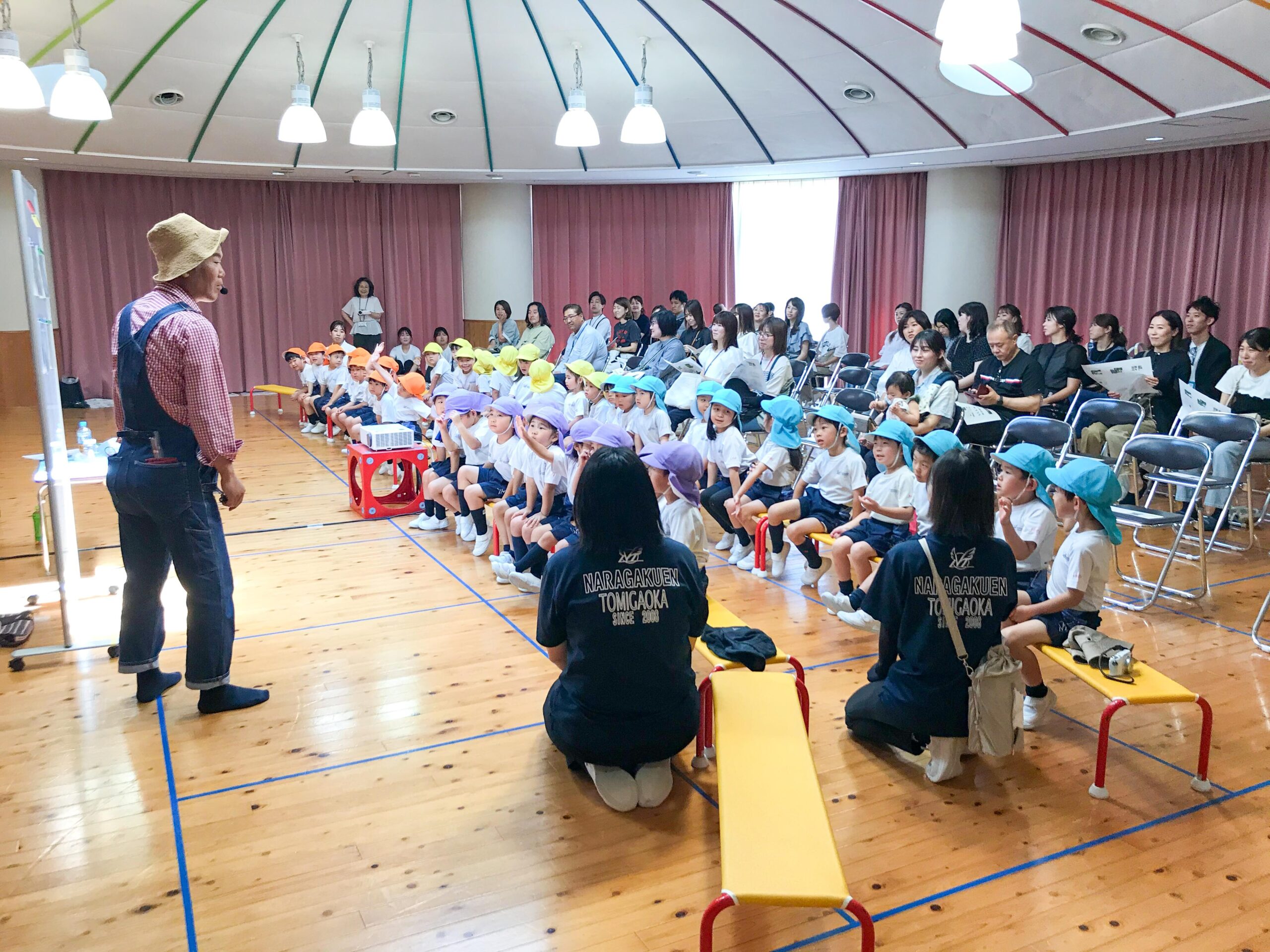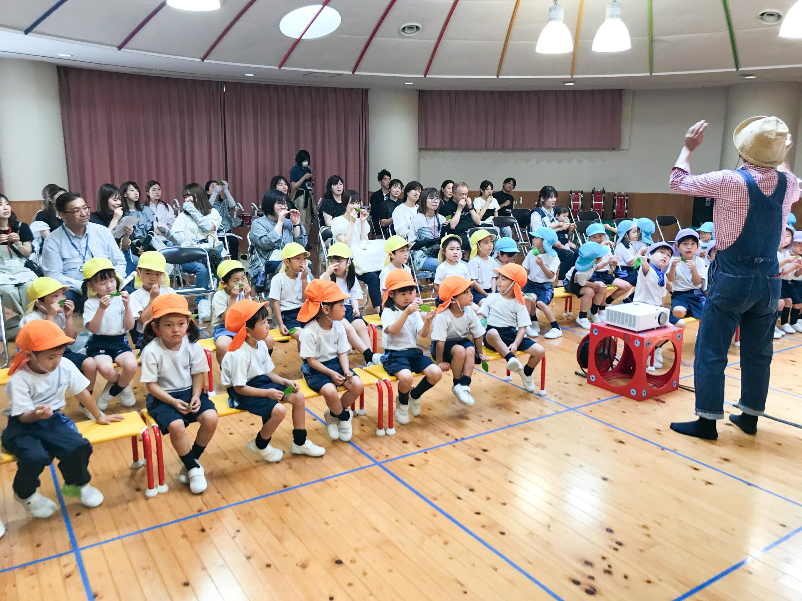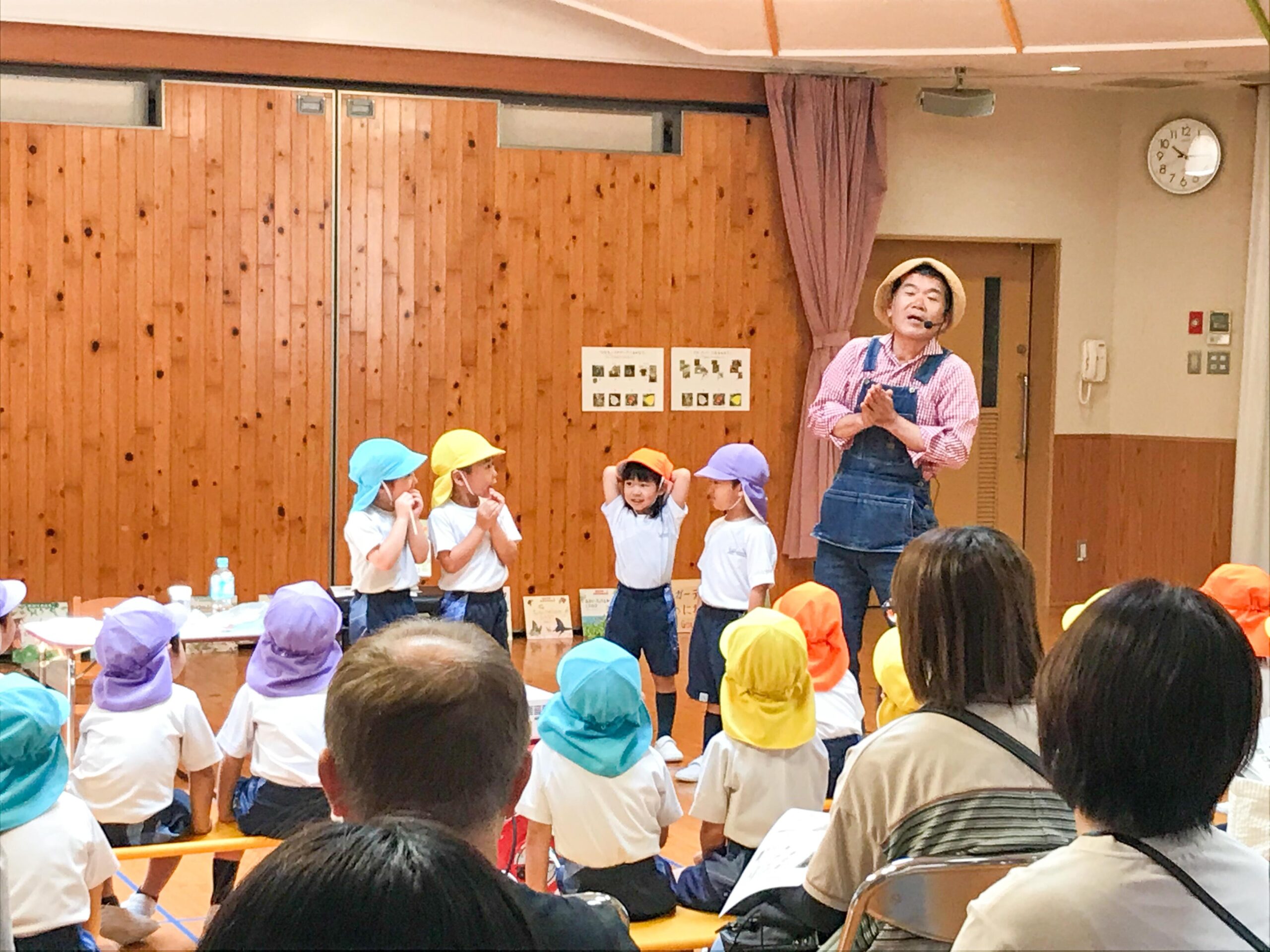 遊戯室に集まった、年中・年長組の子どもたち。始めに畑さんの自己紹介や、昆虫についてのお話を聞きました。「幼虫の時は口を使って葉っぱを食べるけど、ちょうちょになるとストローみたいになるから、飲み物しか飲めなくなるよ。でも、羽が生えていろんなところに行くことができるようになる。」という完全変態の知識を、わかりやすく教えていただきました。