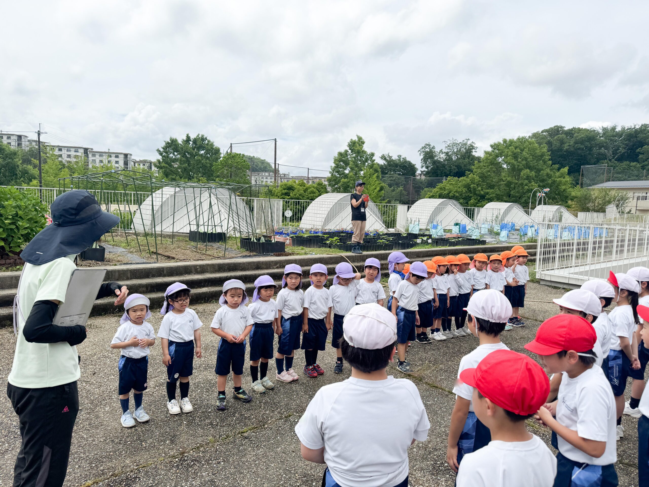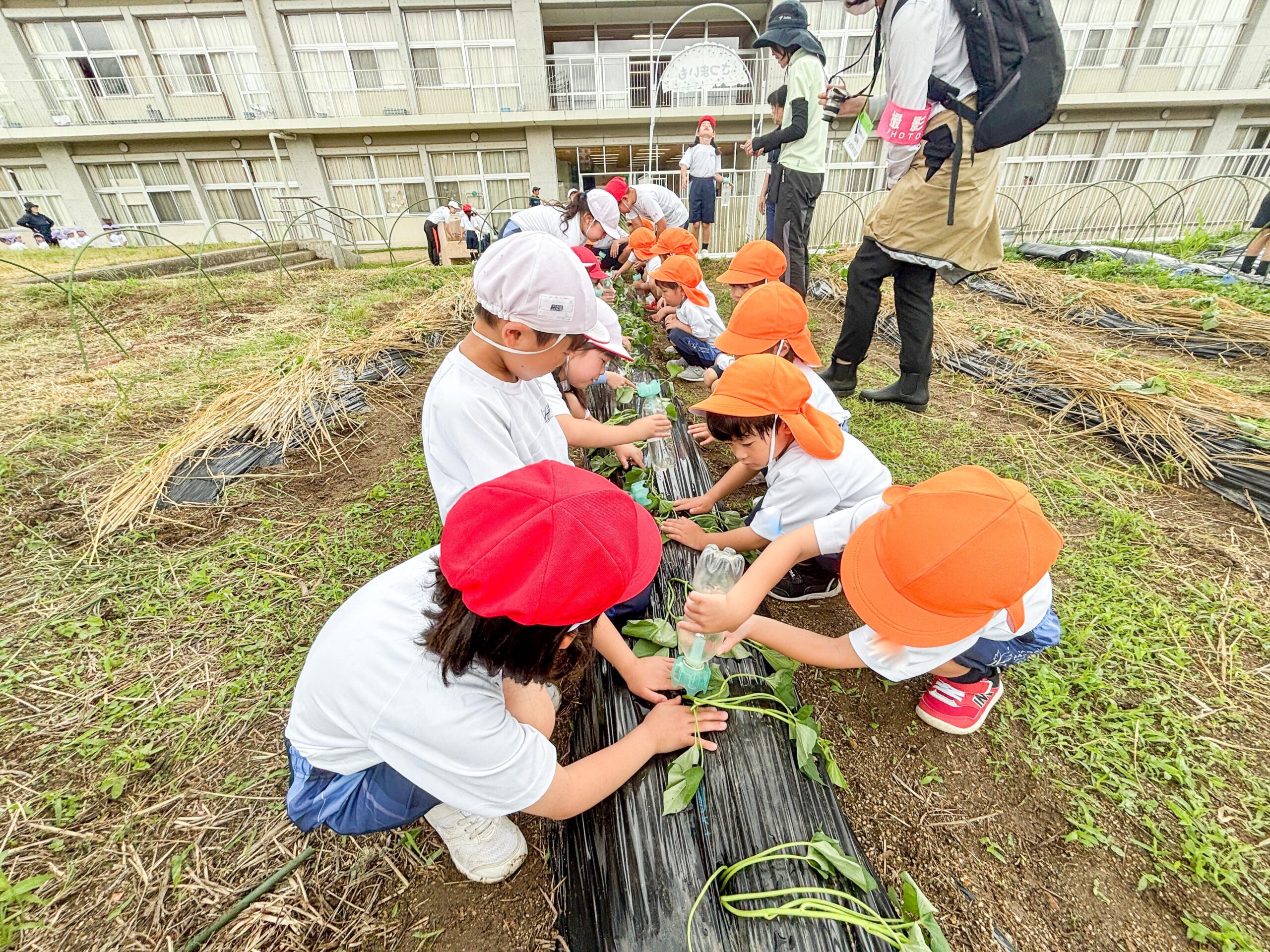植えた後に水をやって作業は終了です。最後に、園児と小学生が仲良く一緒に記念撮影。いもの苗が順調に育ってくれるように、この後も水やりや観察のために、時々学級園を訪れる予定です。