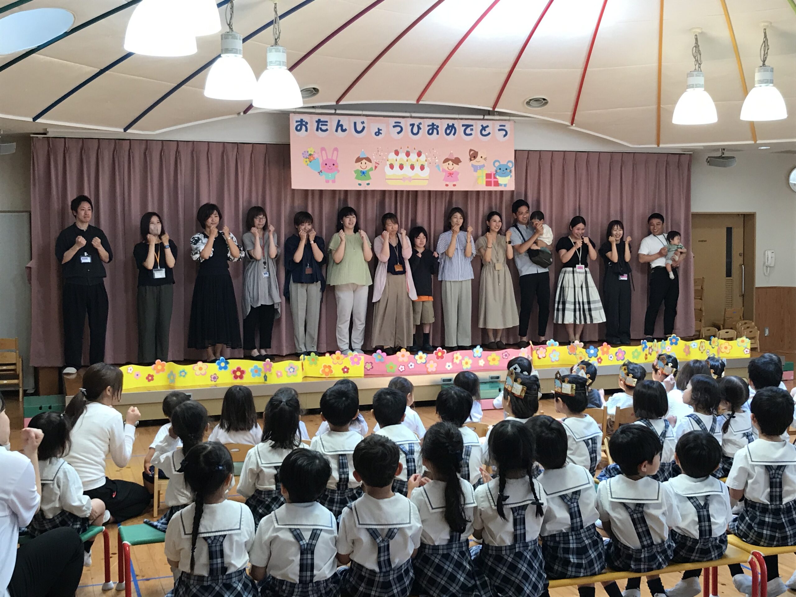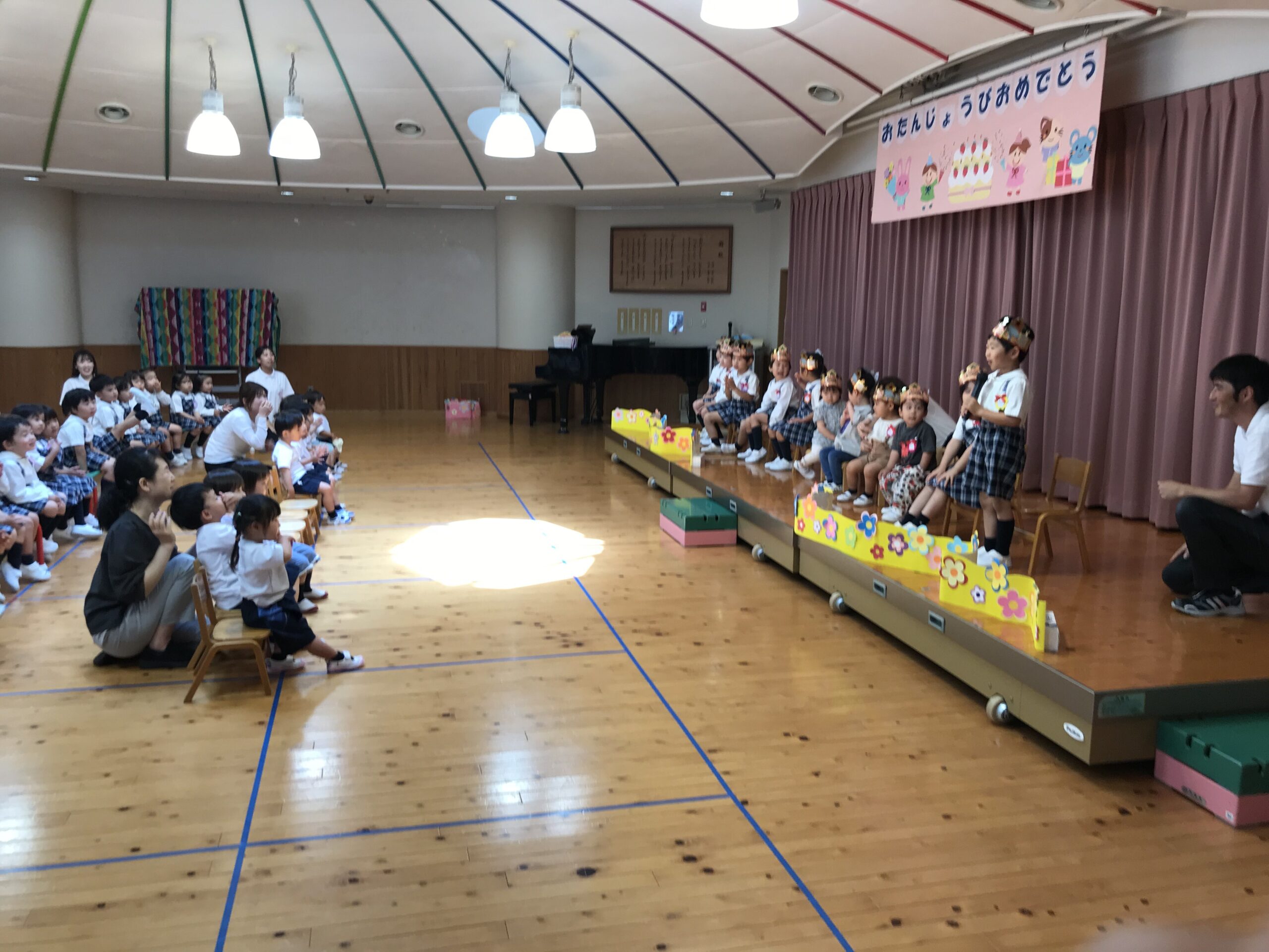 まず初めに、王冠をかぶって舞台上に並んだ4・5月生まれのお友達が、自己紹介をしてくれました。「ハッピーバースデー」の歌をみんなで歌い、園長先生のあいさつの後には、「ハッピーフレンズ」の歌で「おめでとう」の気持ちを伝えました。