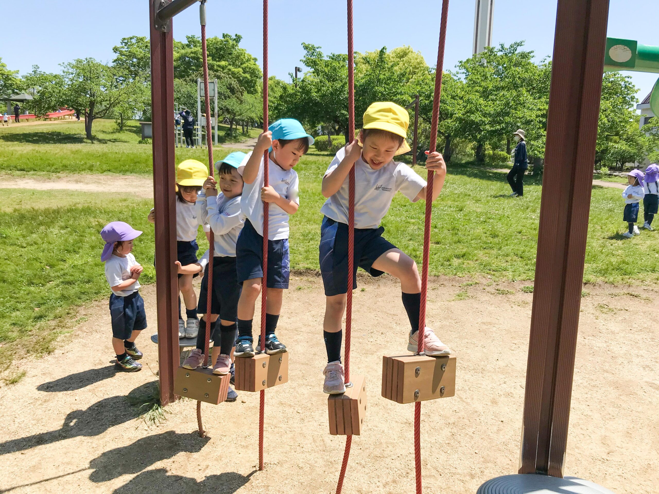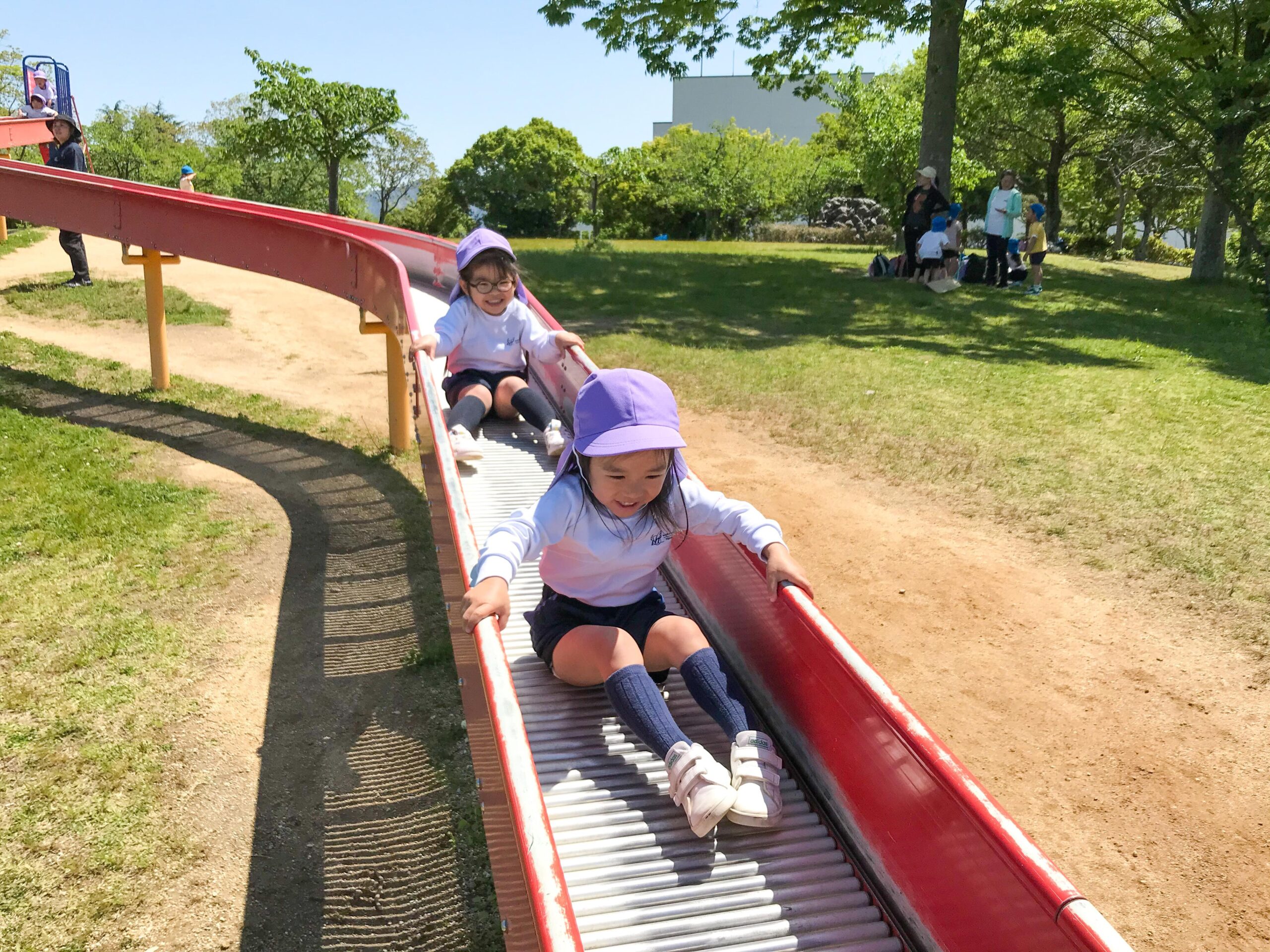 今年度も晴天に恵まれました。子どもたちは公園に到着して、学級ごとの記念撮影を終えるとすぐに、長いスロープの滑り台やジャングルジムなど、設置されている様々な遊具で遊びました。お花や小さな実を見つけて集めている子、幼稚園から持って行ったフープを使った遊びを楽しむ子など、それぞれが自分の好きな遊びを見つけ、半日かけて思う存分楽しむことができました。