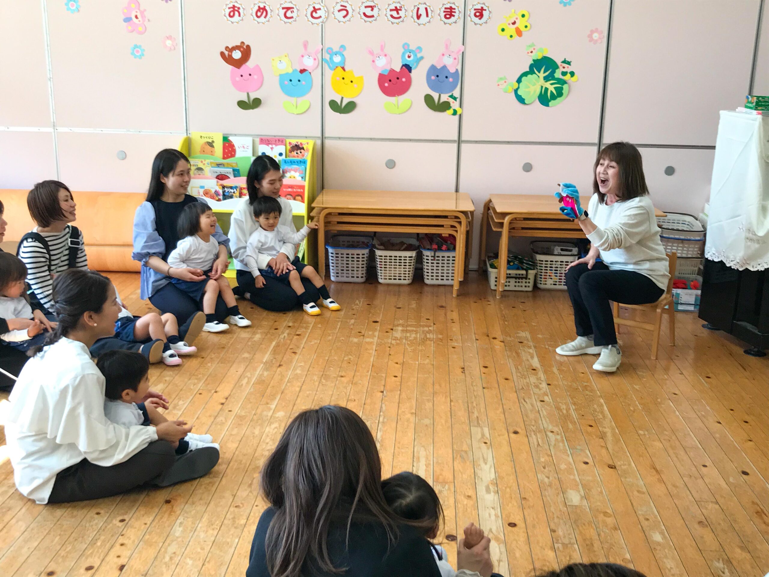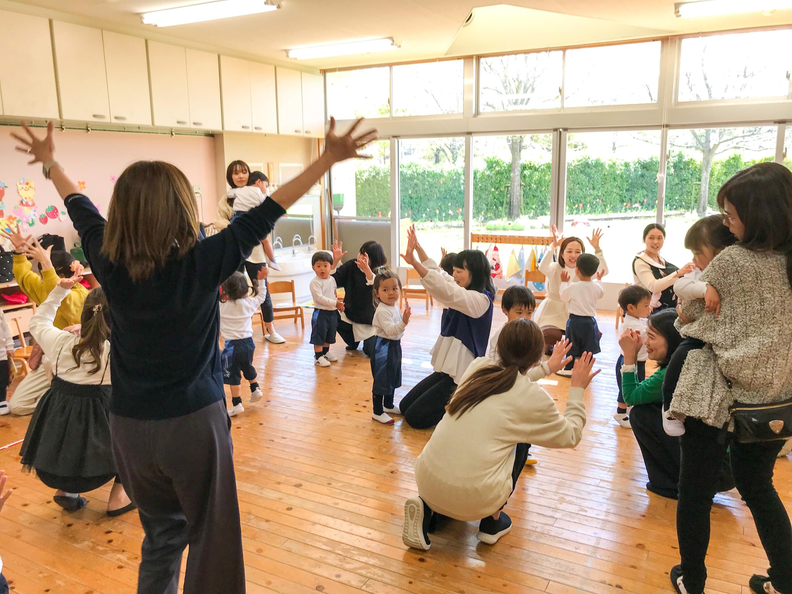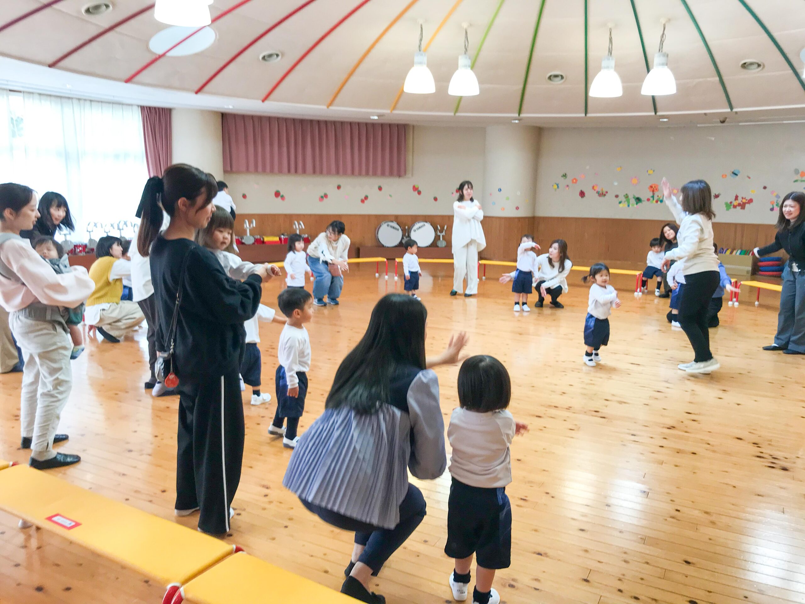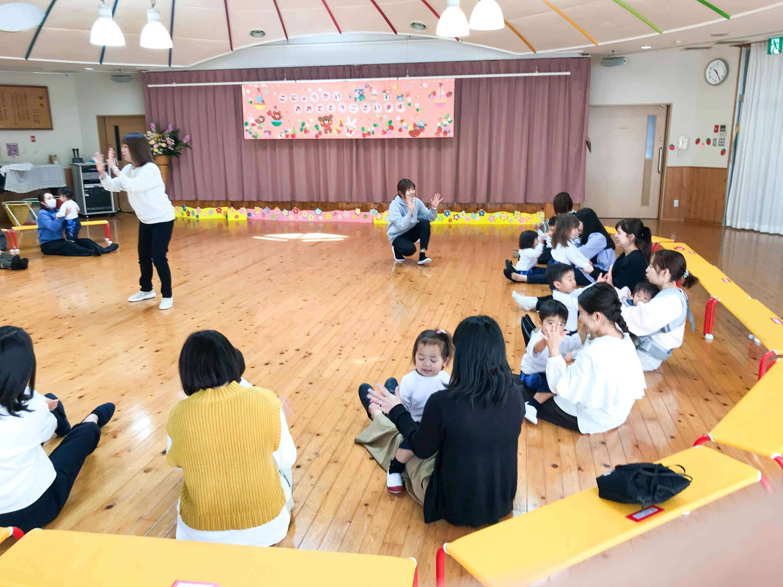 15日はいちご組お部屋で、手遊びやふれあい遊びなどを楽しみました。お家の方も一緒に参加いただいて、子どもたちは生き生きとした姿で過ごすことができました。
