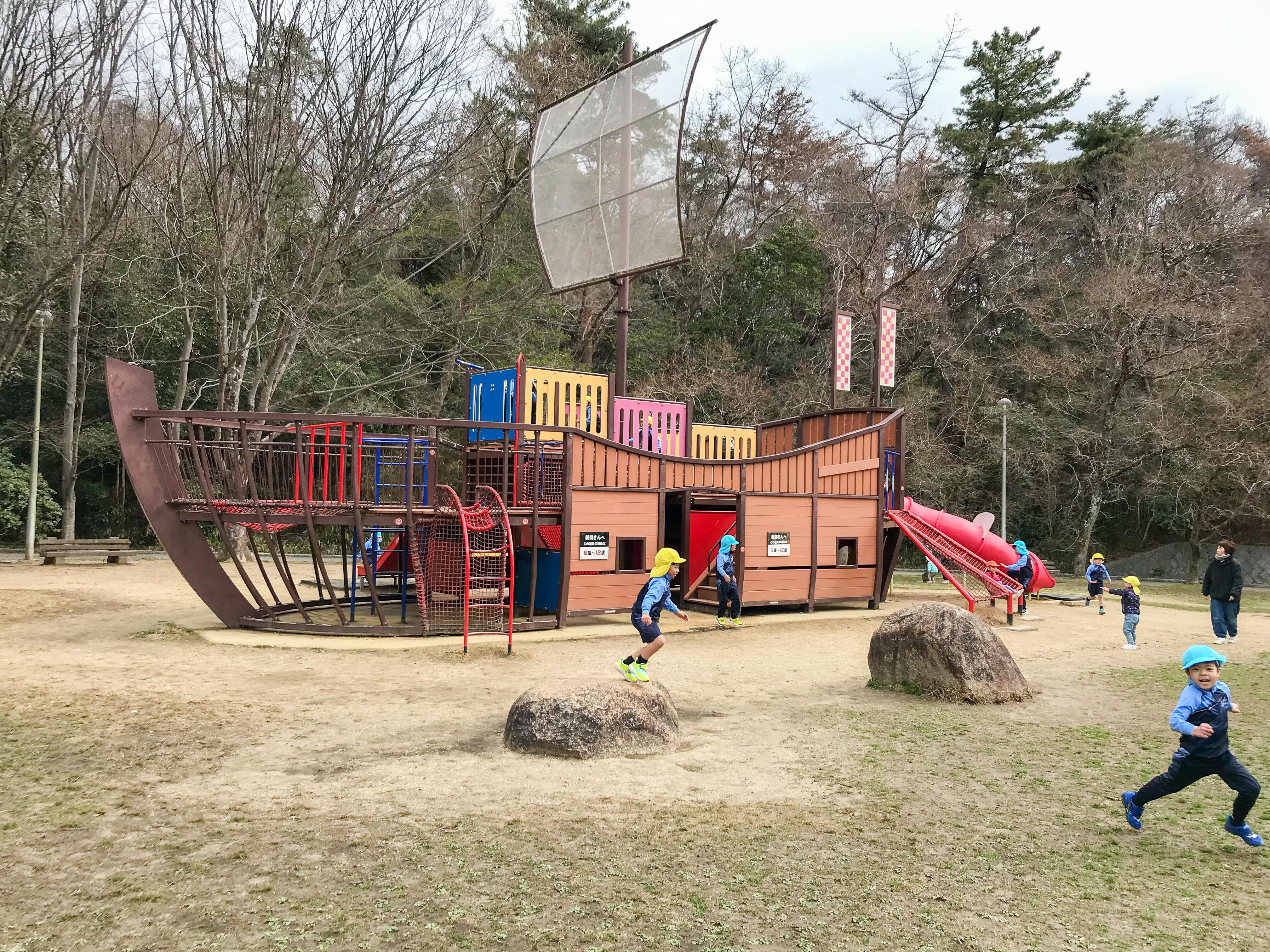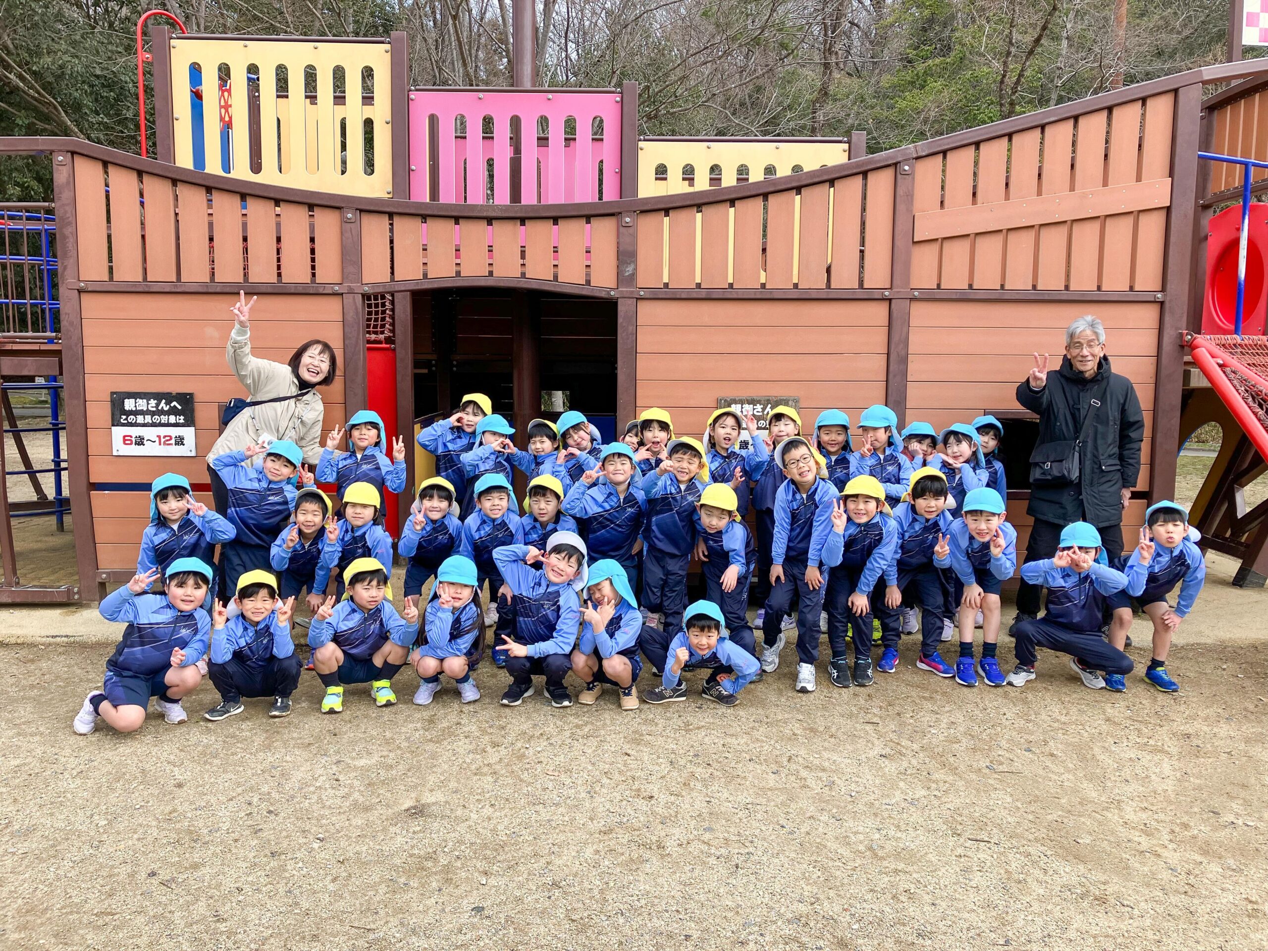 3月7日(金)年長組のお別れ遠足を行いました。この日をとても楽しみにしていた子どもたち。お話しをしながら歩いていると、あっという間に目的地の大渕池公園に到着しました。タコと帆船の形をした大きな遊具が人気で、何度も登ったり降りたりして思う存分遊びました。