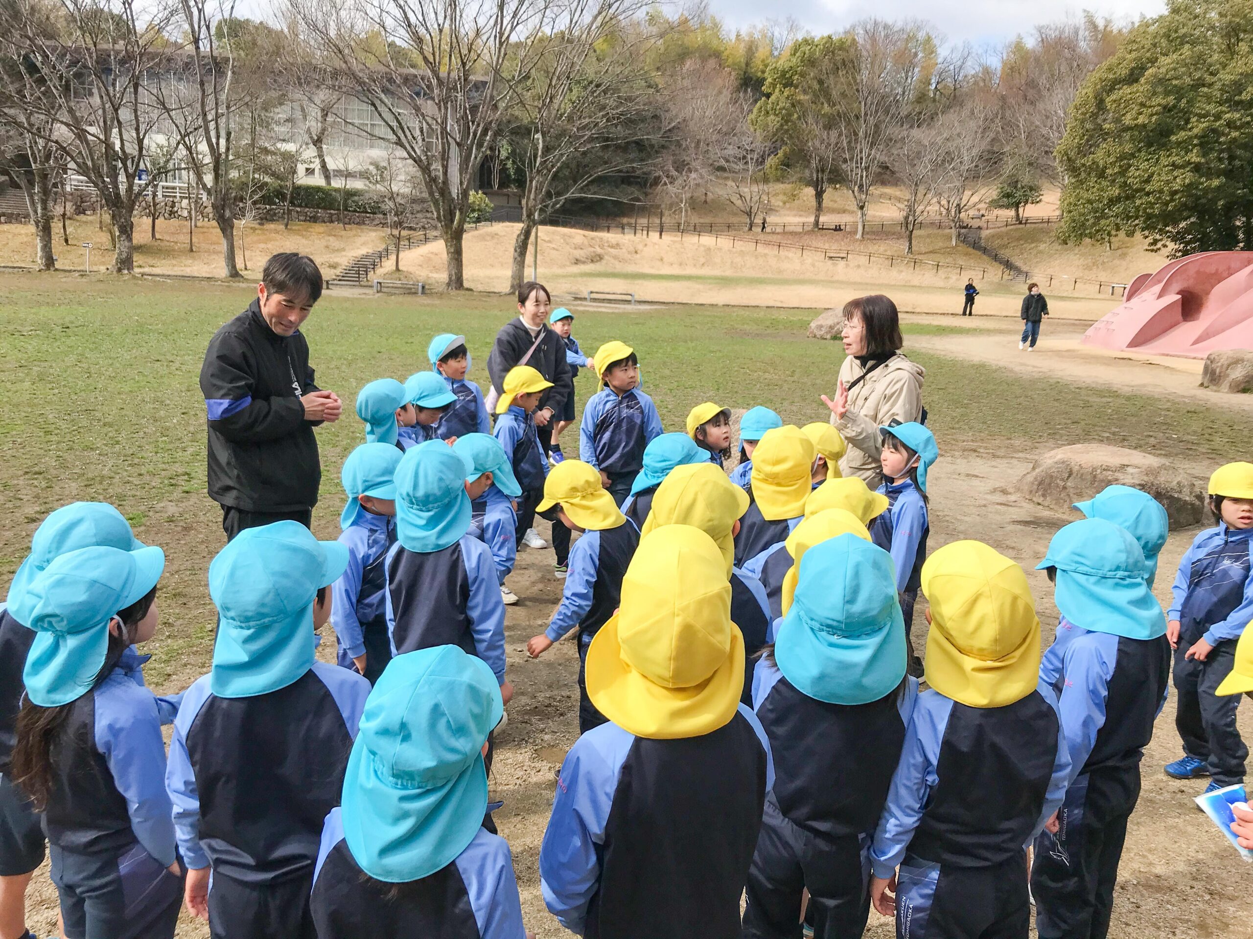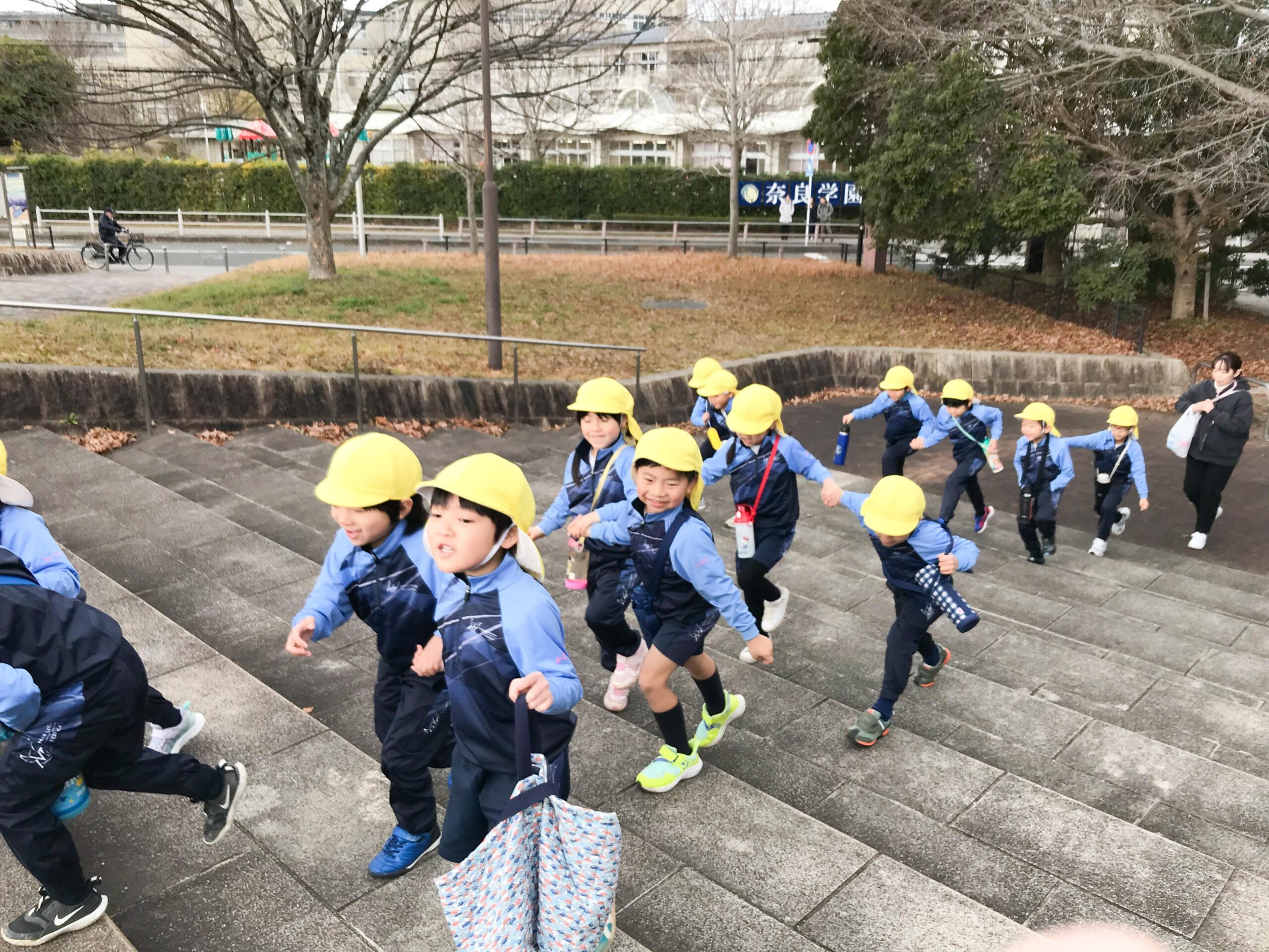 お家から持ってきたおやつを食べはじめた頃、急に霰が降ってきました。寒さも増してきたので、予定より早めに切り上げて、公園を後にすることになりました。少し残念でしたが、園に戻ってからお部屋で残りのおやつを食べ、満足した表情を見せていました。卒園する前にまた一つ、楽しい思い出ができましたね!