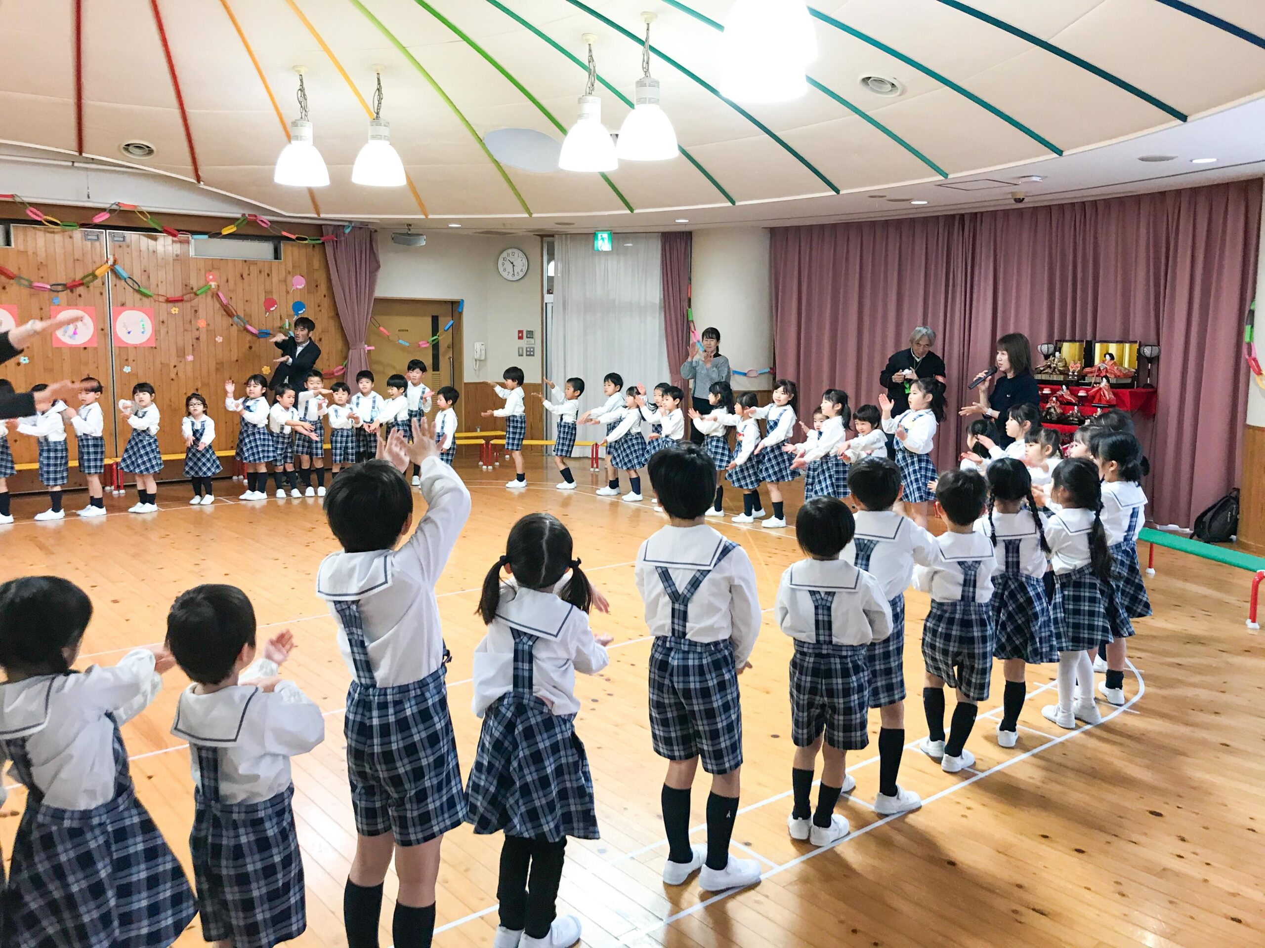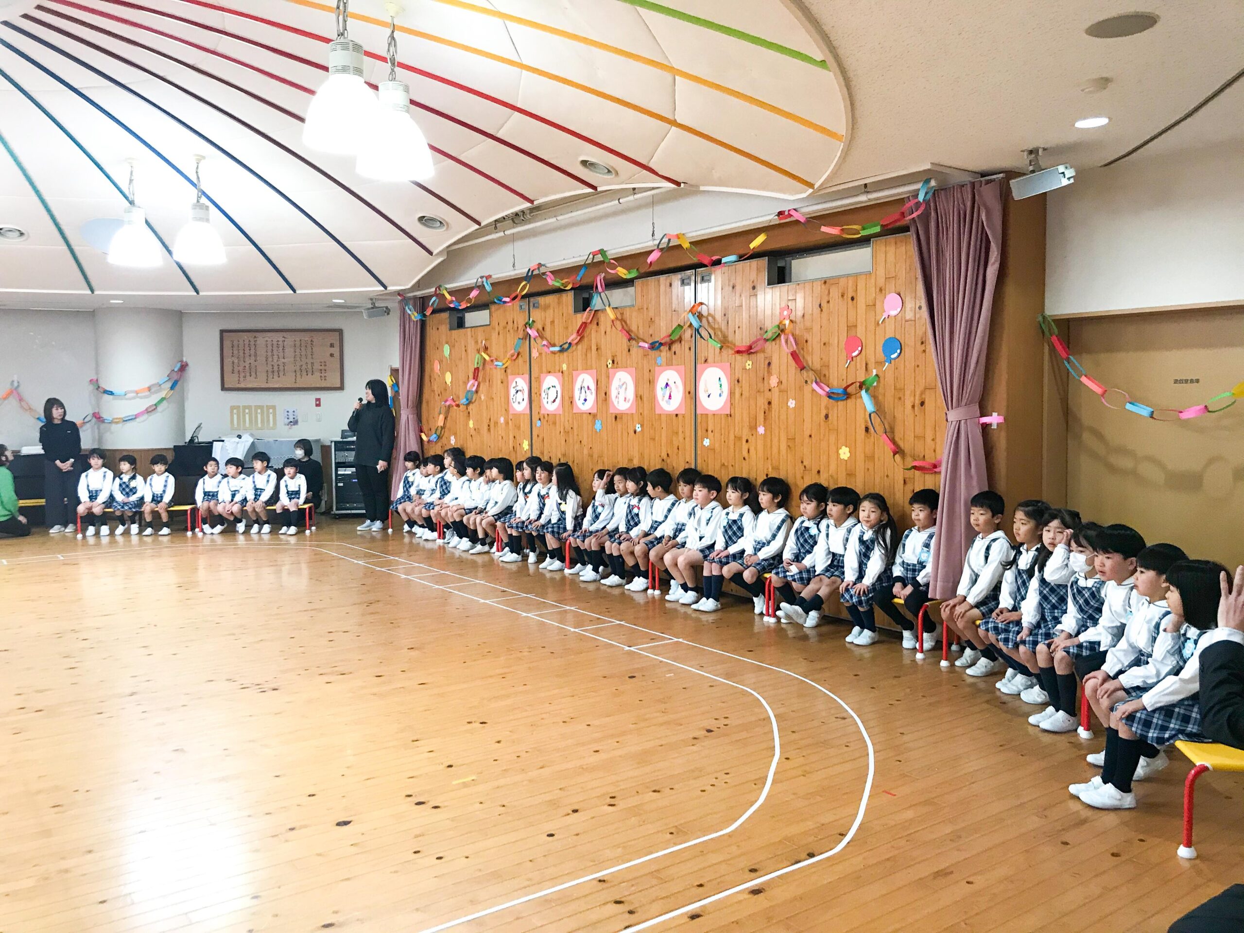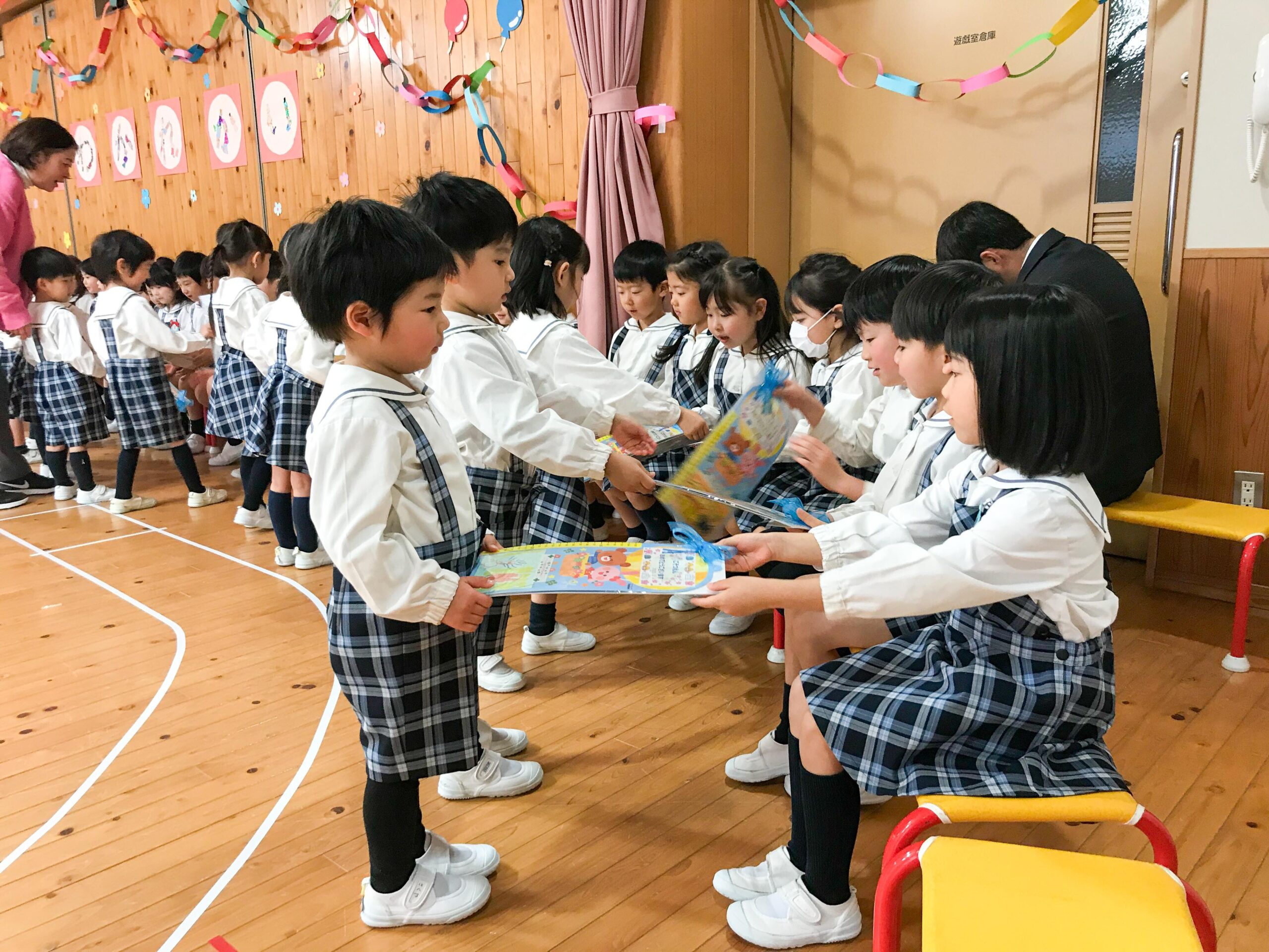 お別れ会が終わってから、遊戯室に集まってみんなで楽しくお弁当をいただきました。年長組のお友達のための、正に特別な1日となりました。