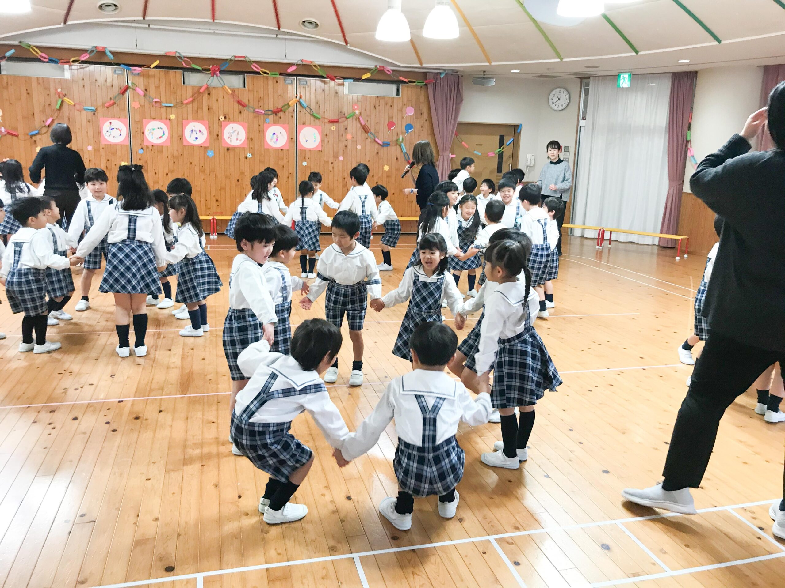 全学年が一緒になって「どうぶつれっしゃ」や「ともだちパレード」を楽しみました。輪になって手をつないだりして、笑顔いっぱいの子どもたち。交流が深まっていきます。