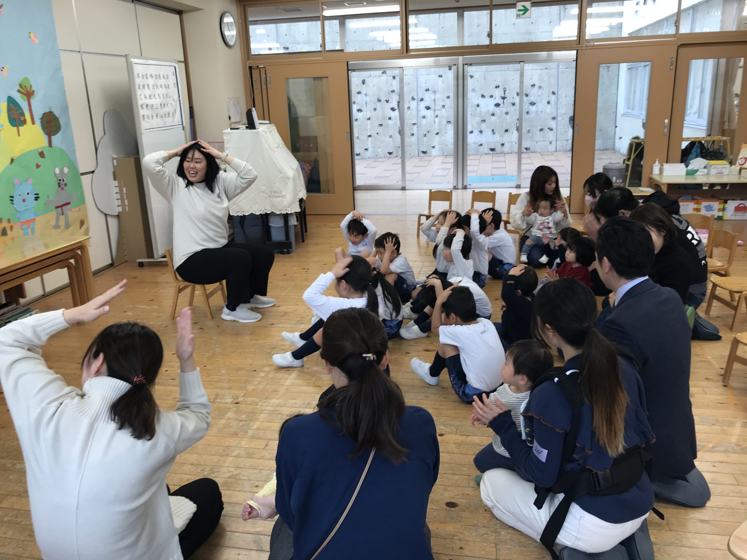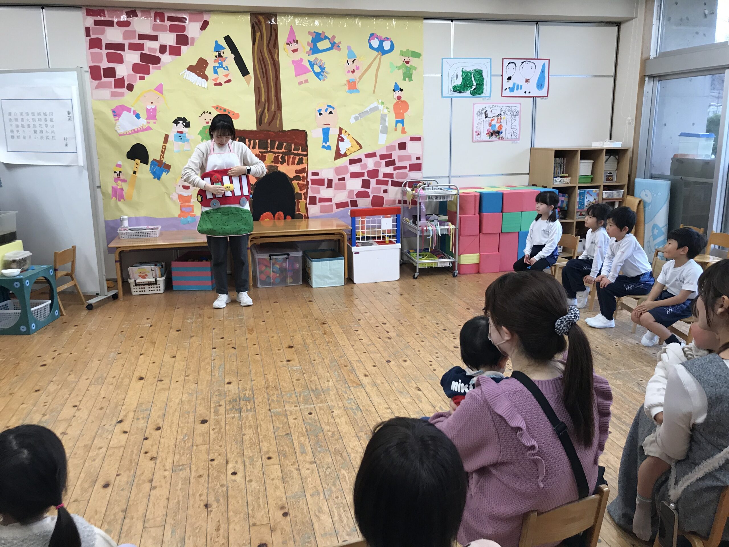 最初に年中組の2学級に分かれていただき、お部屋で手遊びやエプロンシアターなどを園児と一緒に楽しんでもらいました。