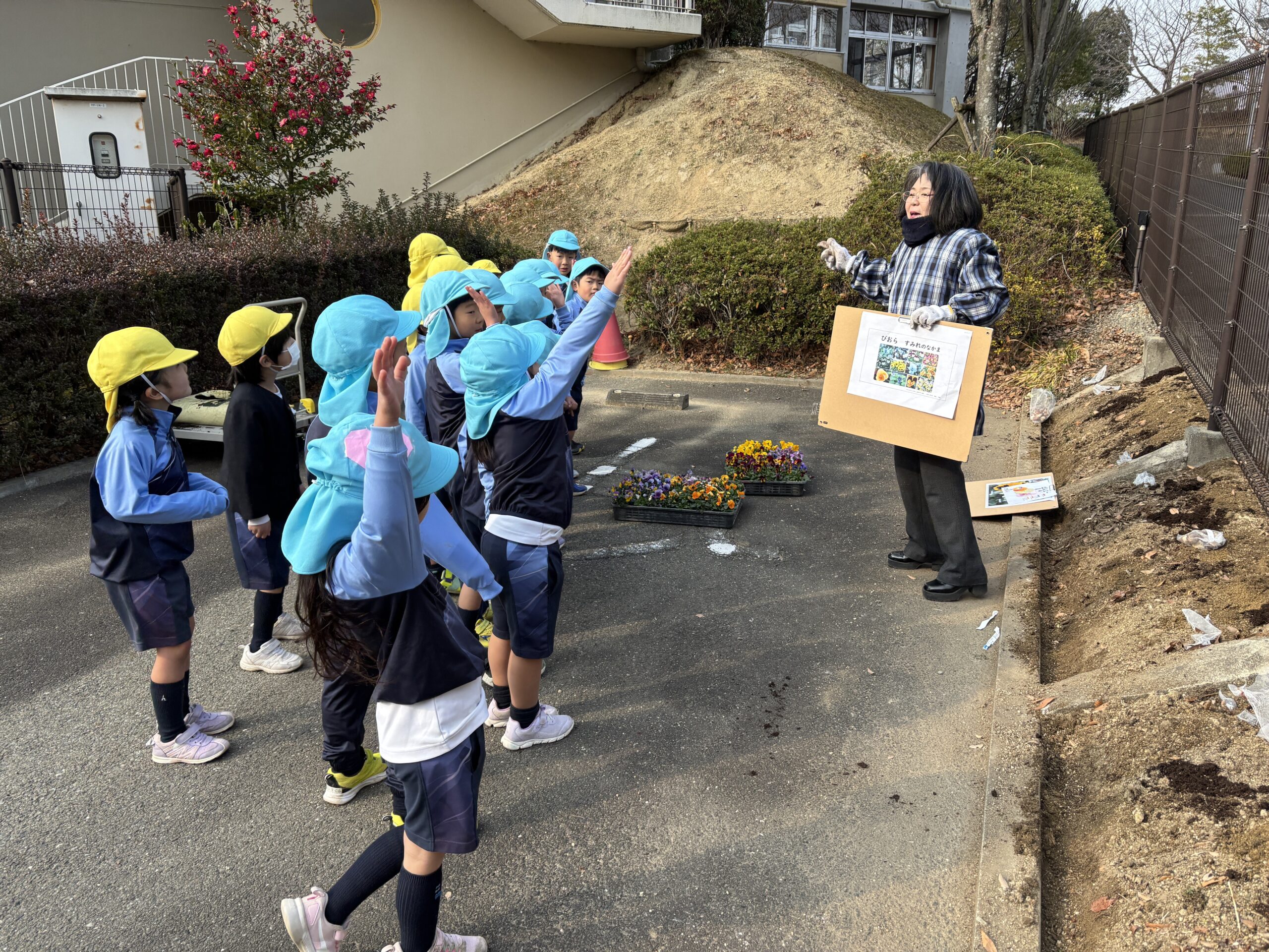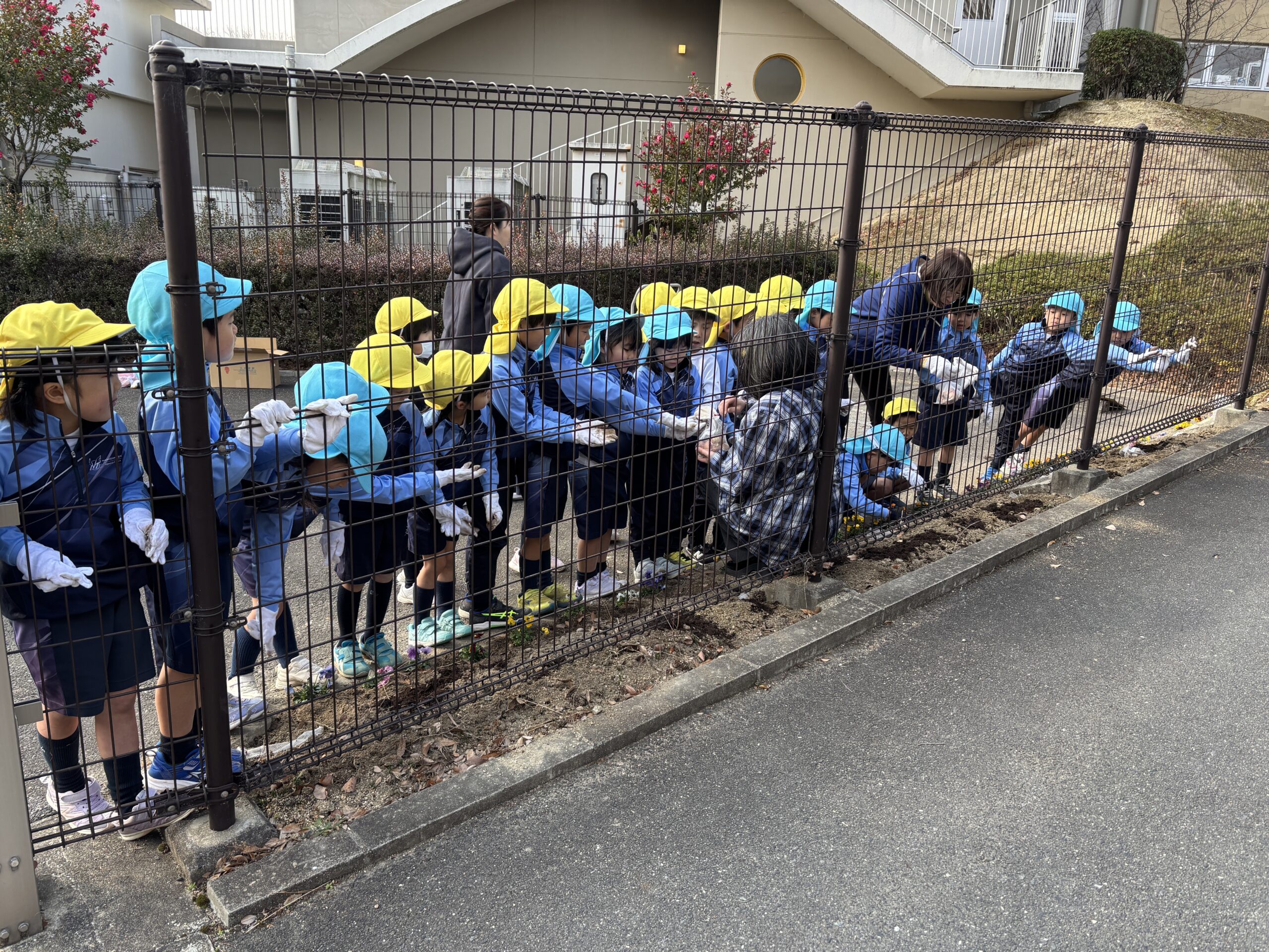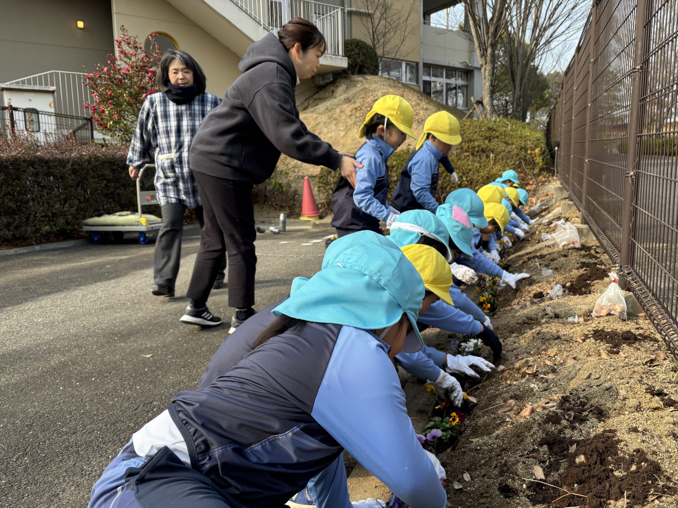 奈良学園大学 人間教育学部の高岡昌子先生が、共同研究の一環として、昨年度から幼稚園玄関前のフェンスそばの一角に、年中組の子どもたちと交流しながらお花を育ててくださっています。12月末には、育友会館近くの場所に、年中組の子どもたちがパンジーやビオラなどの花苗を植えさせてもらいました。