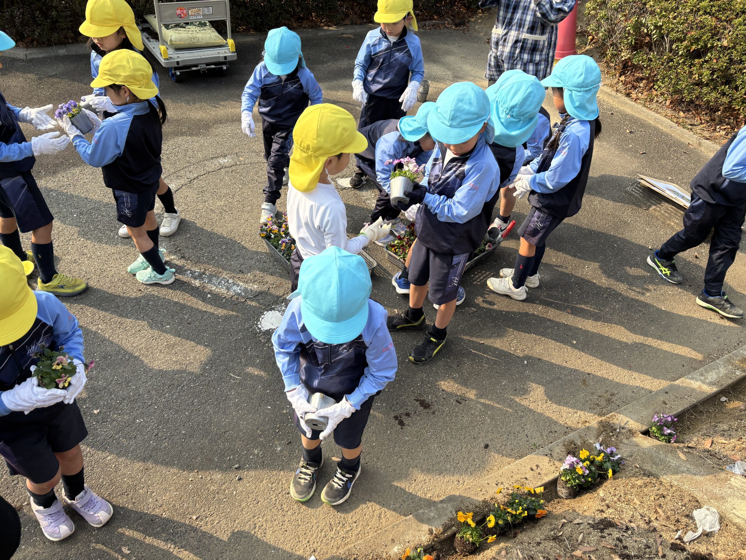 1月31日(金)、前回まだ植え替えができていなかった場所に、年長組の子どもたちが花苗を植える作業を行いました。昨年度からずっとお世話になっている高岡先生から植え方を教えていただき、みんなで手分けして花苗を植えることができました。卒園前に、また一つ良い思い出ができたことと思います。