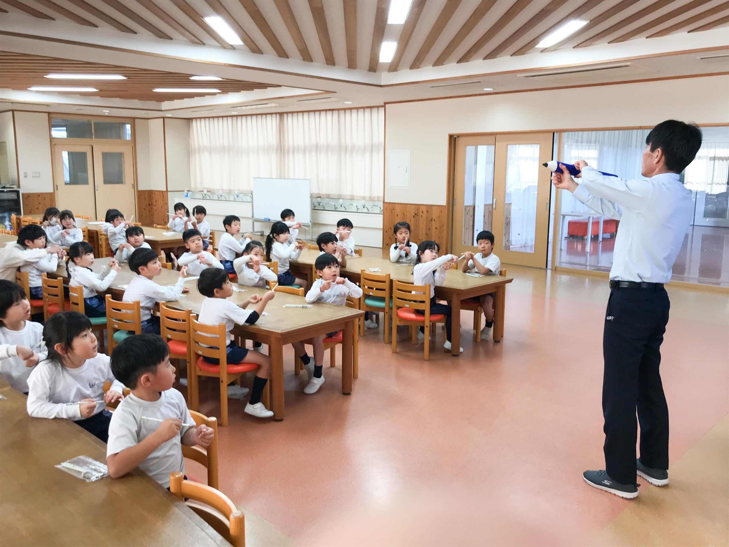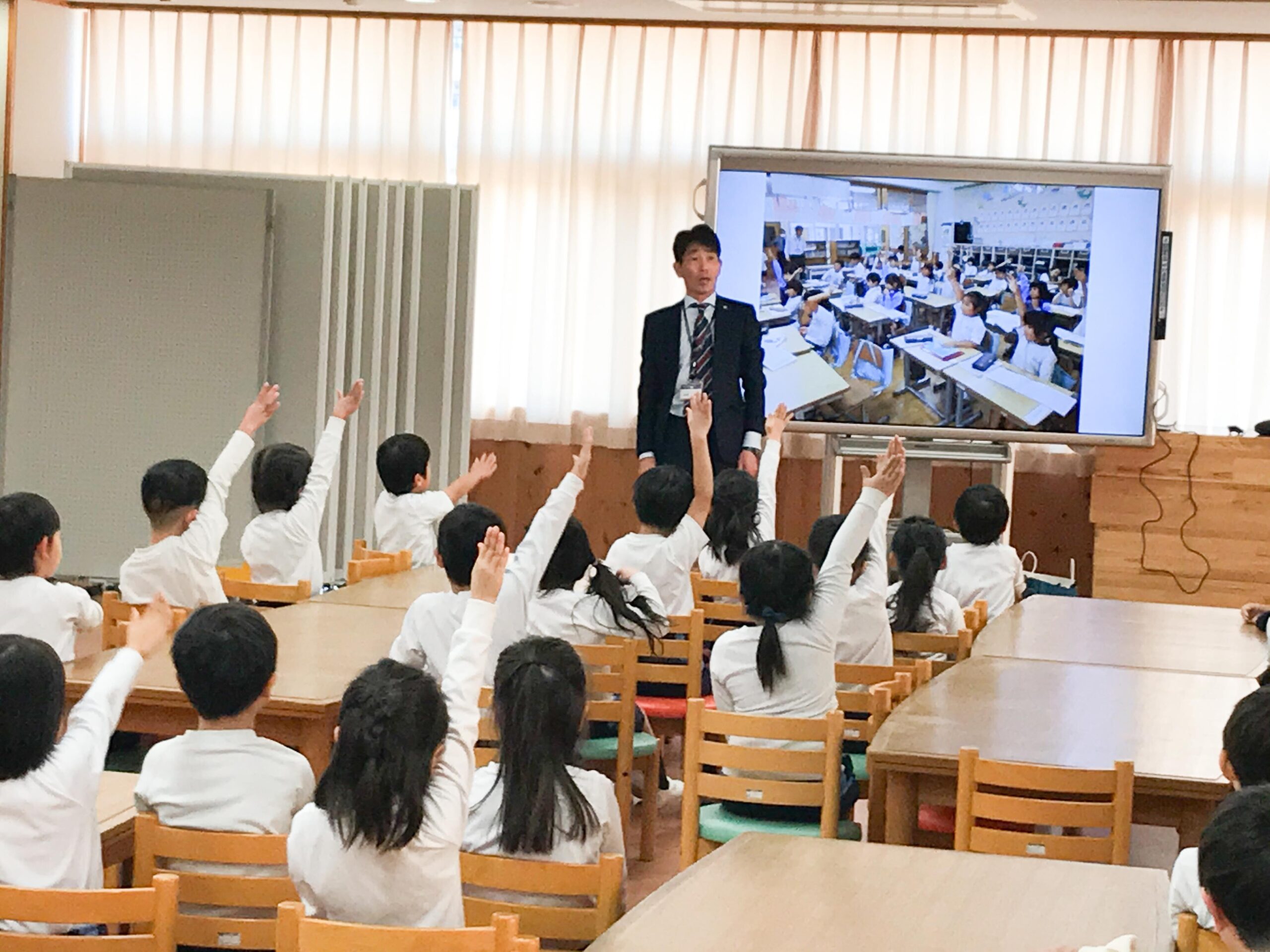 小学校へ入学する日が近づいてきた年長組の子どもたち。1月29日(水)、奈良学園小学校内にあるPMダイニングにお邪魔して、高塚校長先生から小学校の様子を教えていただく時間をもちました。楽しい学習活動や学校行事、遊び時間の過ごし方など、どの小学校でも行われている内容を中心に、わかりやすく丁寧に説明してくださいました。