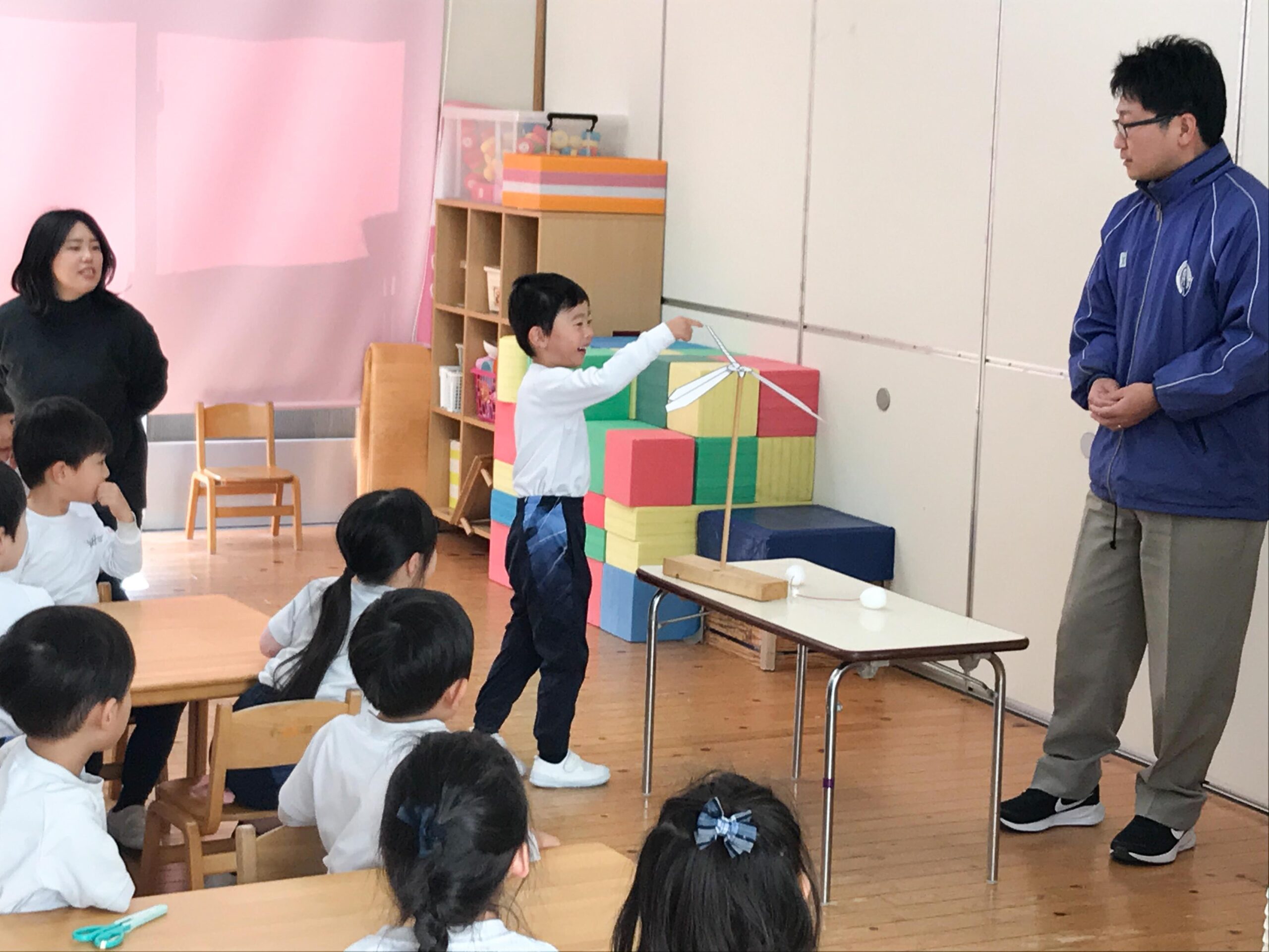始めに、福呂先生が用意してくださったやじろべえを見て、そのしくみを教わります。とんぼの形をしたやじろべえには、子どもたちも大喜び。指名を受けた子が、柱の真ん中にそっと置くと、拍手が起こりました。