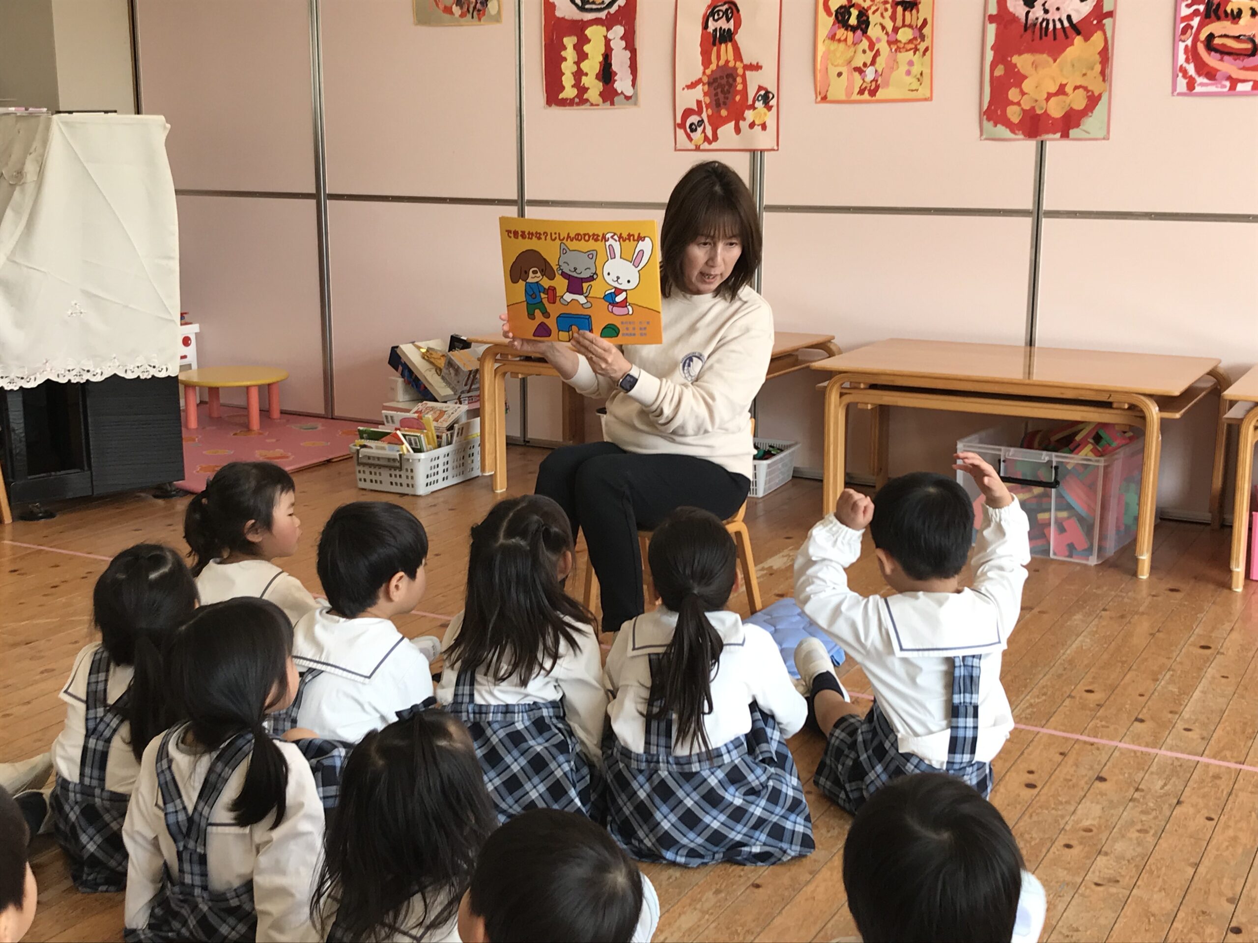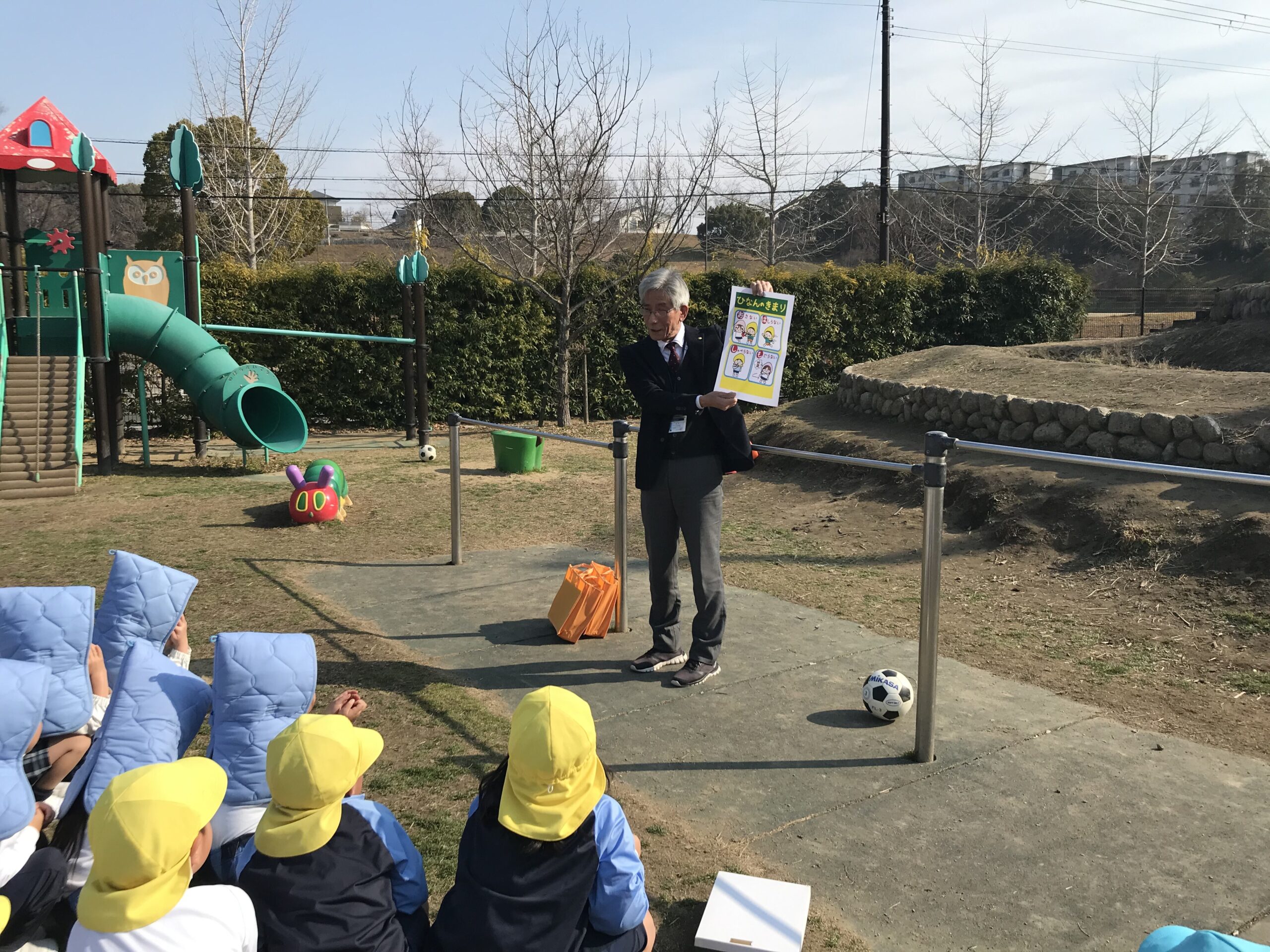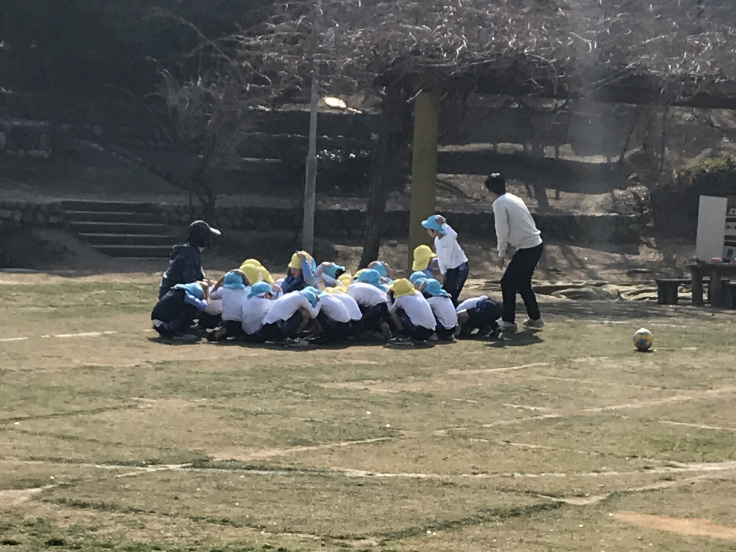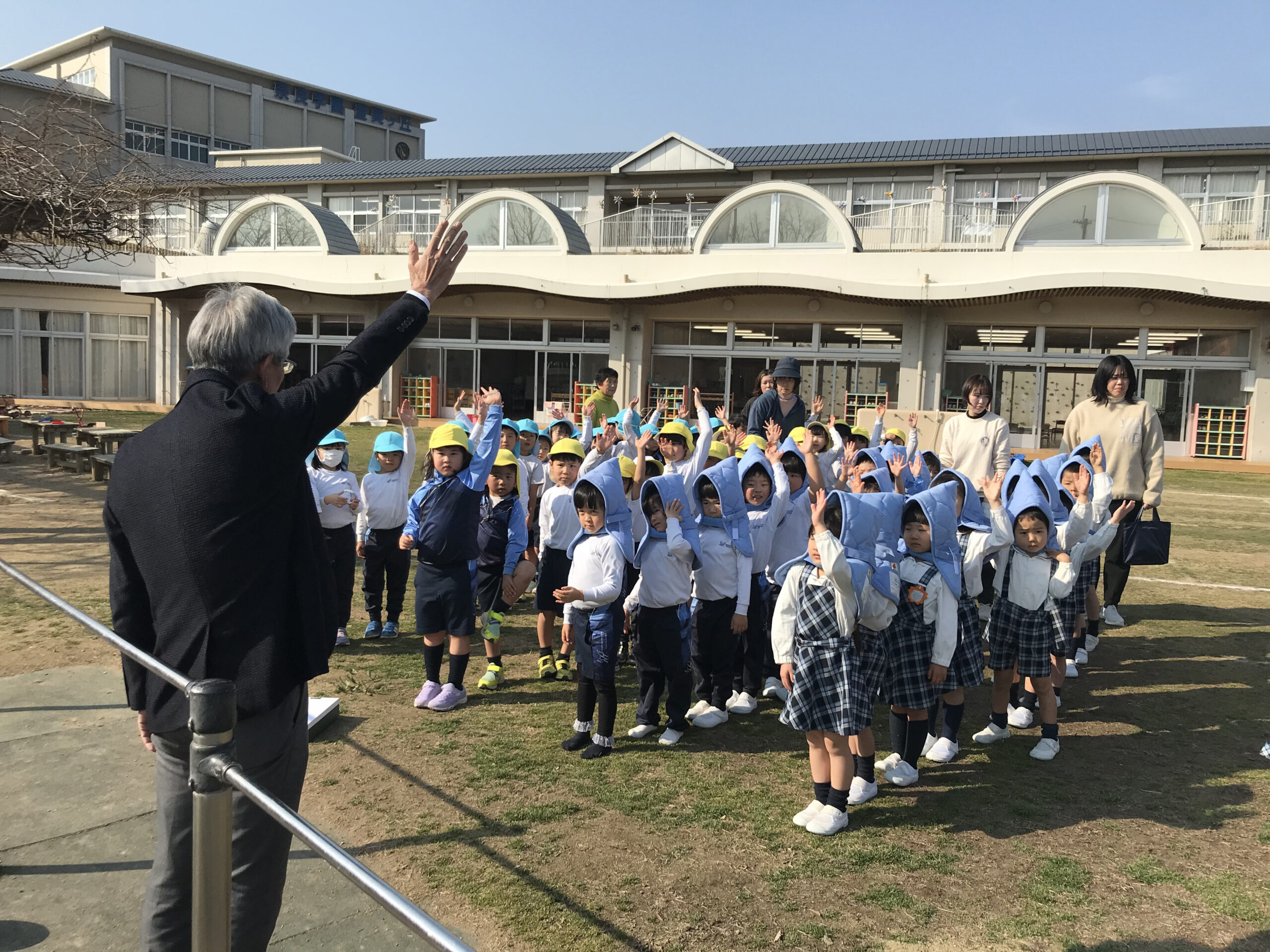 今回は、年長組の園児が園庭に、年少・年中組の園児はお部屋にいる時間帯に訓練を行い、一連の行動を確認する機会としました。