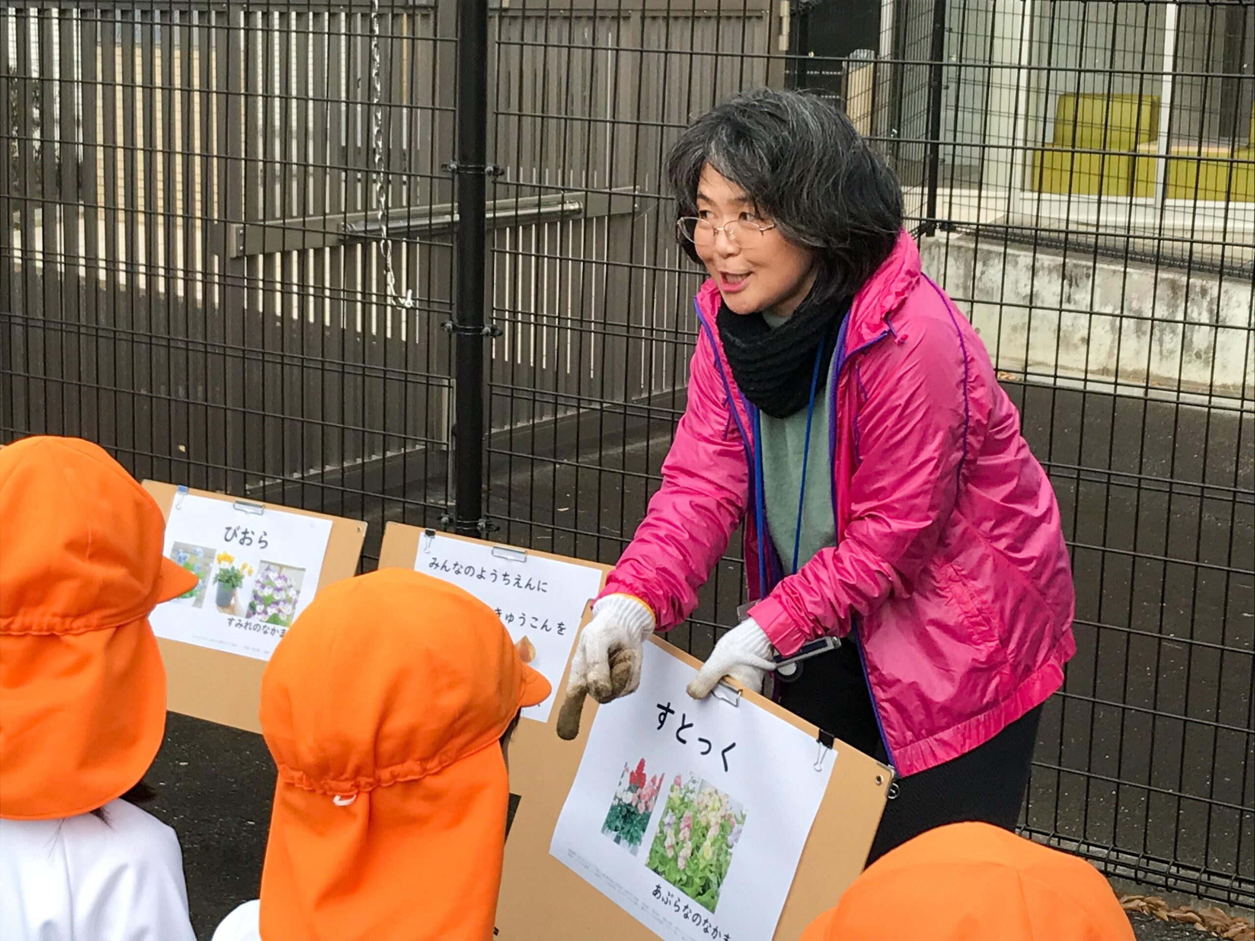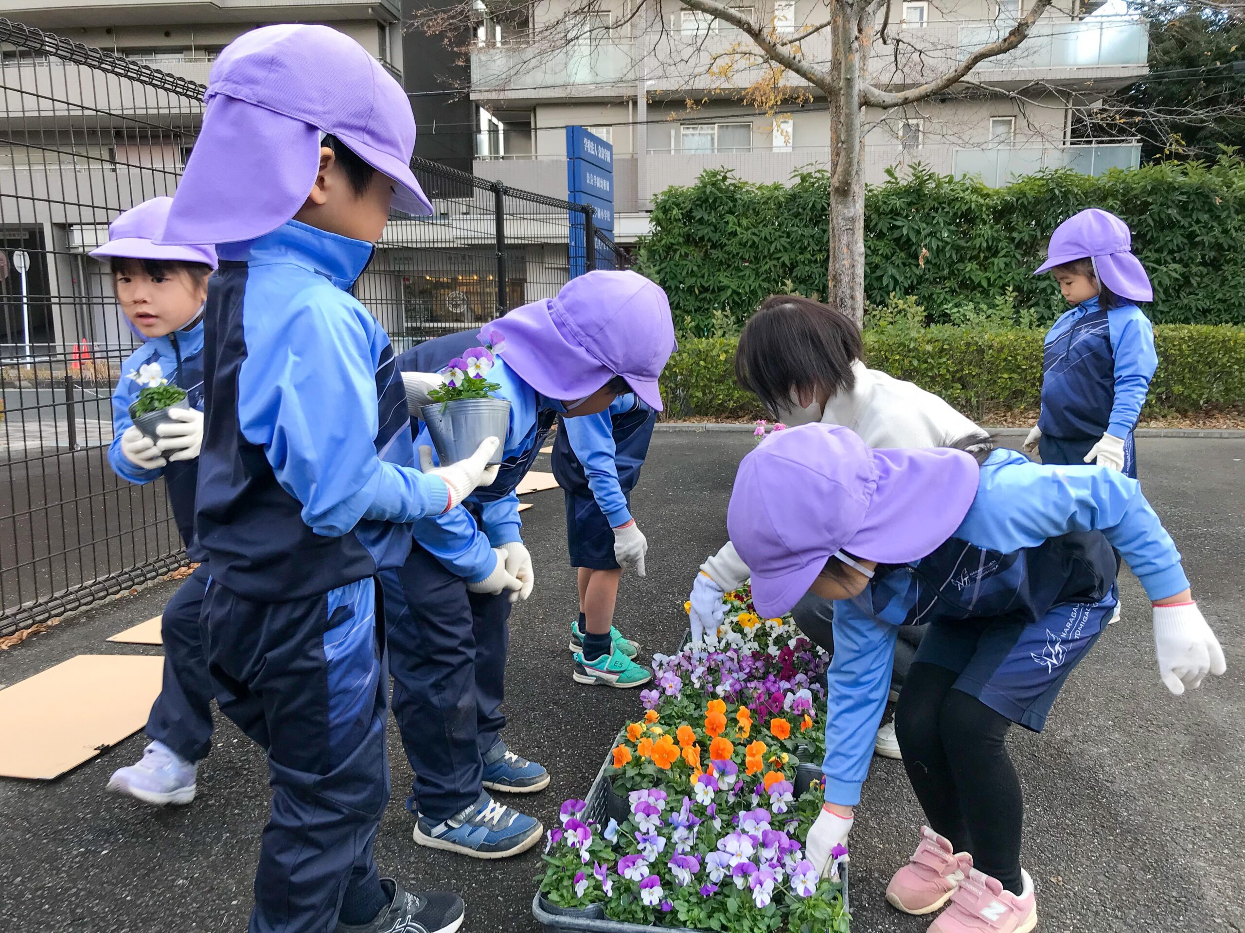 また、先日植え付けが終わっていた園庭バタフライガーデンの周囲にも、ビオラの花苗などを植えてくださって、とても華やかになりました。
