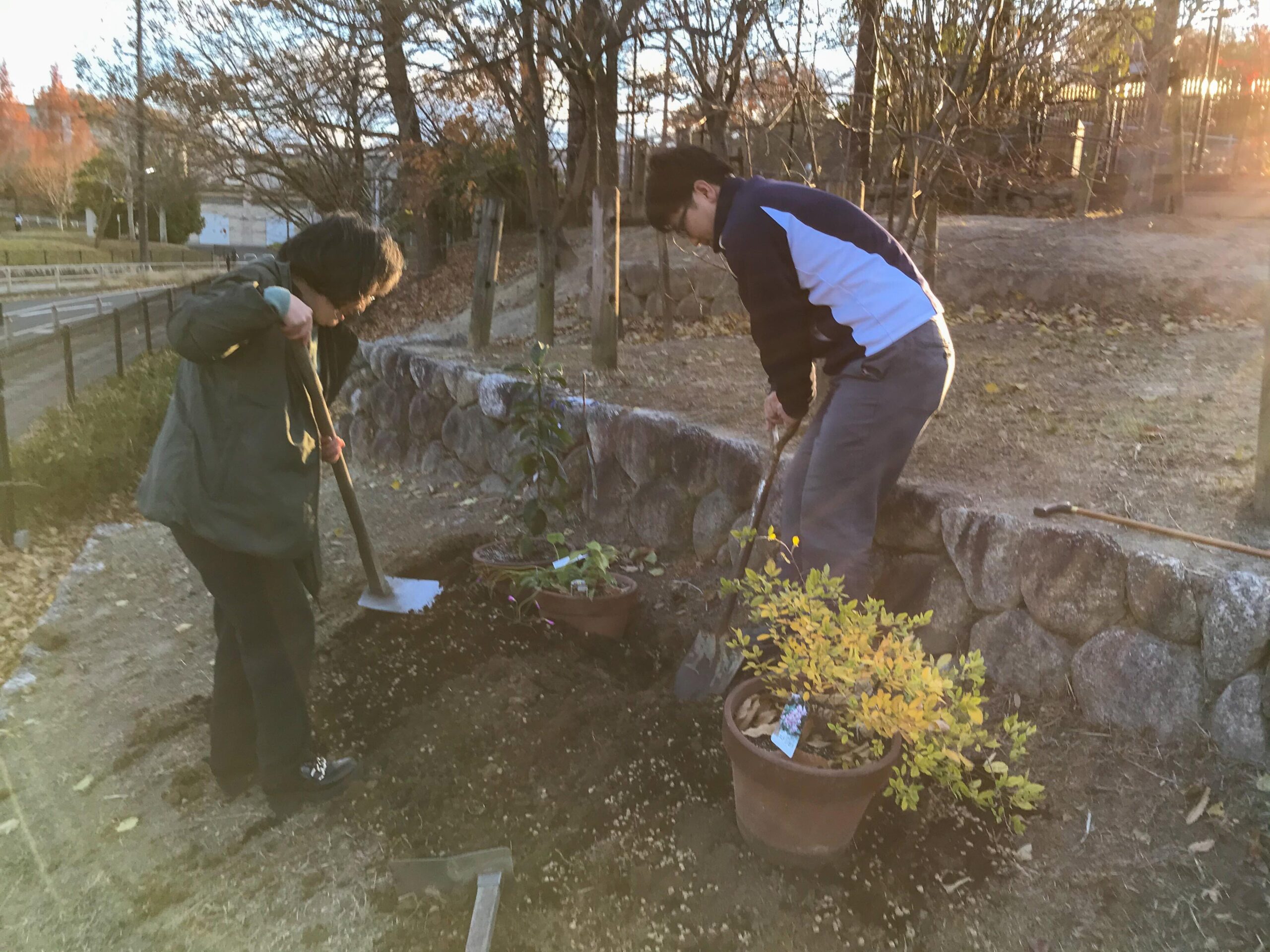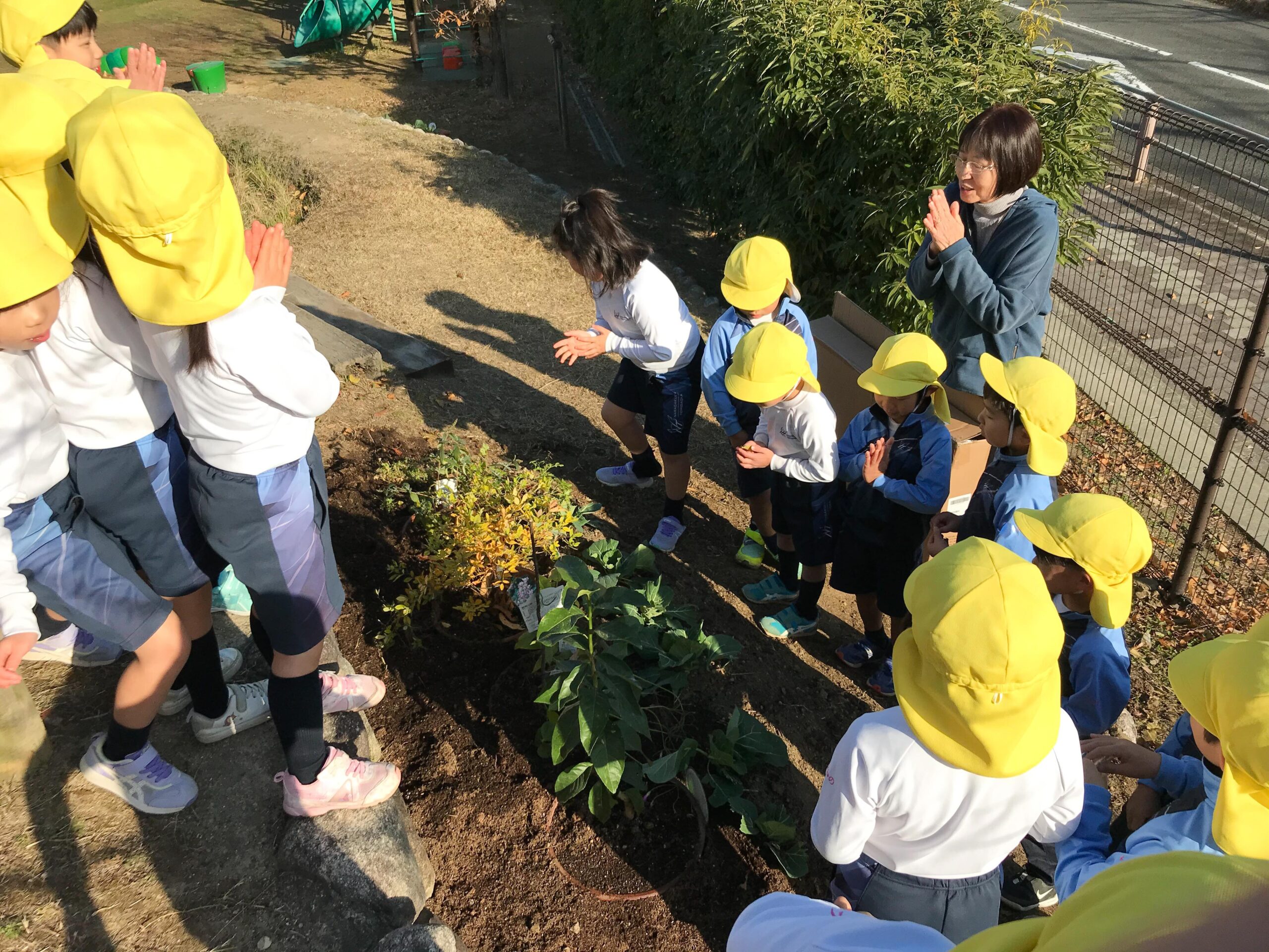 12月16日(月)午後に、高岡先生と奈良学園小学校の先生が、棚田の横あたりに、トゲナシレモンや朝倉サンショ、ズットレアなど、様々な種類の草木を植えてくださいました。草木の種類によって、集まってくる蝶が違います。翌日の17日(火)には、年長組の子どもたちが「元気に育ってくれますように」とお祈りしていました。
