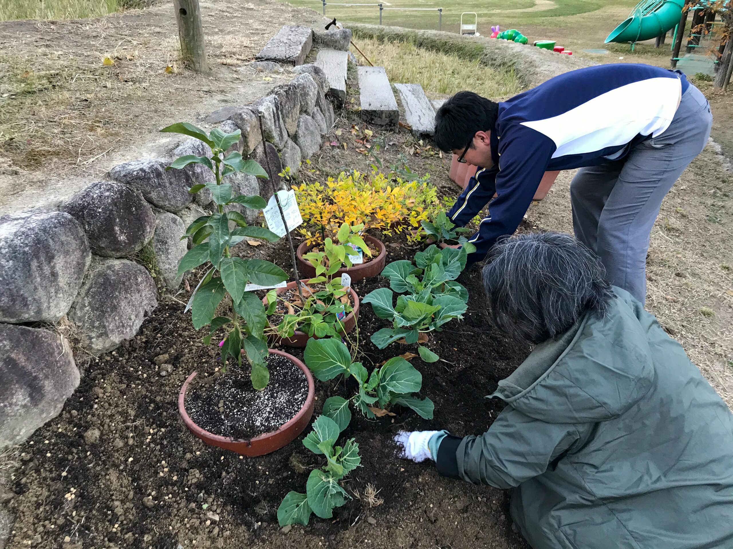 奈良学園大学との共同研究事業の一環として、大学の高岡先生監修のもと、花苗の植え付けや生き物観察会などを通して、自然と触れ合う機会を設けてきました。今年度はそれに加えて、蝶を園庭に呼び寄せたいという思いから「バタフライガーデン計画」と名付け、取組を進めていただいています。