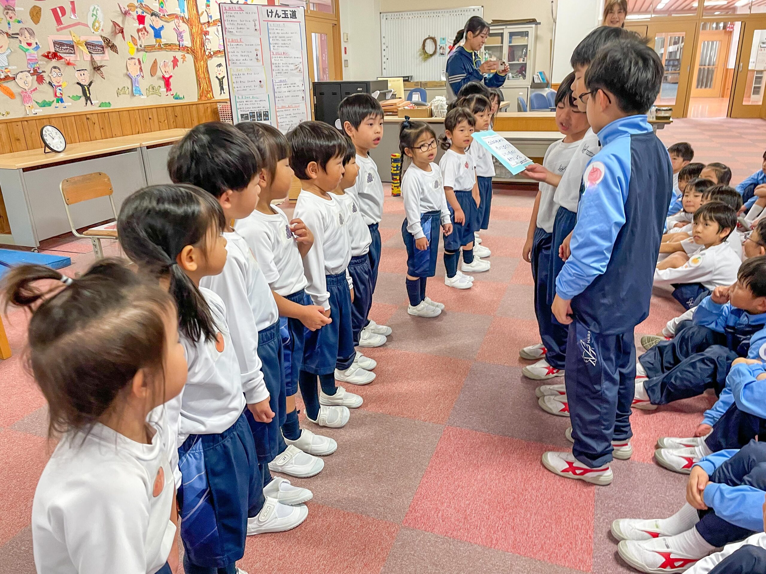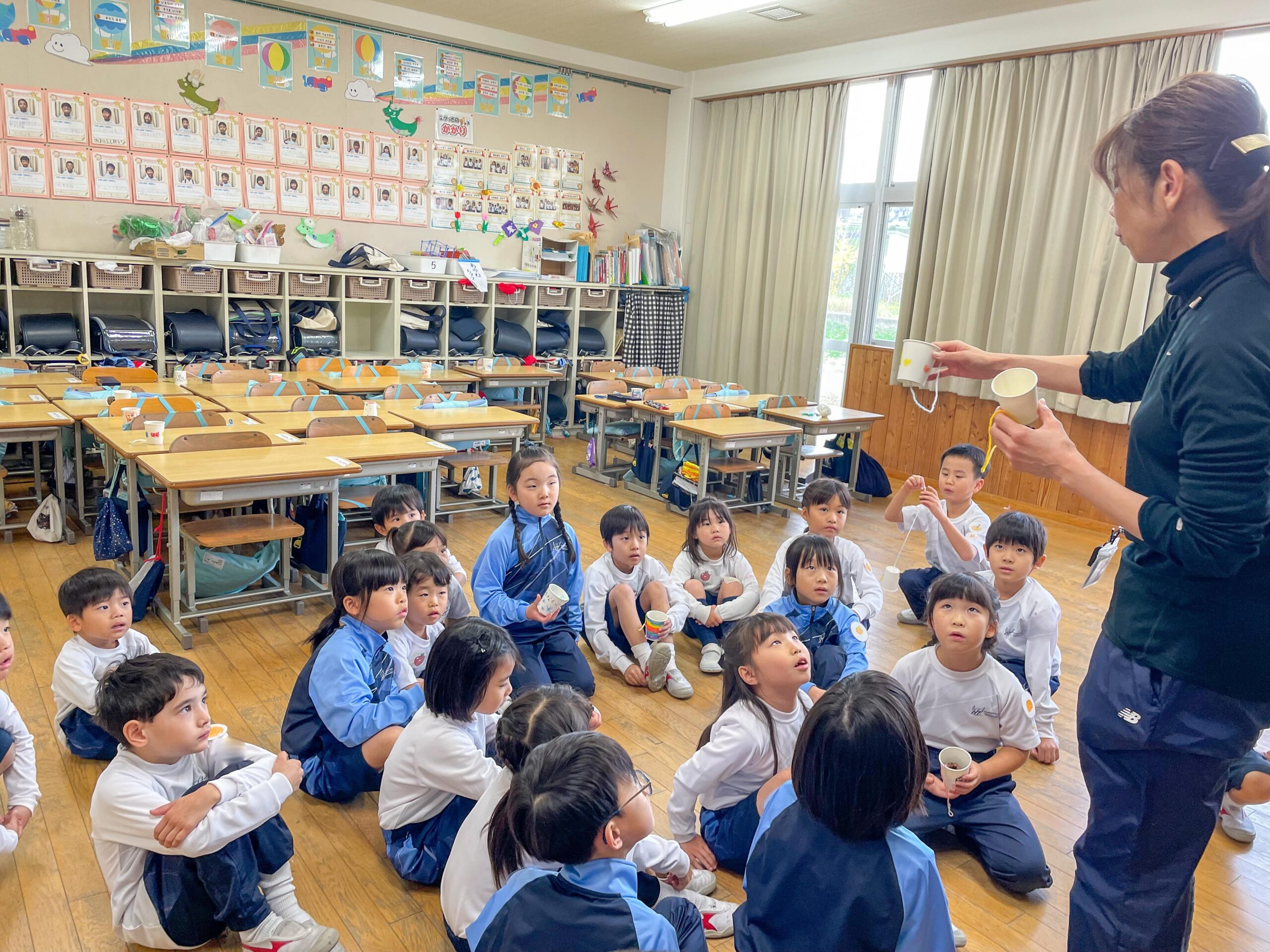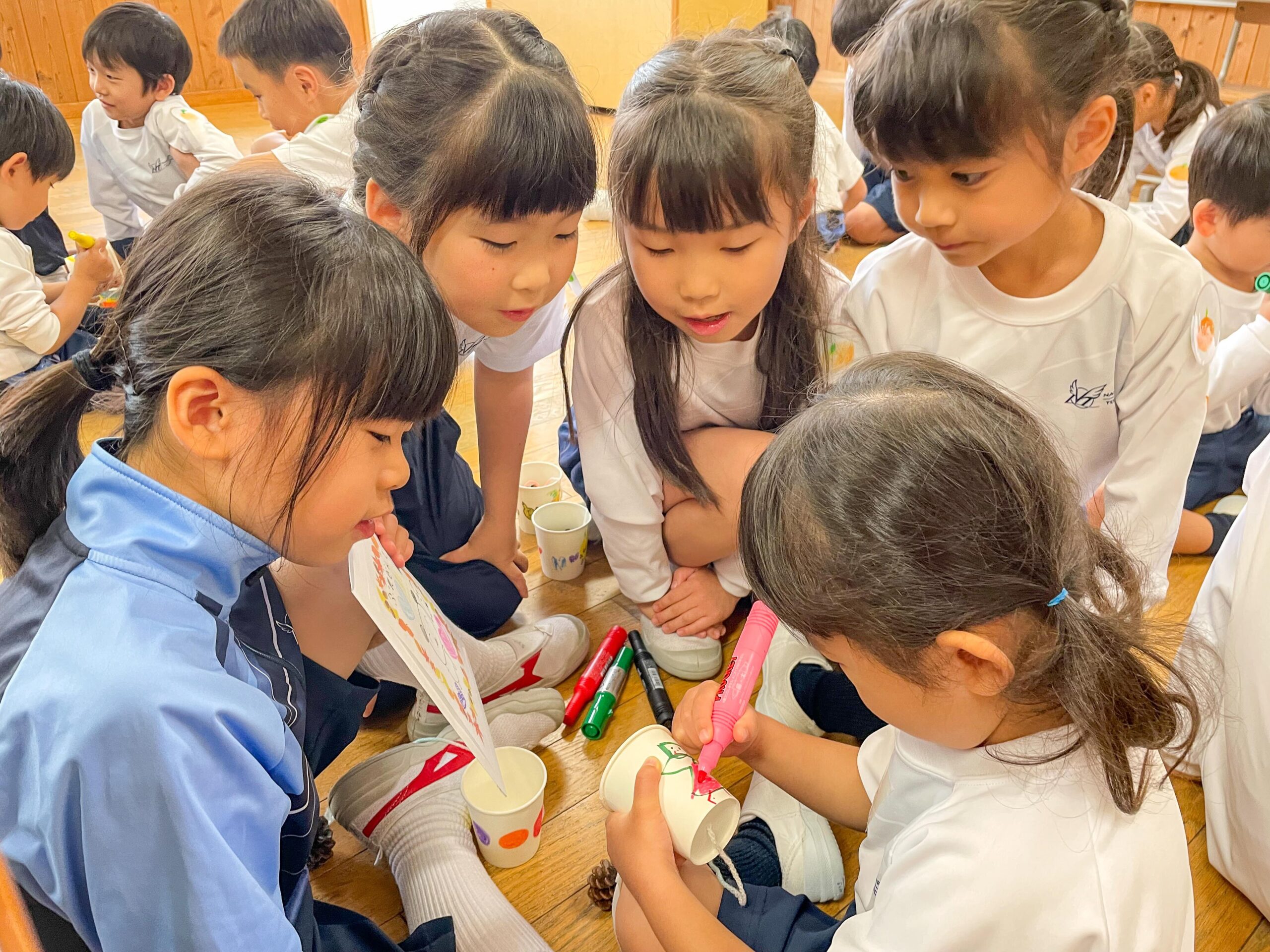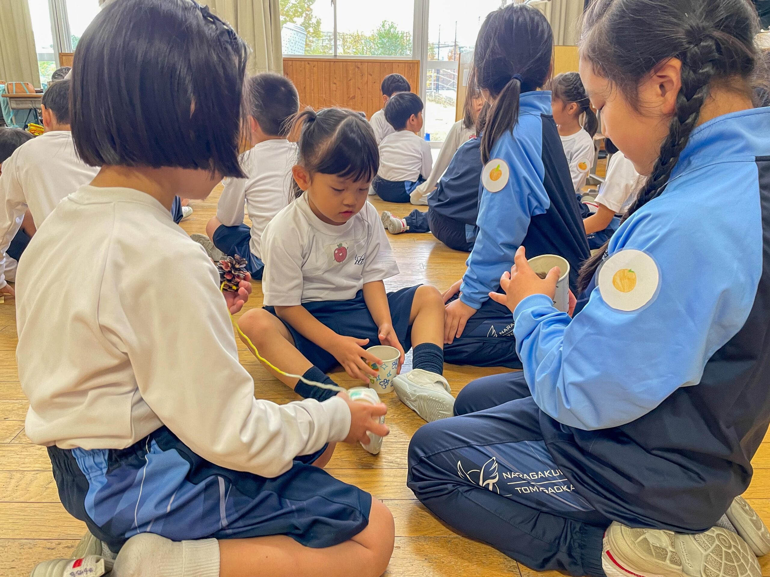 PP1-P1交流会 2024.11.29(金) Tweet 11月26日(火)年少組の子どもたちが小学校に出向き、1年生と交流会を行いました。 まつぼっくりを使ったけん玉作りは、1年生に手伝ってもらいながら組み立てて、紙コップに自分で絵を描きました。 他にもドングリゴマやカプラなど、遊び方を優しく教えてもらいながら、一緒に遊びました。お土産ももらって大満足。とても楽しい交流会になりました。 « 自由参観日 交通安全教室 »