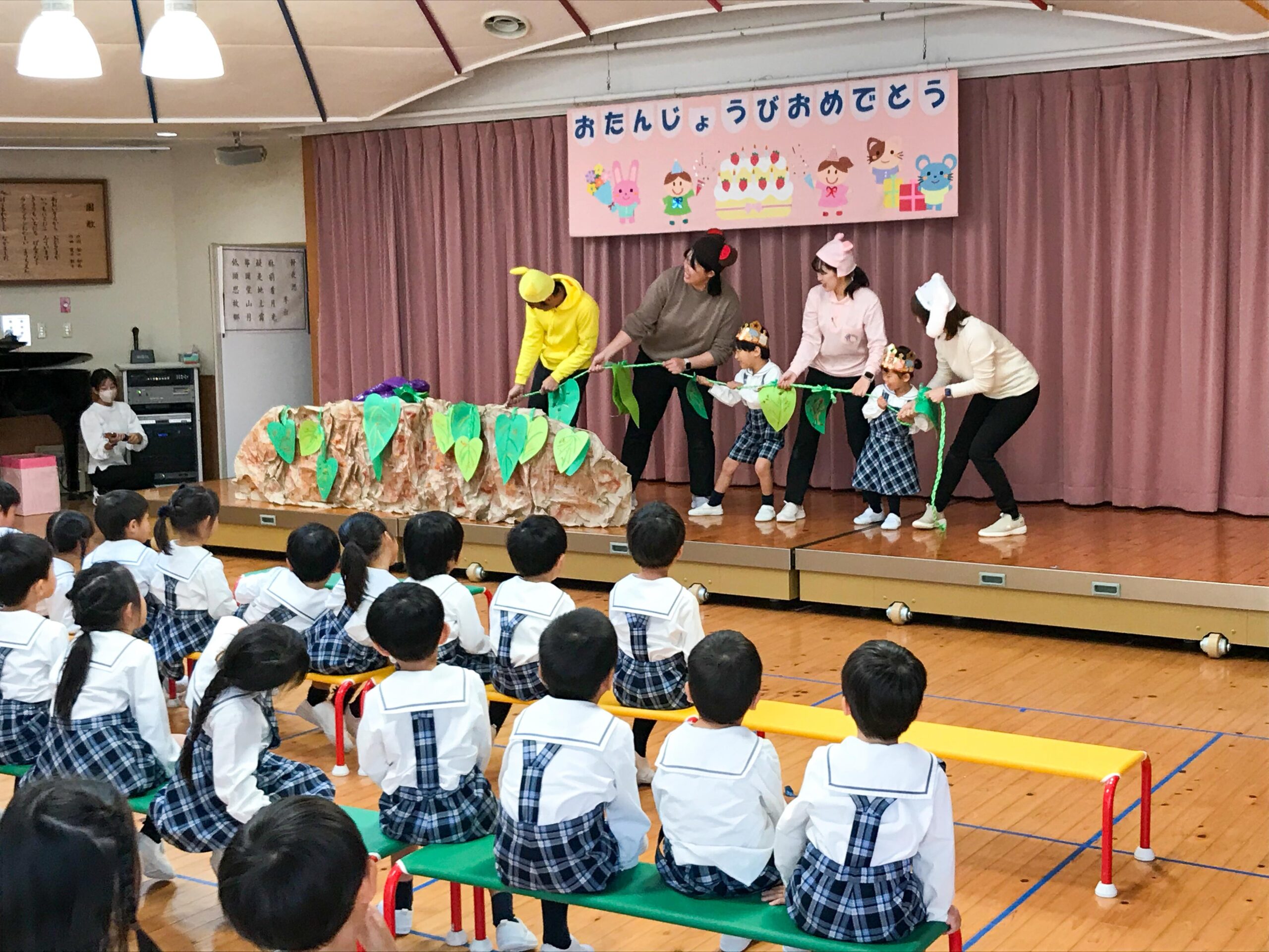 先生方からの出し物は、劇「動物たちの芋掘り」です。先生方がキツネ、クマ、ブタ、イヌに扮して、一緒にお芋を育て、力を合わせて収穫するというお話です。最後はお誕生日を迎えた2人のお友達の力も借りて、無事にお芋をゲット!会場は大いに盛り上がりました。