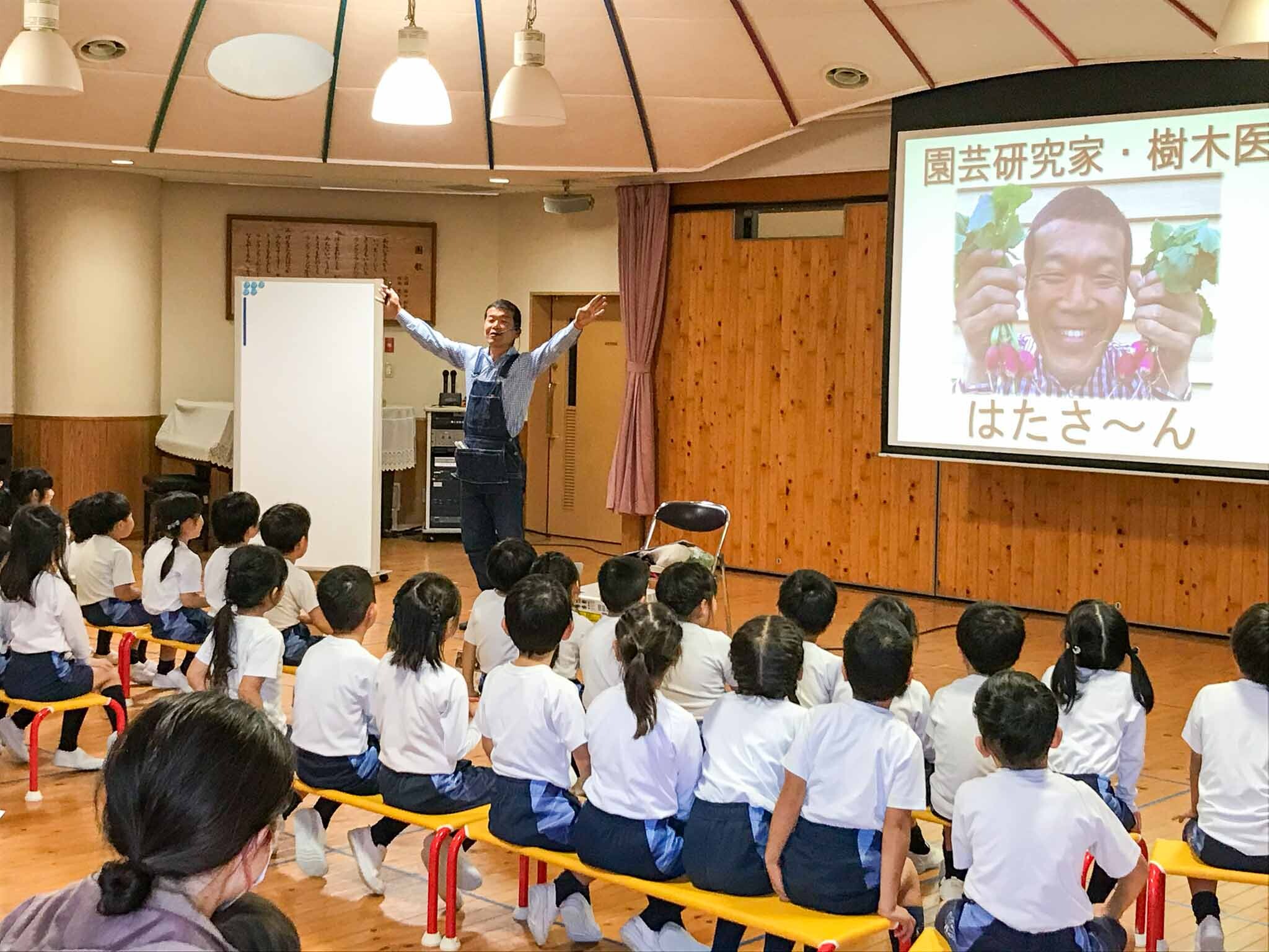 11月12日(火)園芸研究家・樹木医の畑明宏さんを講師にお招きして、年長組親子対象の「身近な生き物観察会」と保護者の方対象の「講演会」を行いました。