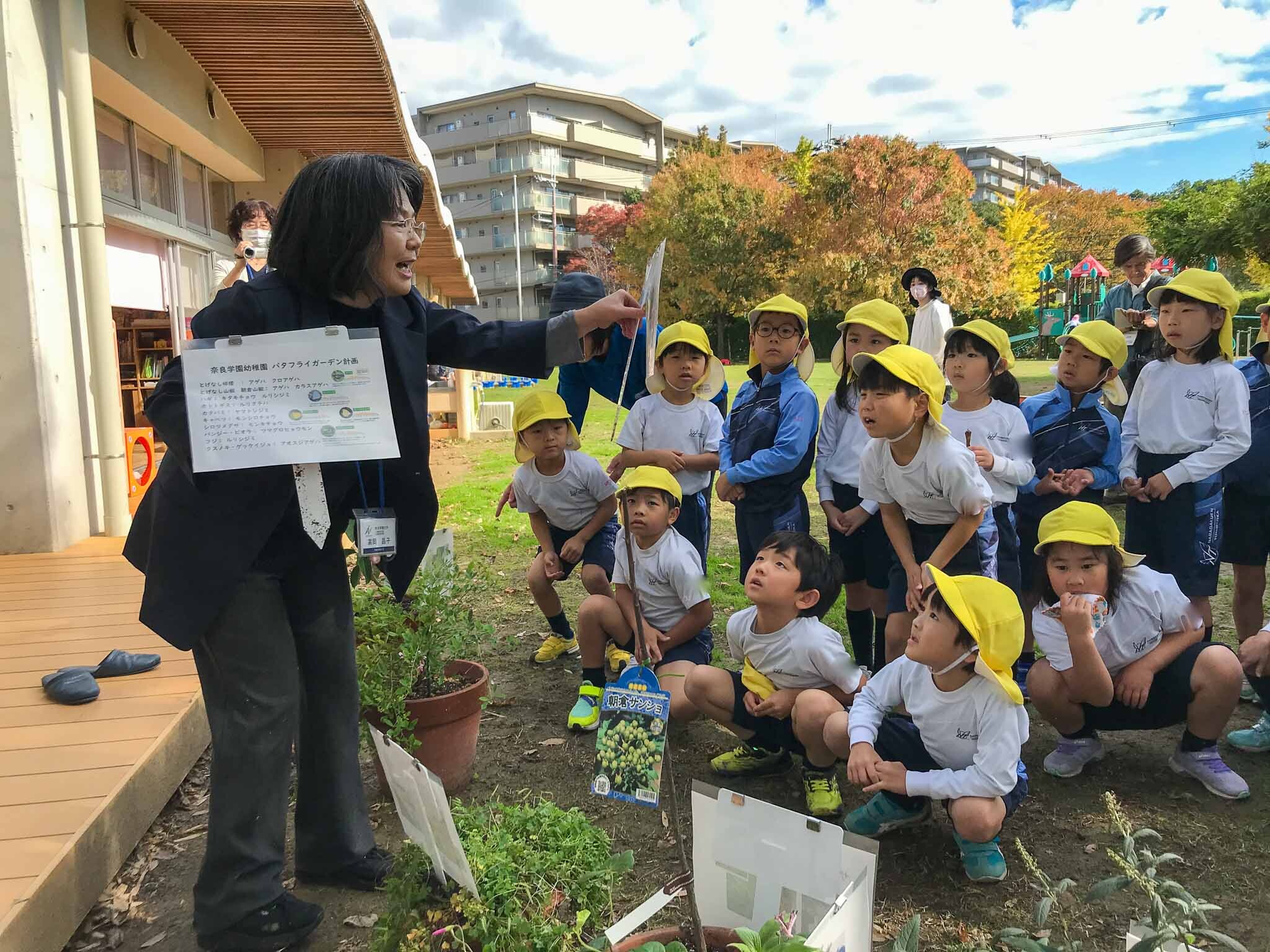 遊戯室に集まった、年長組の子どもたち。始めに畑さんの自己紹介や、昆虫についてのお話を聞きました。奈良学園大学の高岡先生からは、「バタフライガーデン計画」のために準備された鉢植えの紹介をしてくださいました。