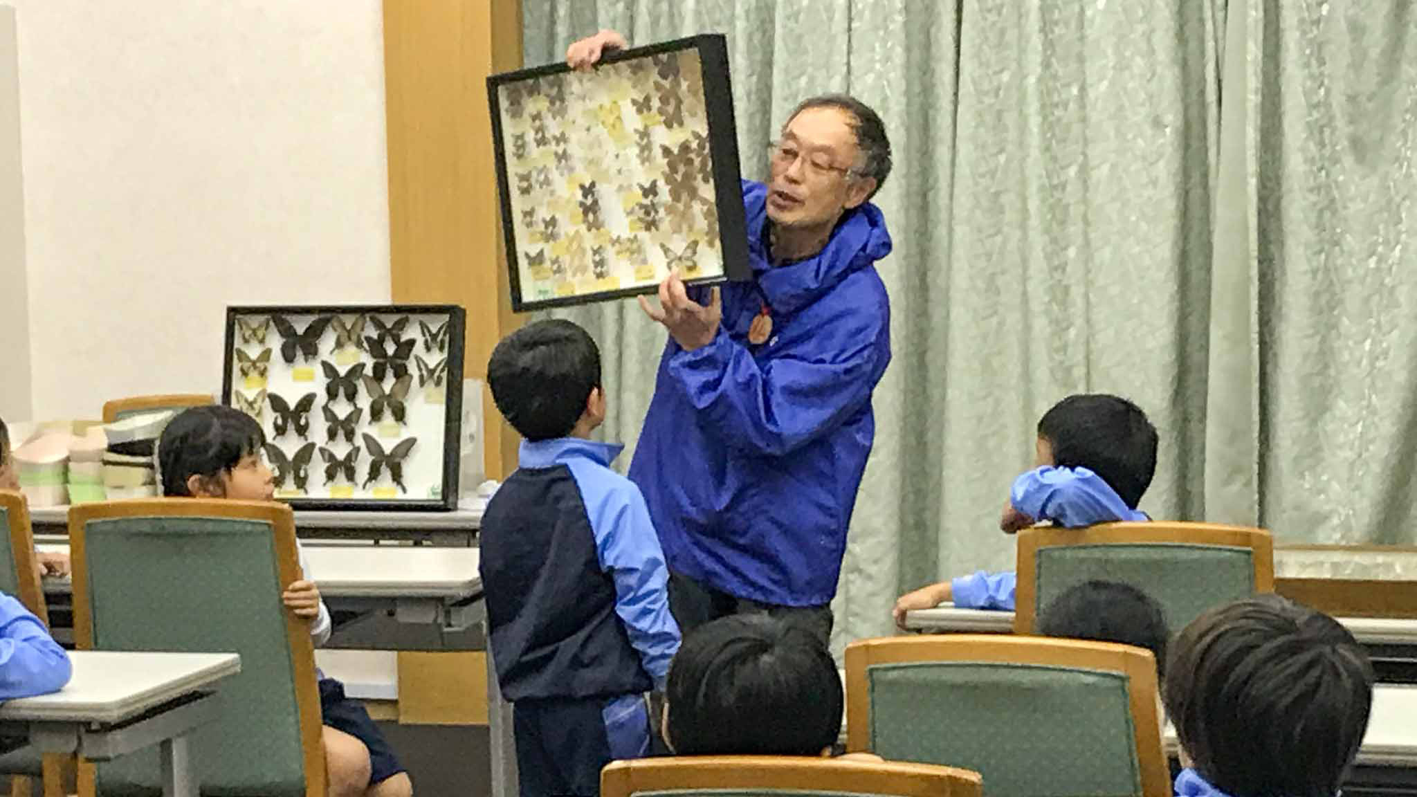 ボリューム満点の朝食をとってから、会議室で森にすむチョウについて教えていただきました。次は、自然物を使った制作の時間です。幼稚園の先生や講師の先生方にお手伝いしてもらいながら、作品作りに取り組みました。