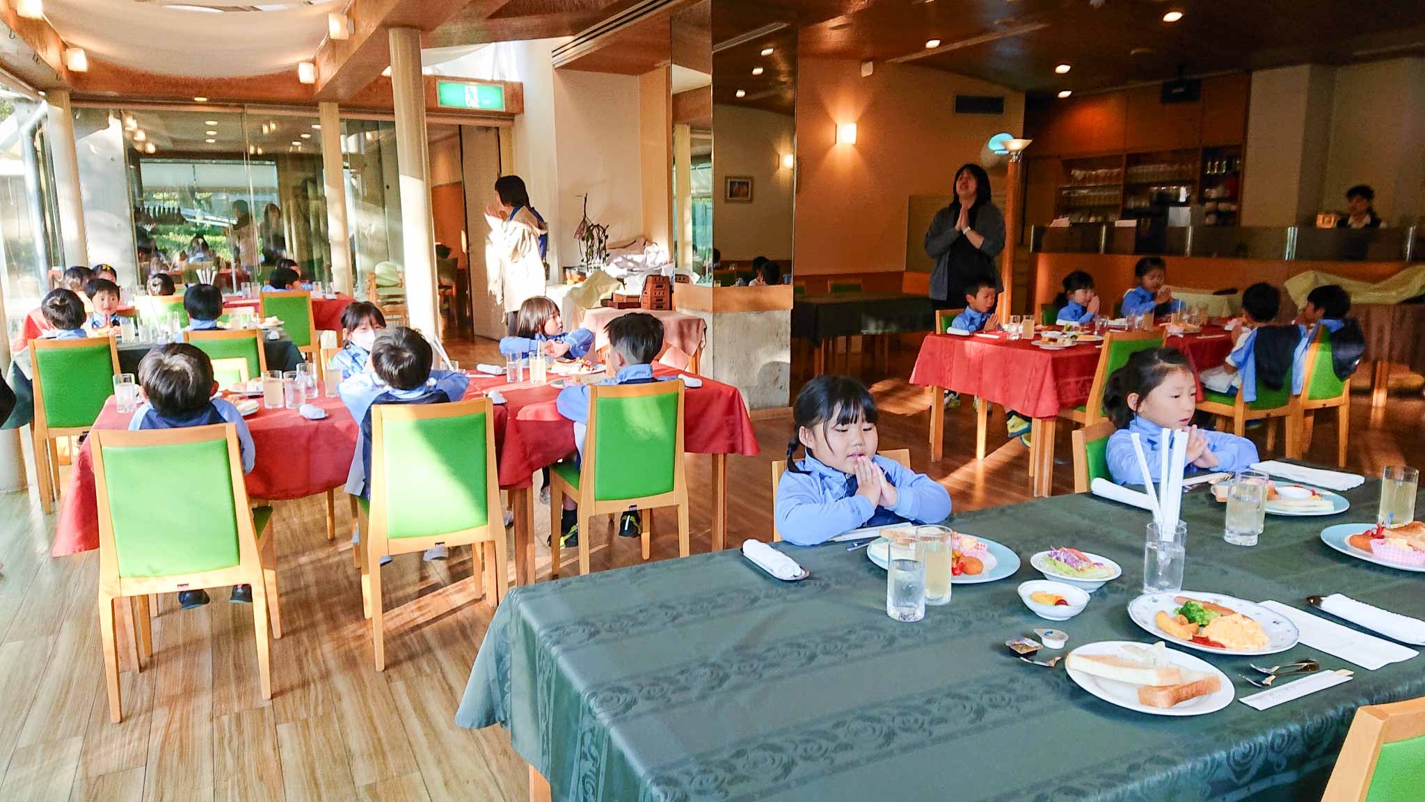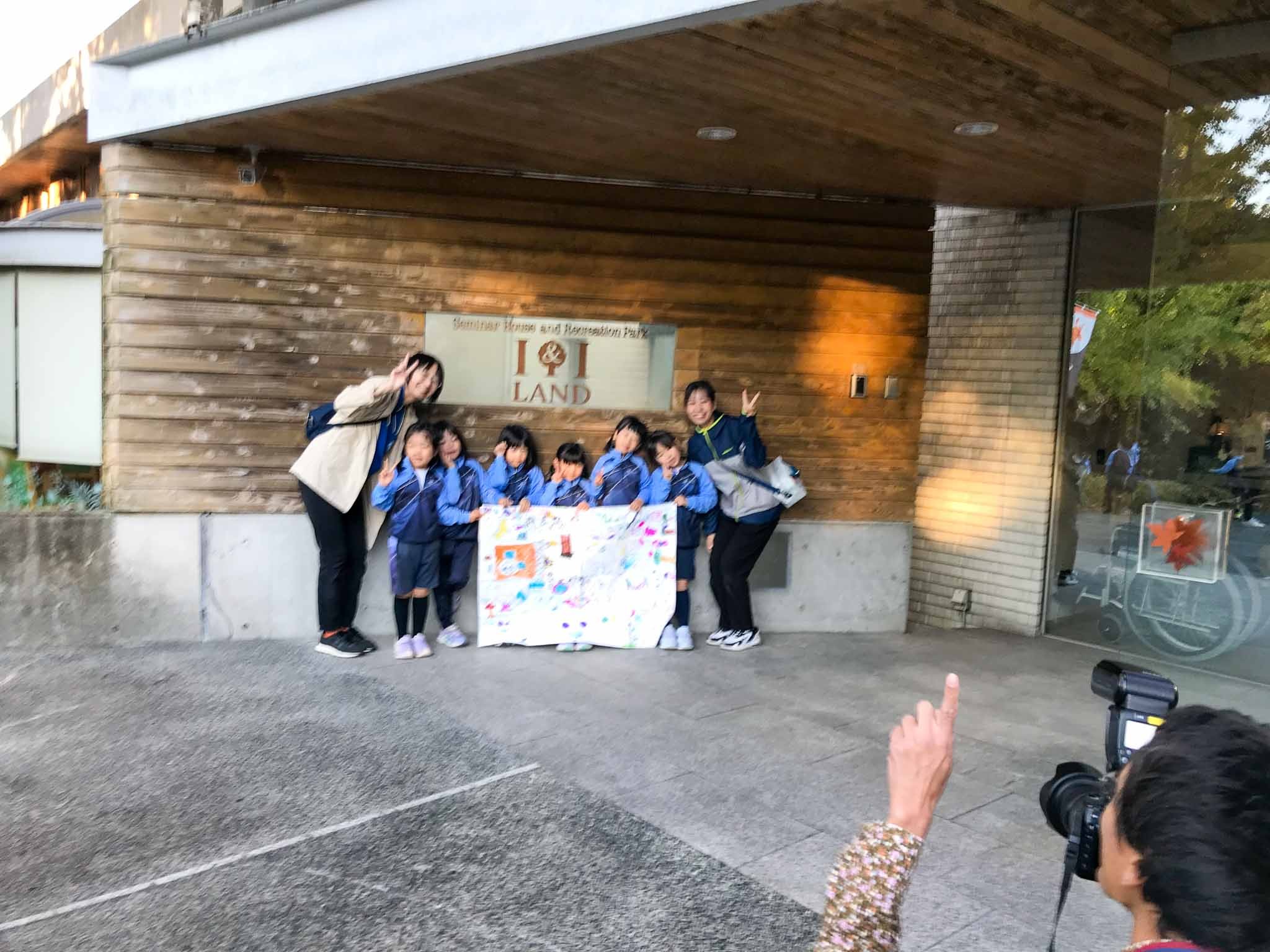 お泊まり保育2日目。朝6時半に起床して身支度を調えてから、玄関前に集まってグループでの記念写真を撮りました。肌寒い朝となりましたが、外を駆け回っている子がたくさんいて、みんな元気いっぱいです。