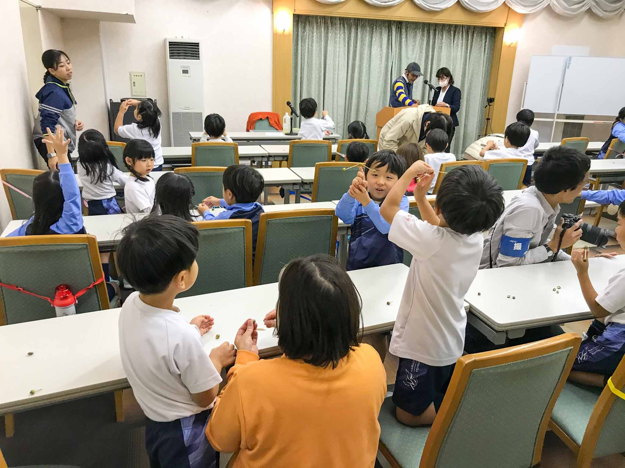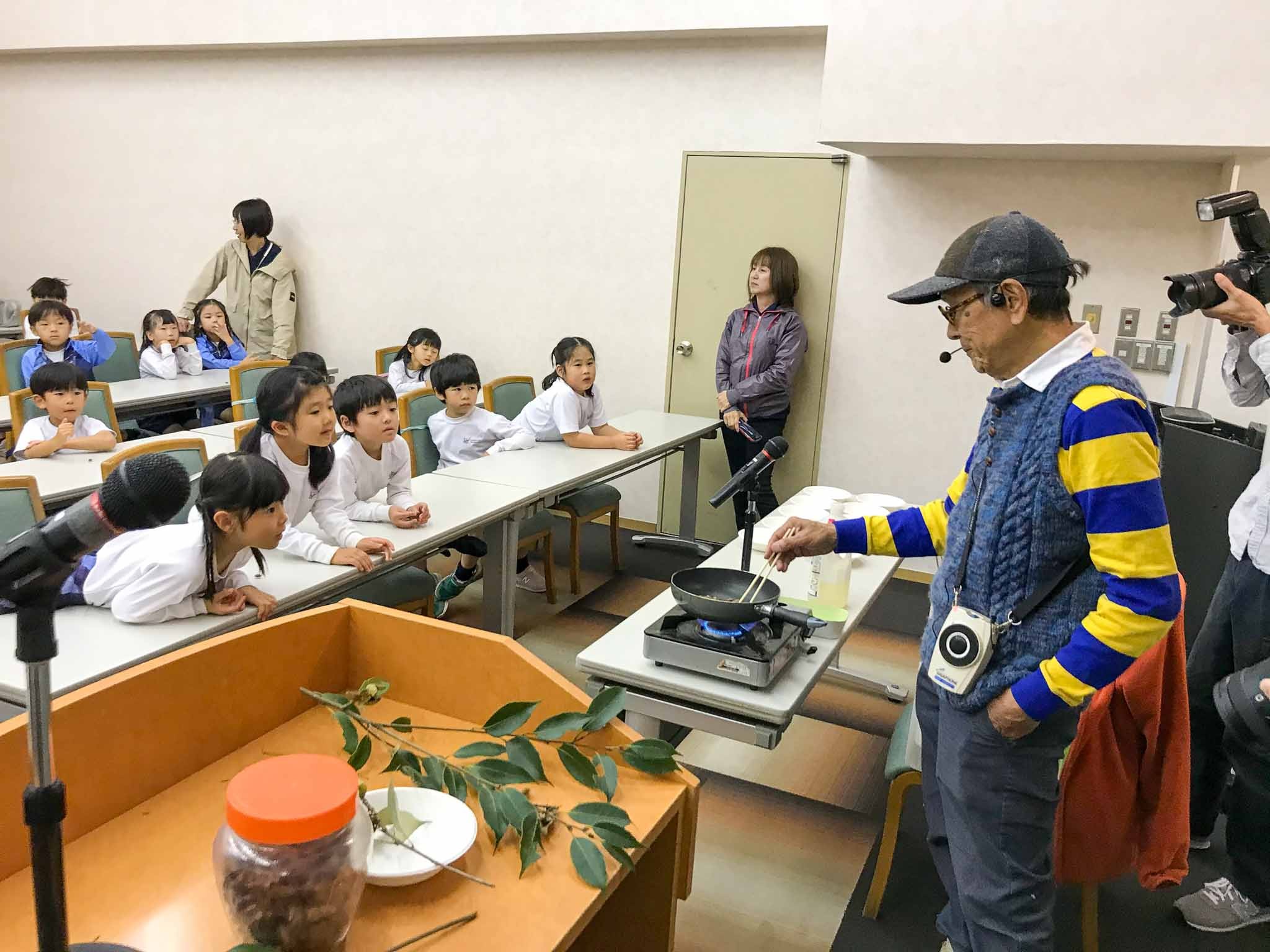 まず始めに、2日間お世話になる、講師の久保勝範先生から、野草などの植物や昆虫など、森に住む生き物について教えていただきました。炒ったり焼いたりしたどんぐり(椎の実)も試食させてもらって、子どもたちは大喜びです。次に、どんぐりを使ったコマとやじろべえの工作に取り組みました。