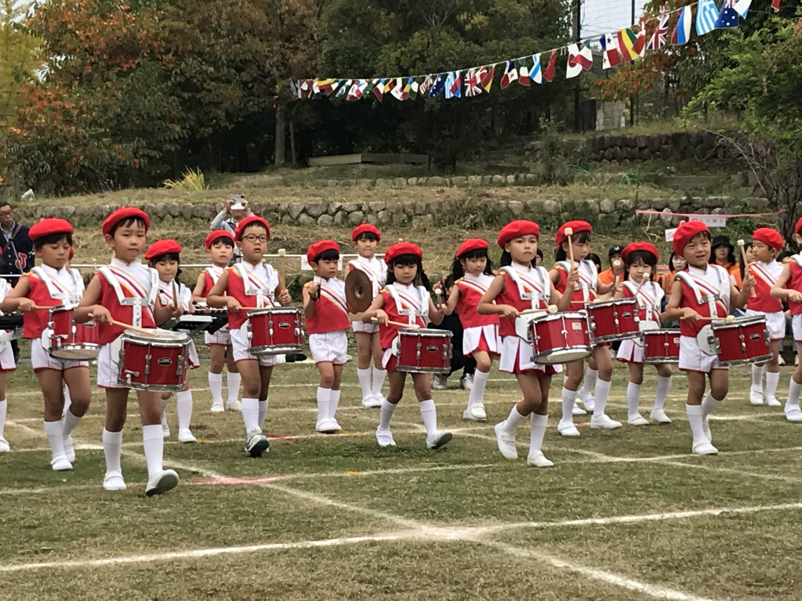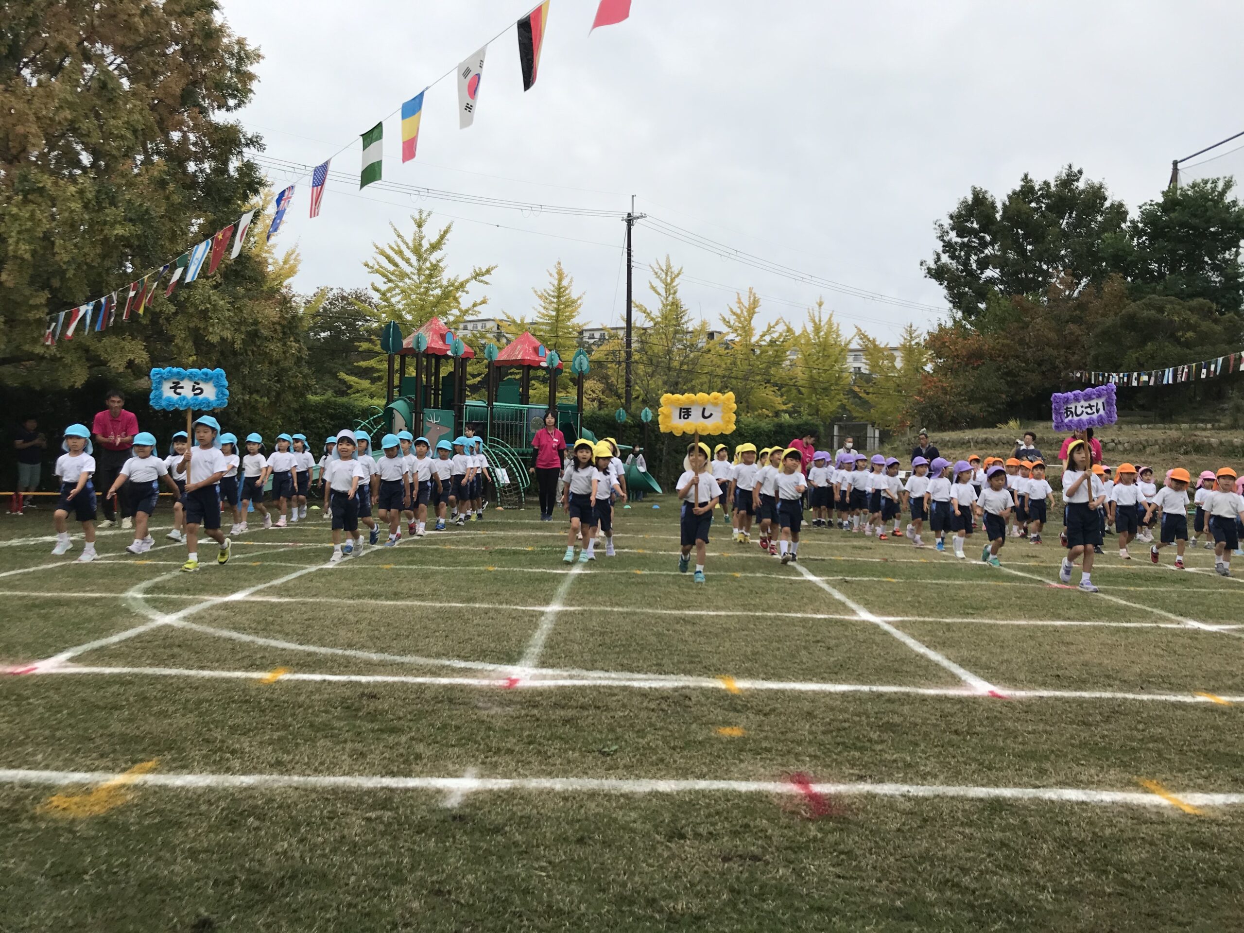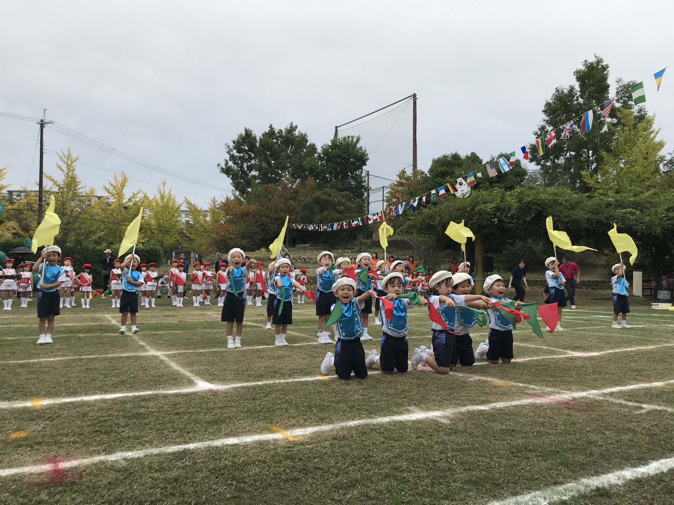 ちょっぴり緊張の面持ちも見受けられた開会式でしたが、「おはようございます!」のあいさつから、子どもたちは元気いっぱいです。準備体操から始まり、各学年のかけっこ、そして中盤最大の見所である年長組のマーチングと年中組のフラッグ。年少組も加わって全園児のコラボを披露しました。お家の方からの大きな拍手をもらい、大満足の子どもたち。