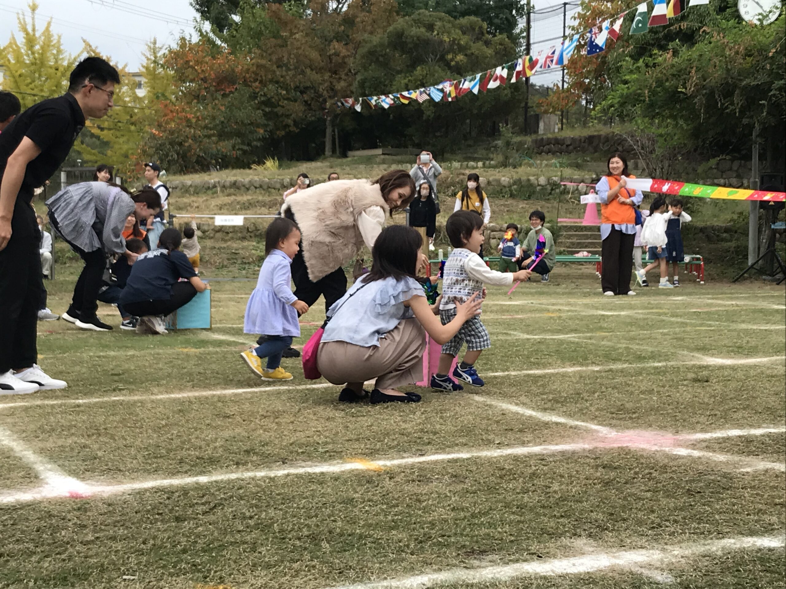 前半の最後は未就園児のかけっこです。お家の方のサポートも受けながら、かわいい姿で走ってくれました。「体験入園るんるんなとみん」でご参加いただいた皆様、ありがとうございました。