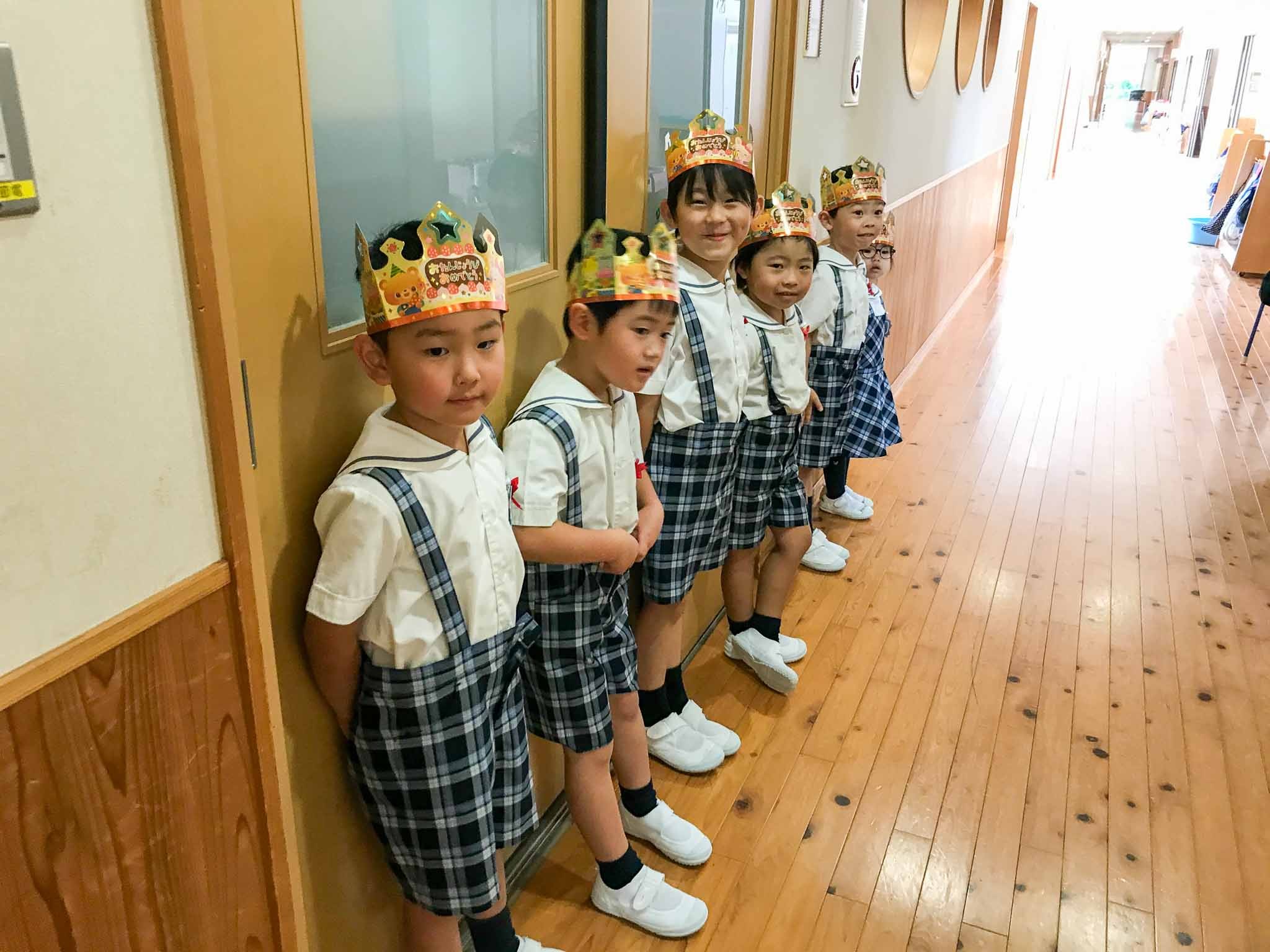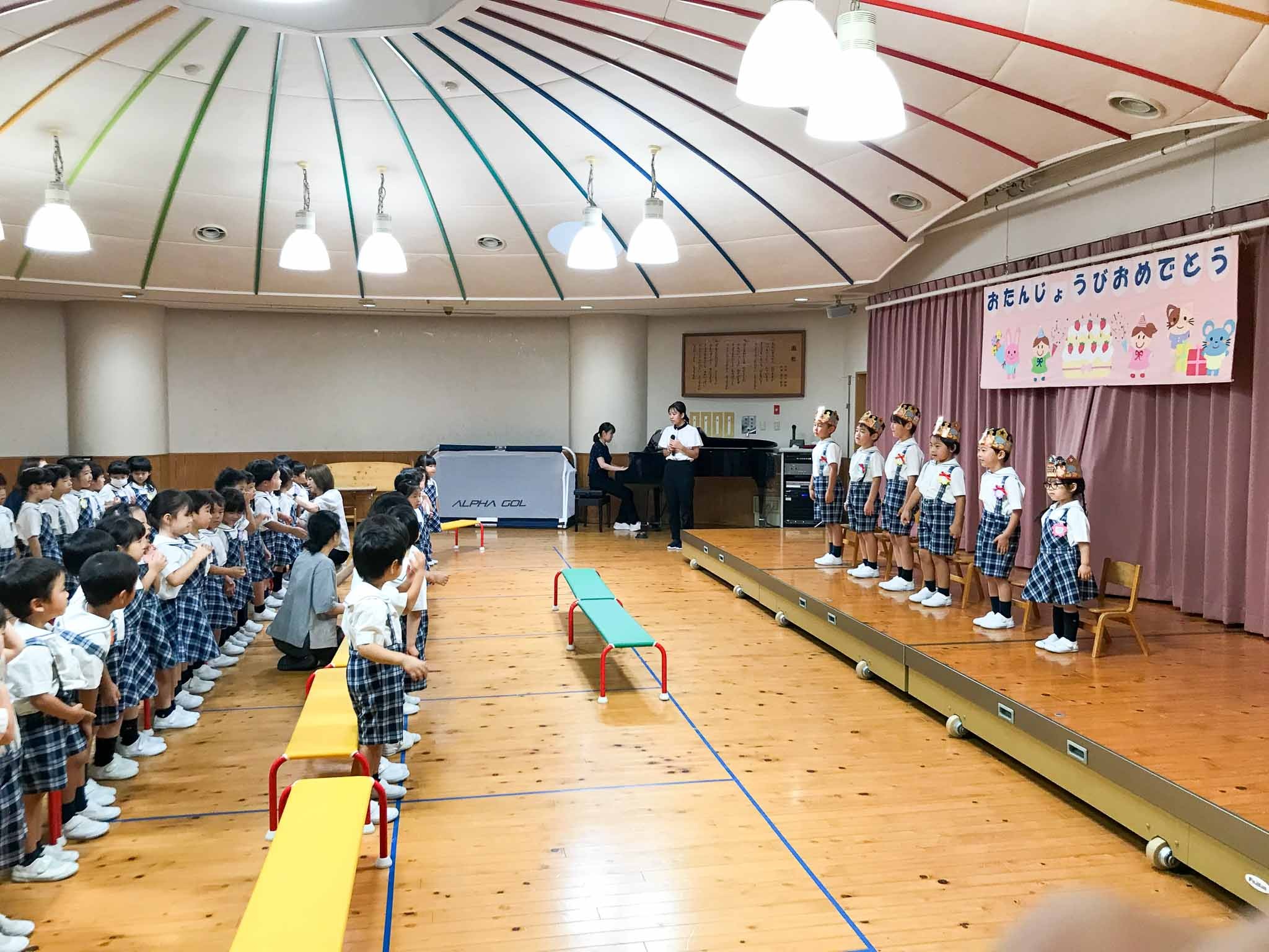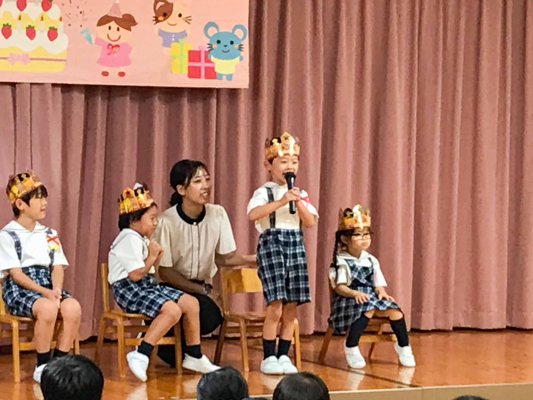 2学期最初となる9月お誕生日会を、17日(月)に遊戯室で行いました。お誕生日を祝ってもらう子どもたちが冠をつけて登場すると、大きな拍手が起こりました。
