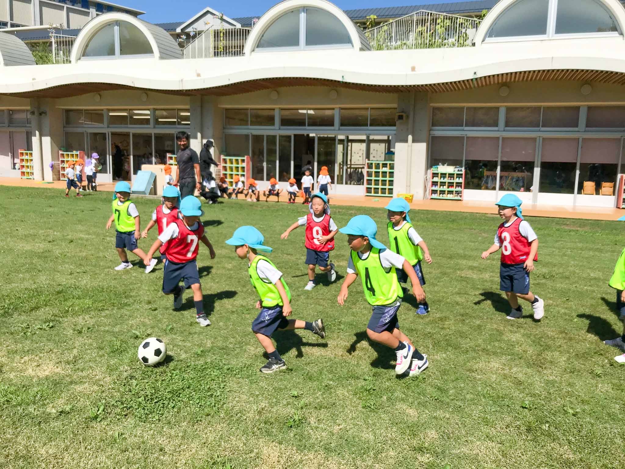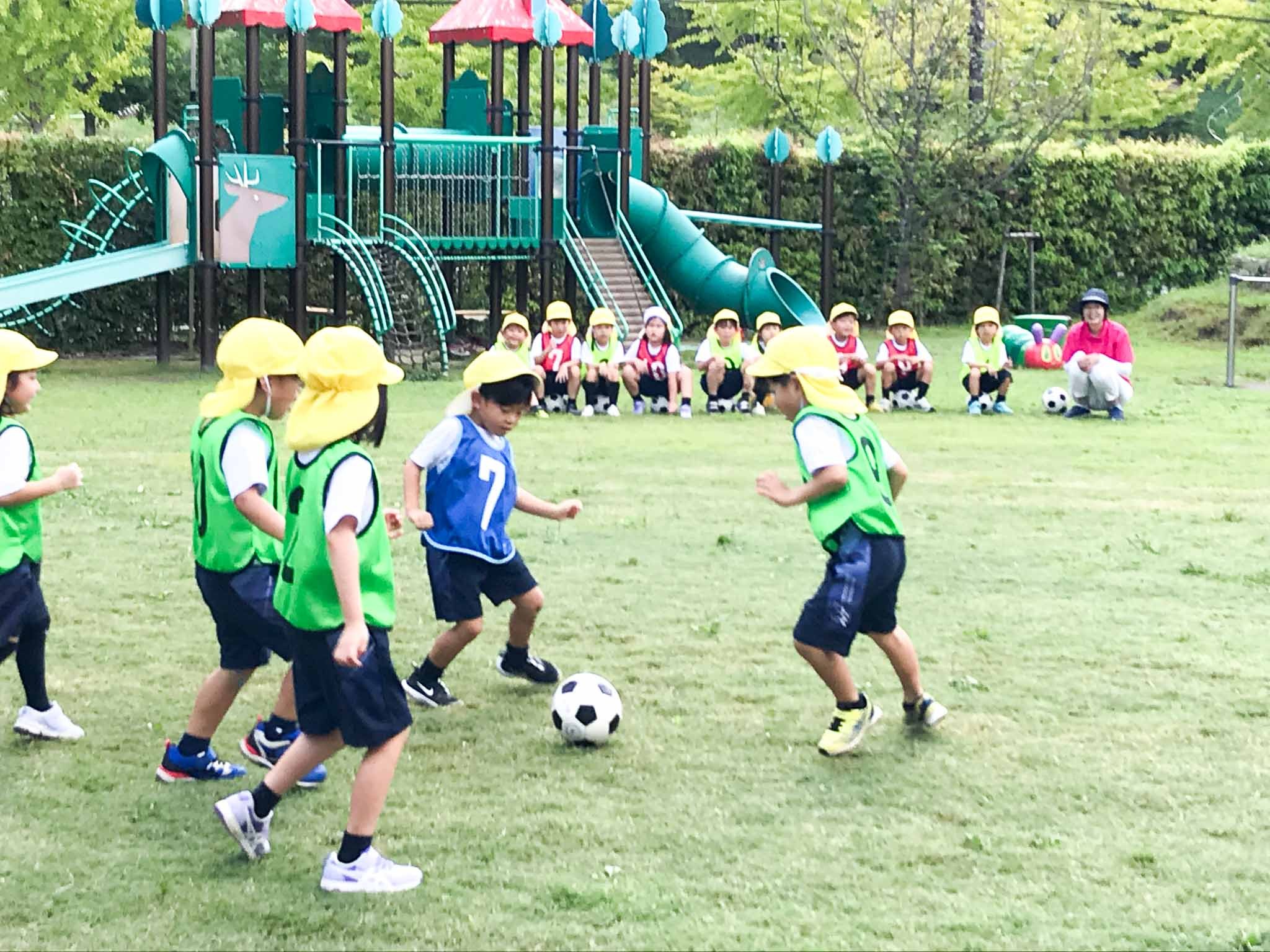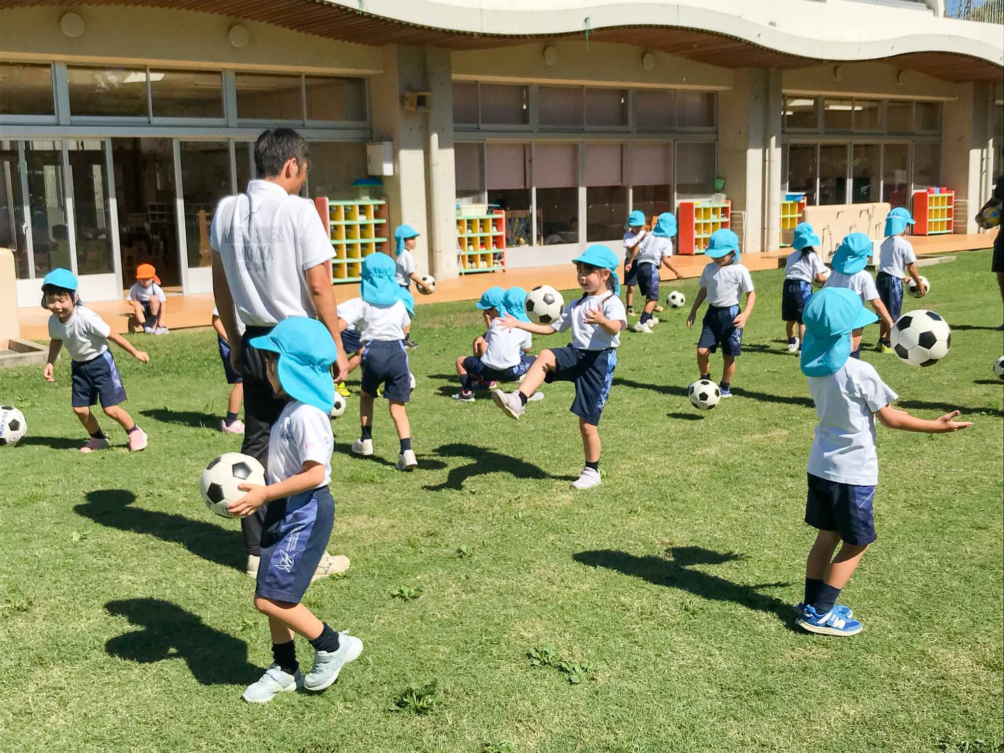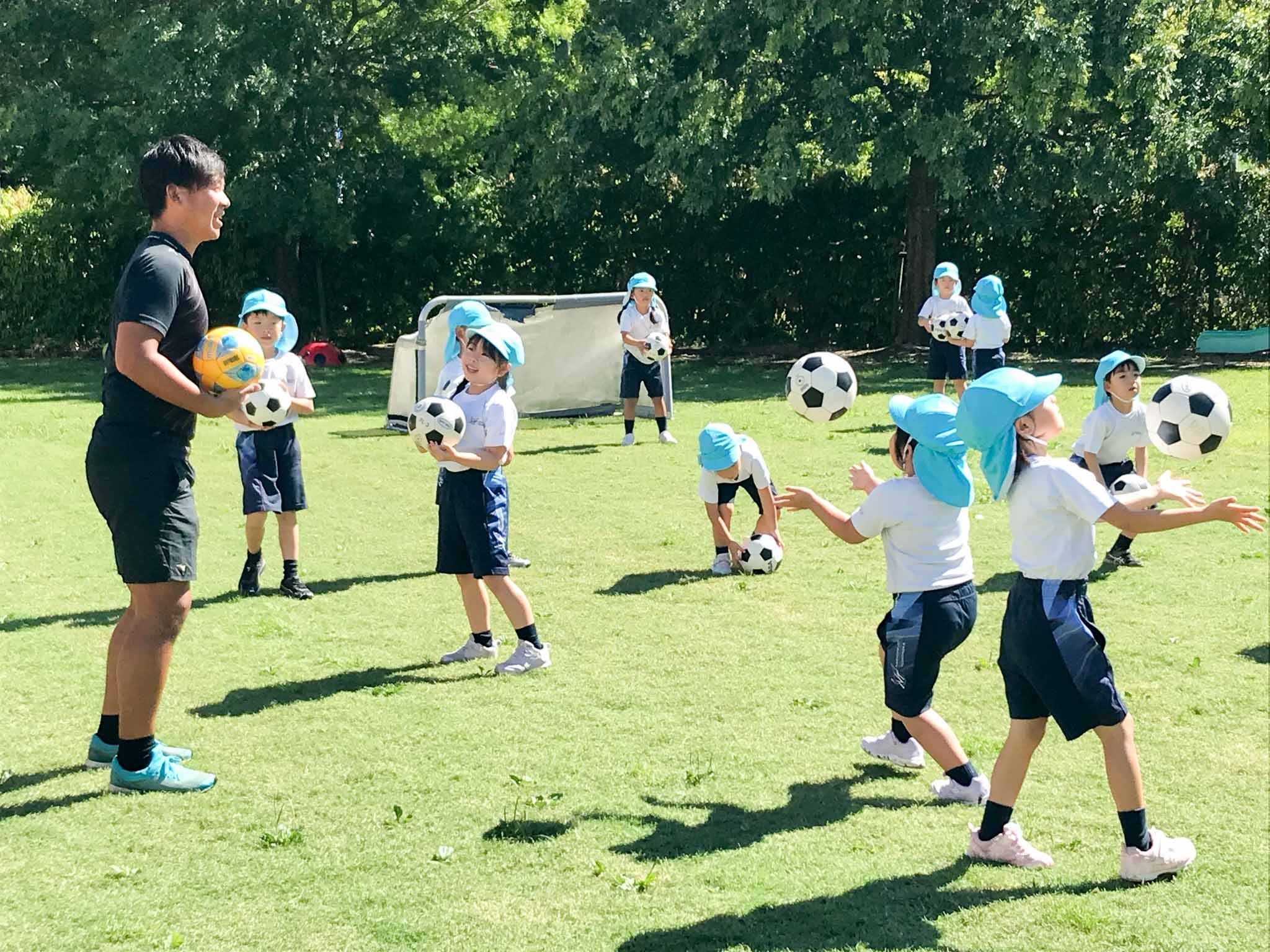 体育の先生と遊ぼう 2024.09.18(水) Tweet 9月11日(水)年長組の「体育の先生と遊ぼう」の時間がありました。朝から気温が高かったので、いつもより短い時間での実施となりました。 子どもたちは、指導してくださる大前先生が大好きです。園庭で先生の姿を見ると、みんなすぐに駆け寄ってきました。さっそく、サッカーボールを使った遊びが始まります。ボールをいろんな方法で投げたり、蹴ったりして十分体を動かしてから、最後はミニゲームを楽しみました。応援する子どもたちも、元気いっぱいです! « ザリガニ釣りに夢中 敬老の日の会 »