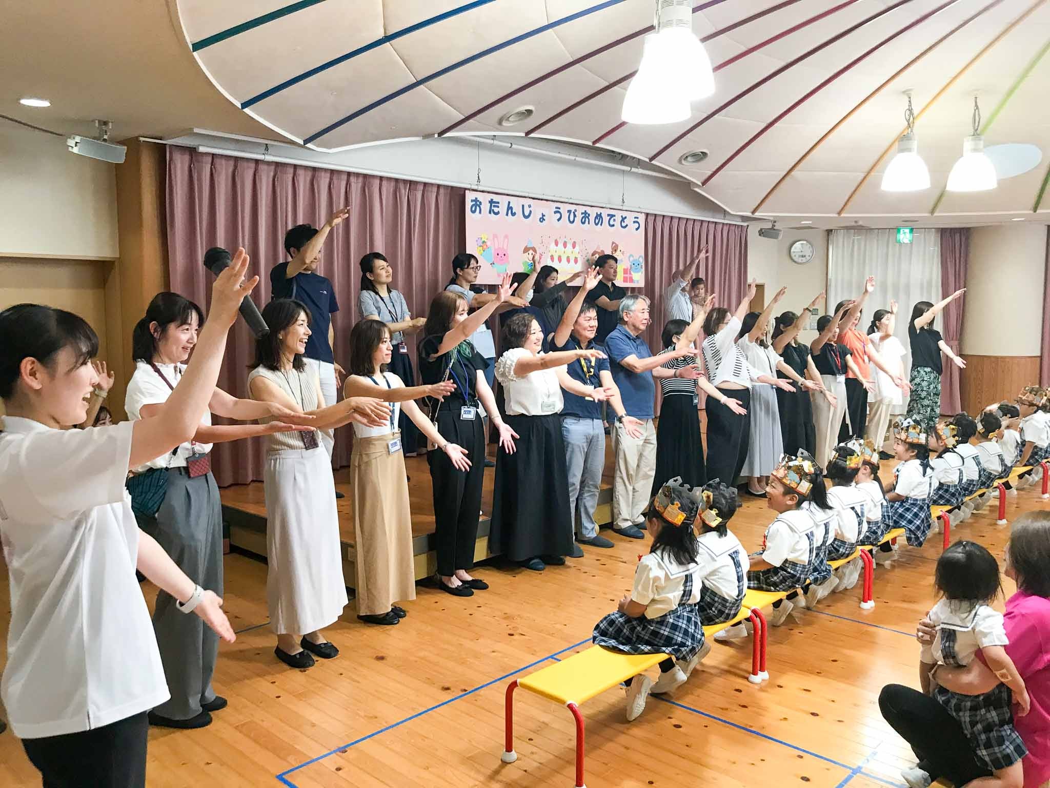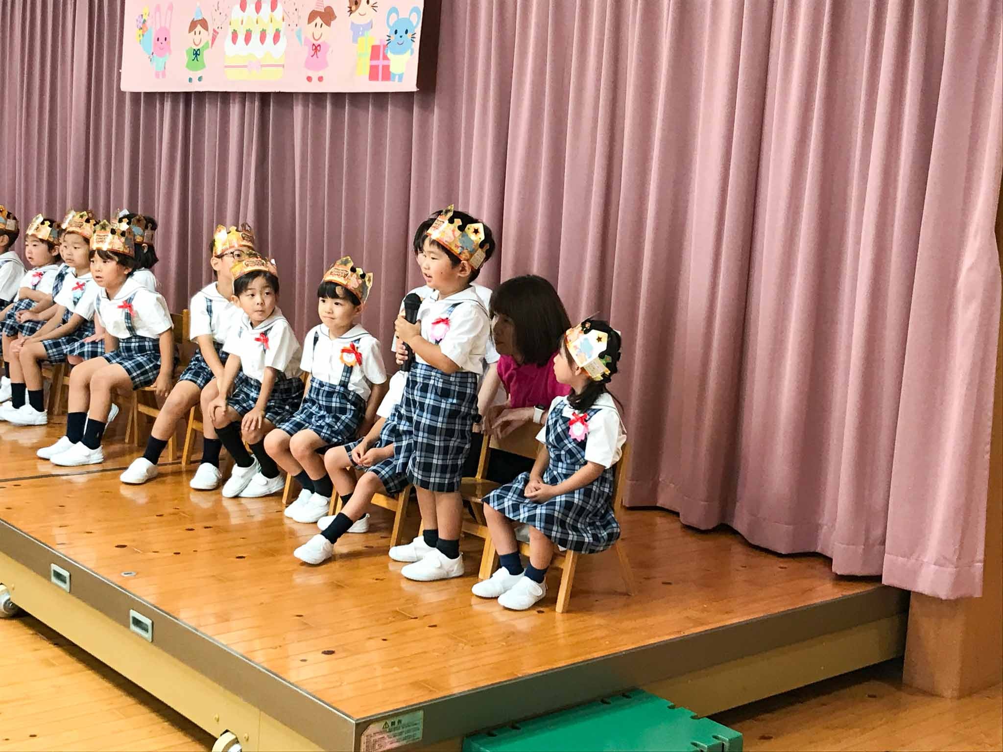 ひときわ人数の多い、7・8月生まれのお友達。「〇歳になりました」と一人ずつ自己紹介をしてくれました。「ハッピーバースデー」の歌をみんなで歌い、園長先生のあいさつの後には、「うきうきバースデイ」の歌で、みんなが「おめでとう!」の気持ちを伝えました。