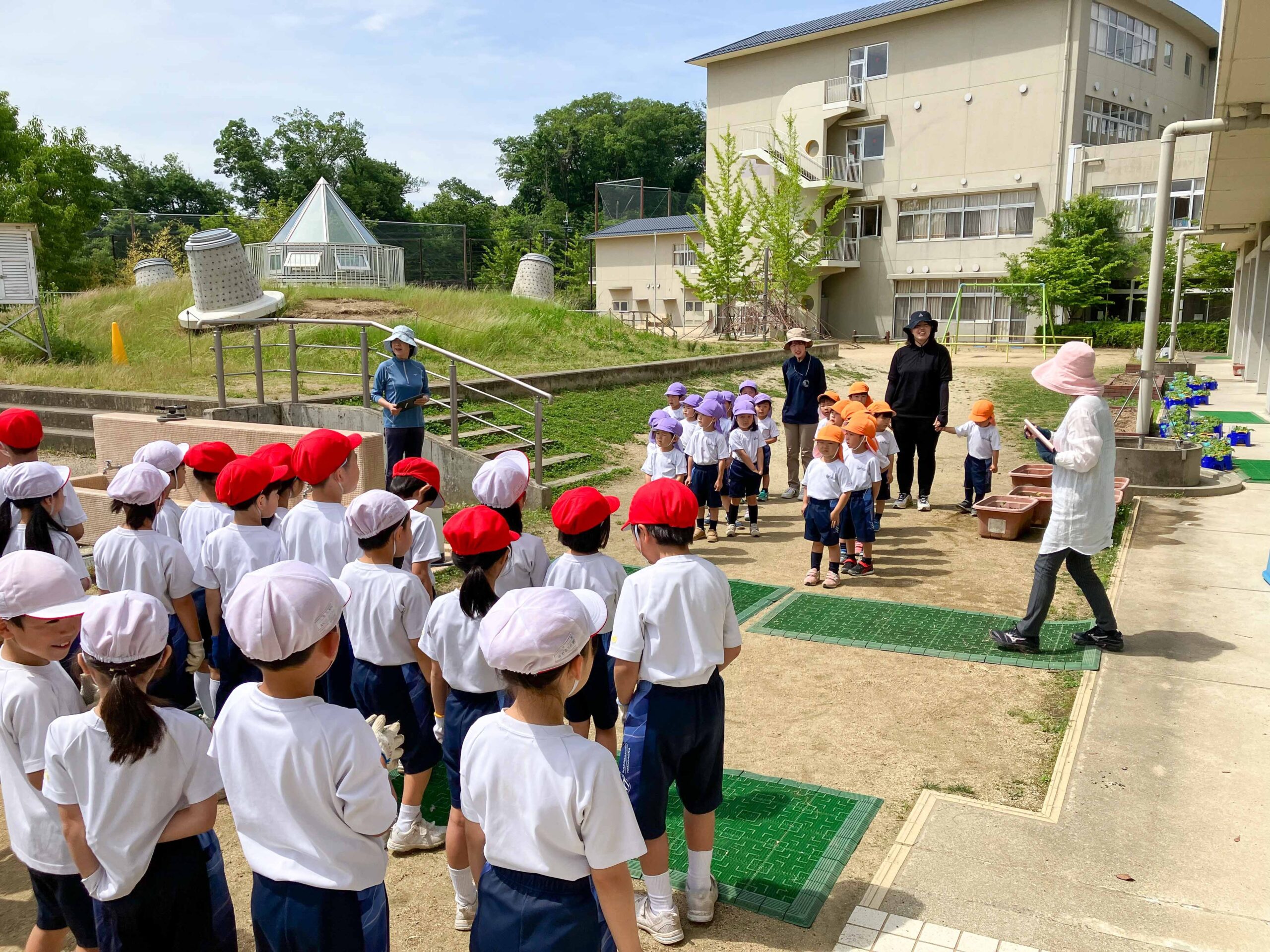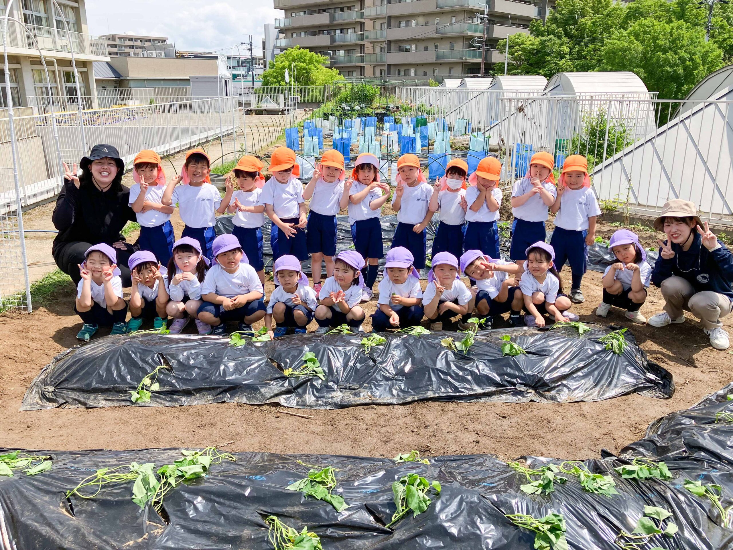 年中組がP2生とサツマイモの苗植え